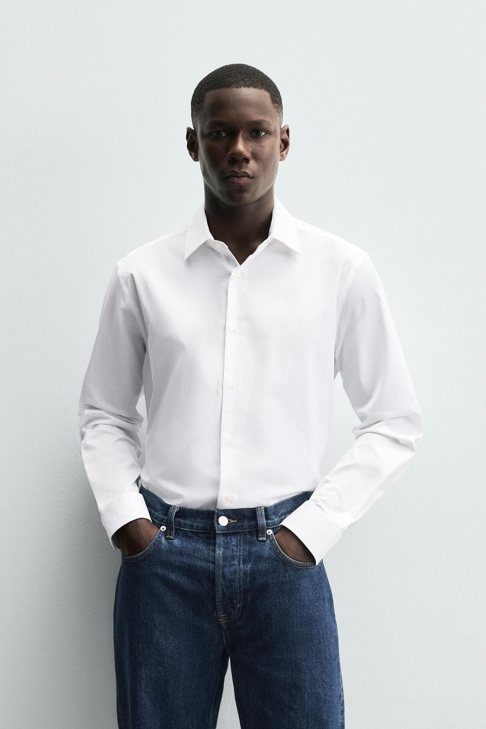Regular fit shirt. Italian collar and long sleeves finished in buttoned cuffs. Front button closure.
