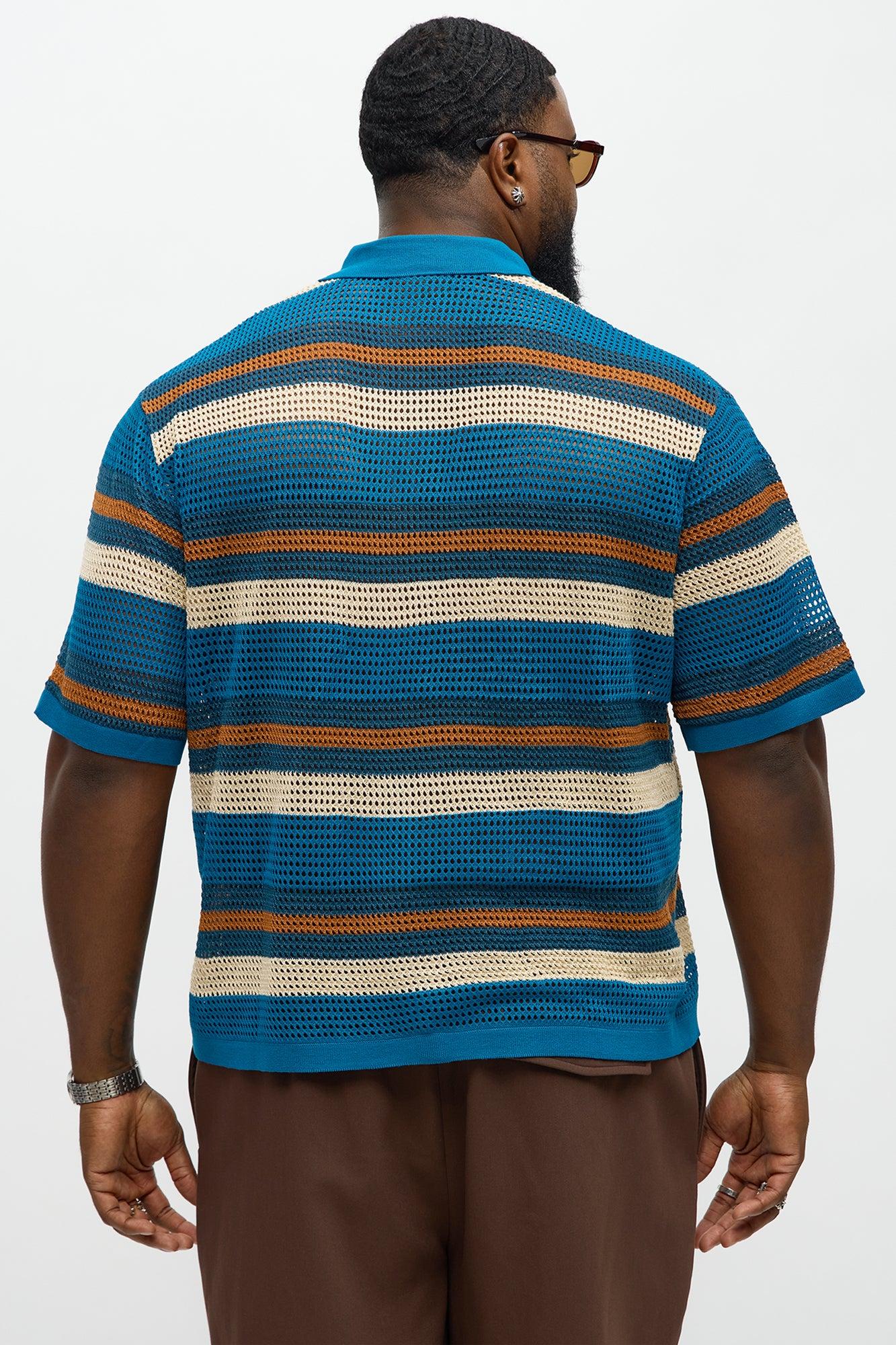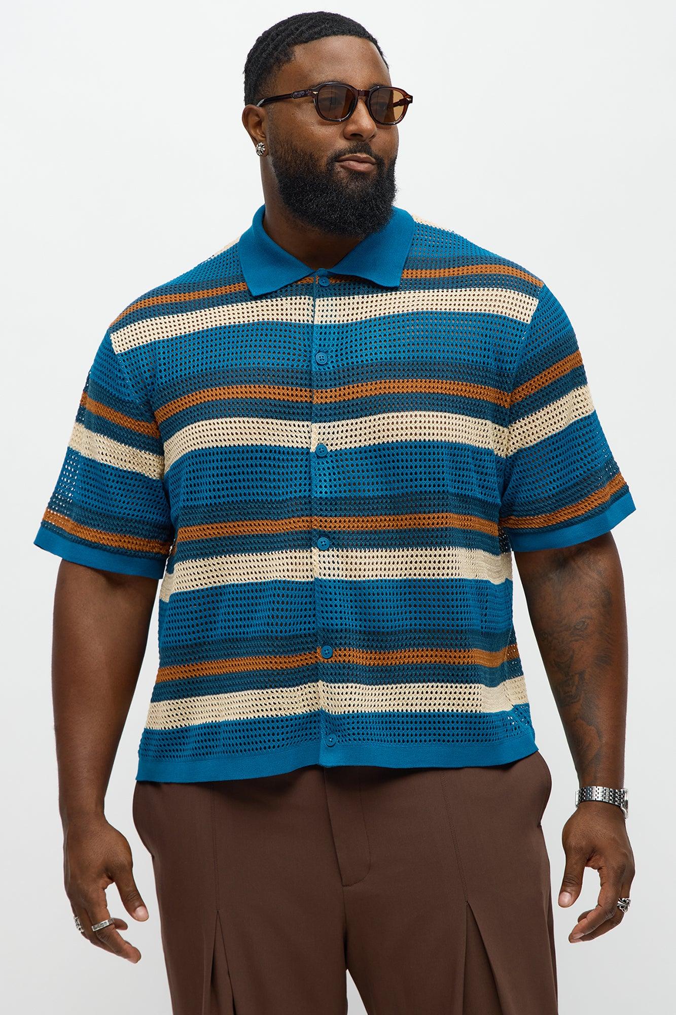 Regular Fit Striped Crochet Button Up Shirt - Blue Male