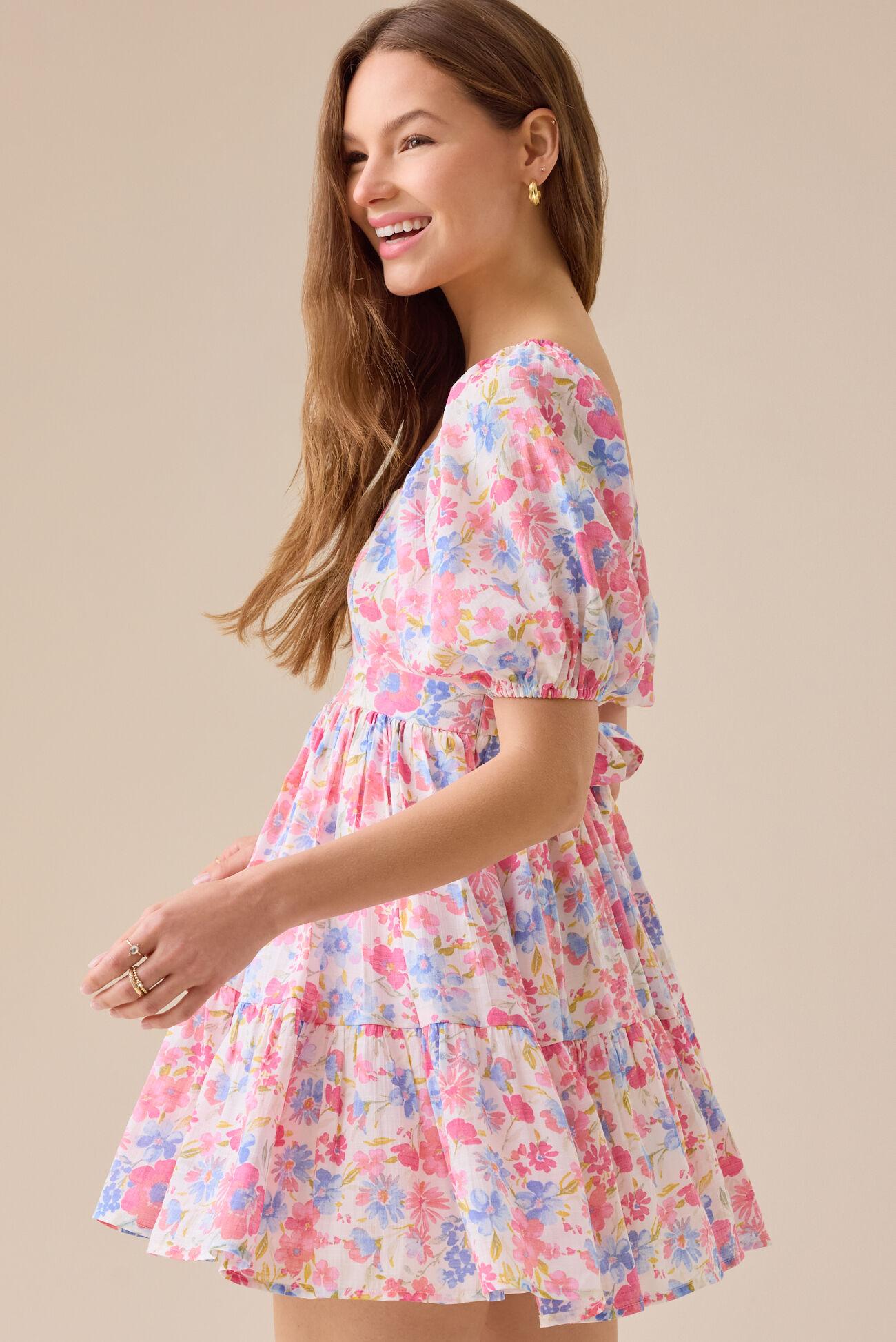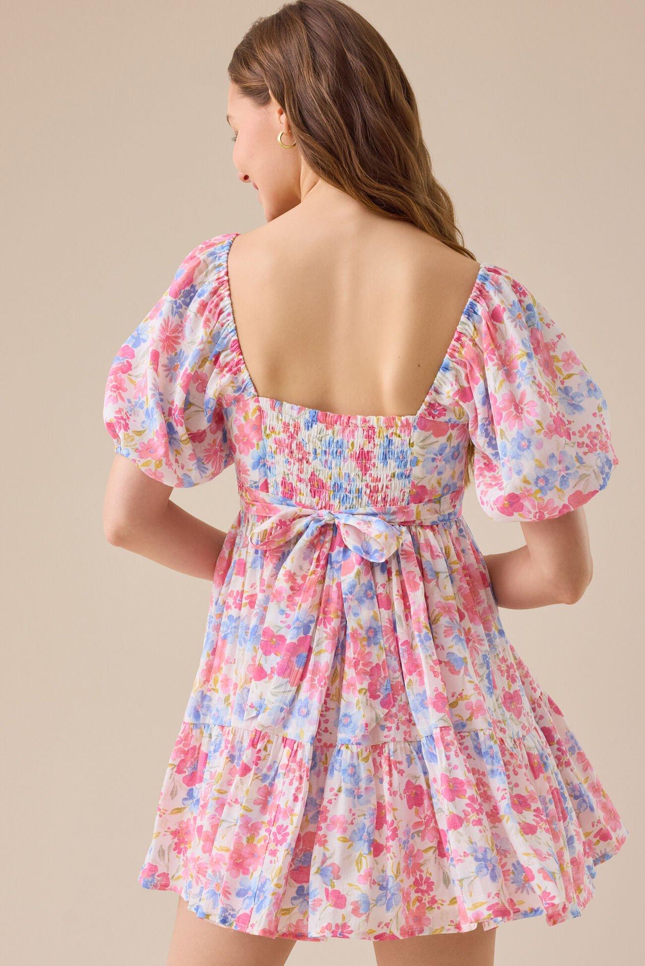 The Reilly Floral Mini Dress features a vibrant pink floral print, puff sleeves, and a flowy skirt for a feminine, airy look. With a delicate tie-back detail, this dress adds a charming touch, perfect for any casual outing or special occasion.