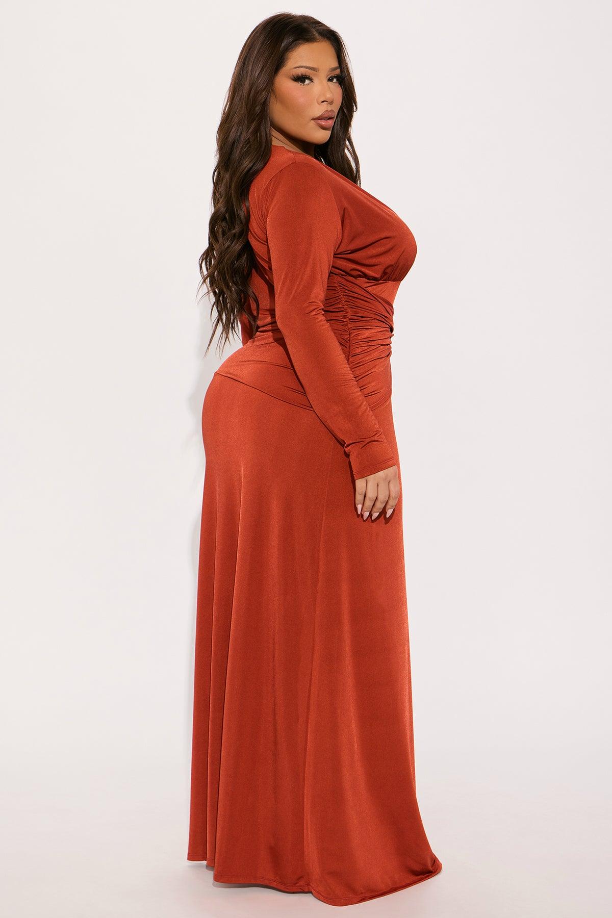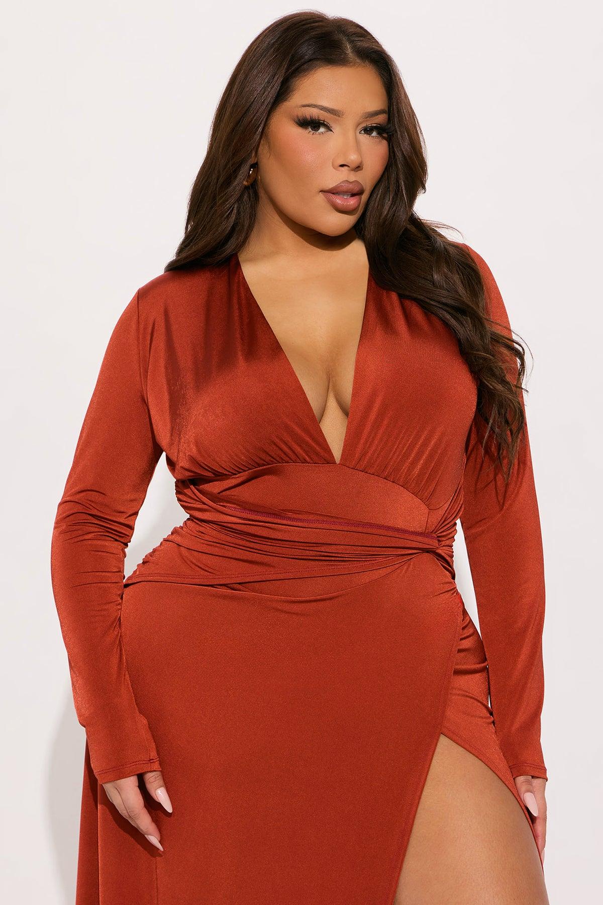 Available In Cognac. Maxi Dress Long SLeeves V-Neckline Twist Waist Detail High Slit Stretch 95% Polyester 5% Spandex Imported