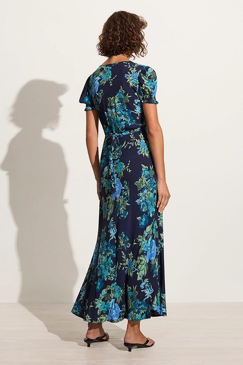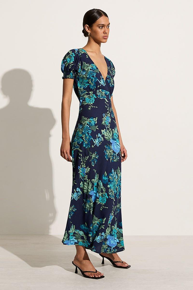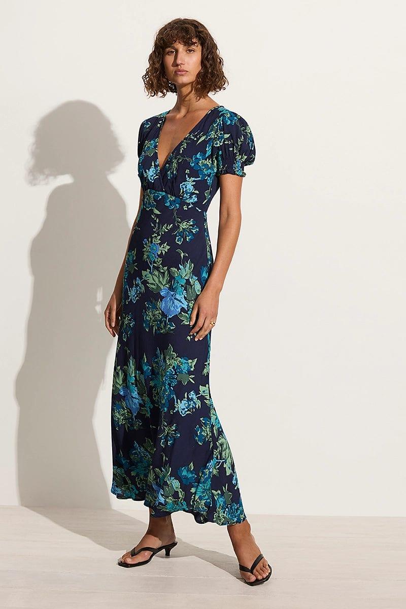 Arrive in style to your next occasion in the Reis Maxi Dress in Escala Navy Floral. A bias cut full length silhouette boasting short puff sleeves, cross over front bodice, fixed waist with tie and a bias cut skirt. Cut from lightweight rayon crepe and hand-printed with statement blue blooms for a feminine flair, the Reis is an elevated event or date wear style.
