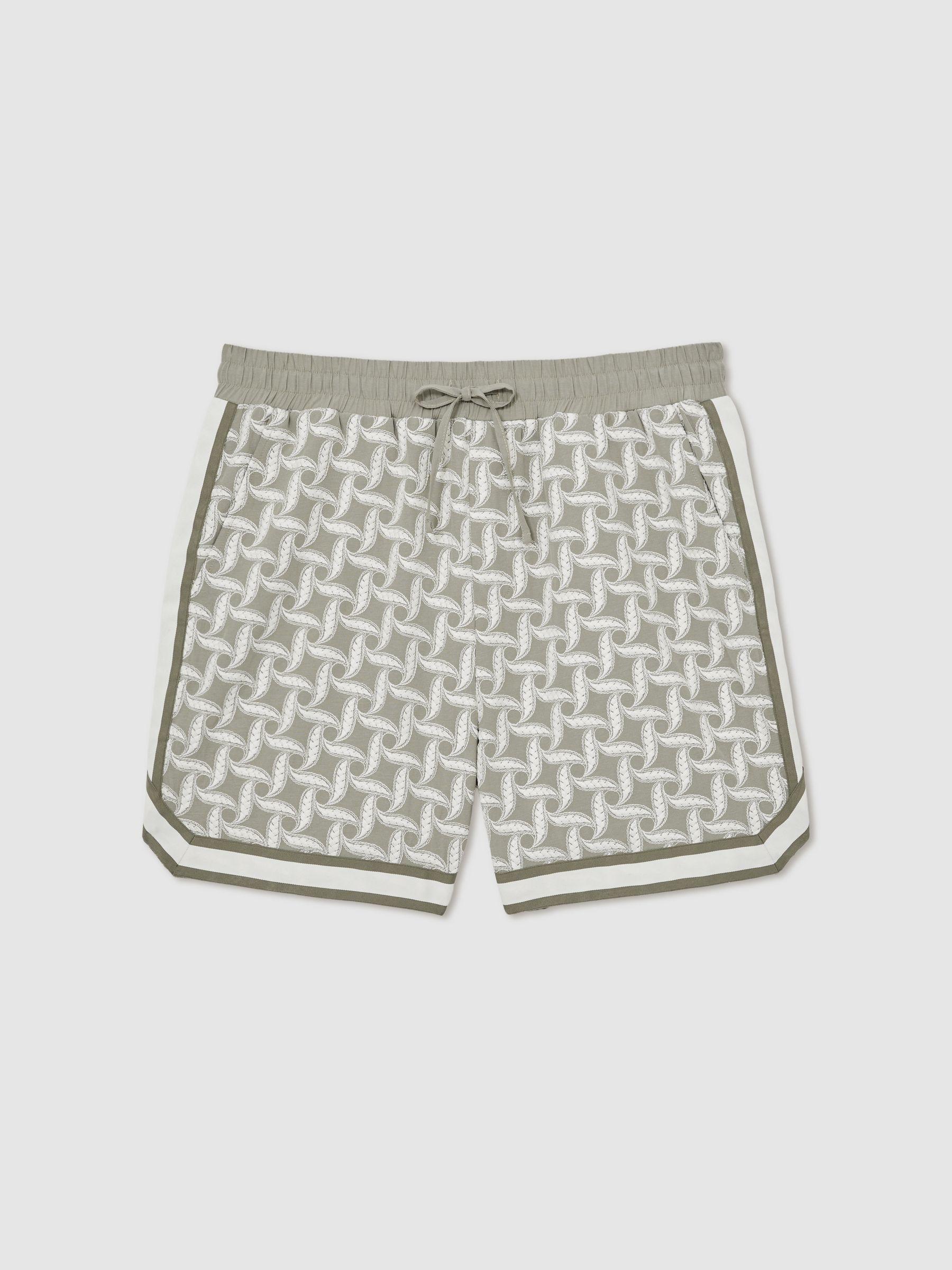 An intricately embroidered motif is repeated across the Forn shorts, adding artisanal texture to the design. A striped trim frames the edges for a refined finish, while an elasticated drawstring waist ensures an adjustable fit.