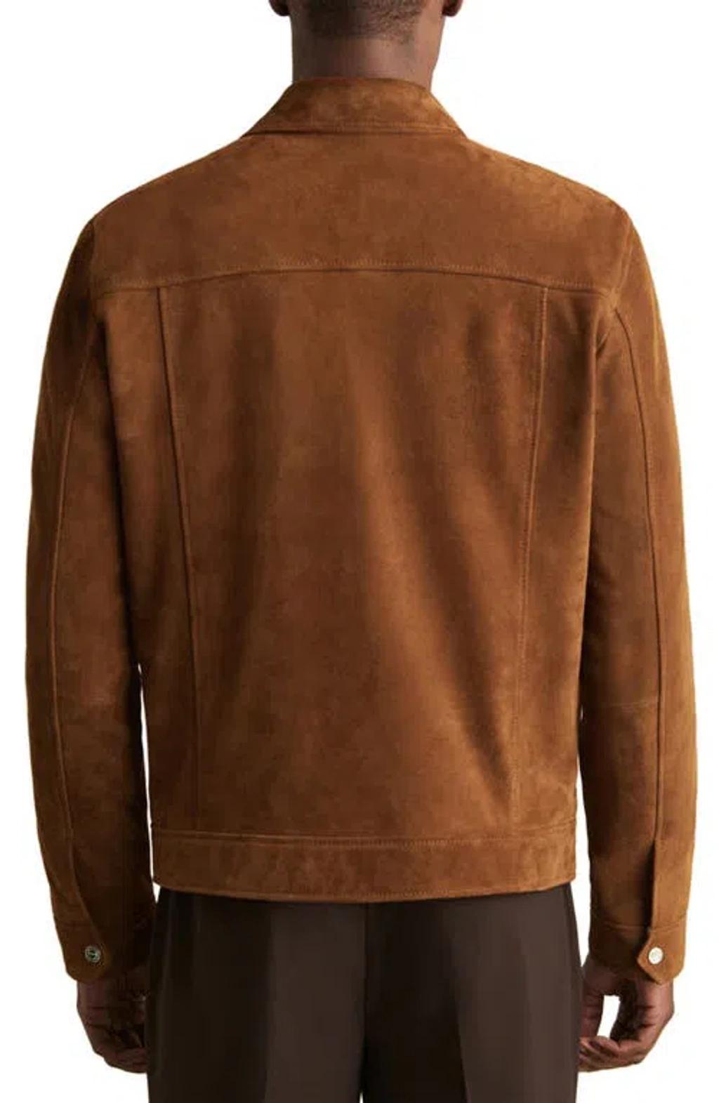 Shop Reiss Edington Suede Press Stud Trucket Jacket In Brown from 800+ stores, starting at $403. This goatskin suede layer is all about feel and function, rendered with a brushed finish that reads rich and designed in a relaxed fit that moves with you. Roomy patch pockets punctuate the front for a confident workwear note and everyday practicality. Wear it often and watch the patina grow. Front snap closure Spread collar snap cuffs Chest button-flap pockets; front welt pockets Leather Professional leather clean Imported