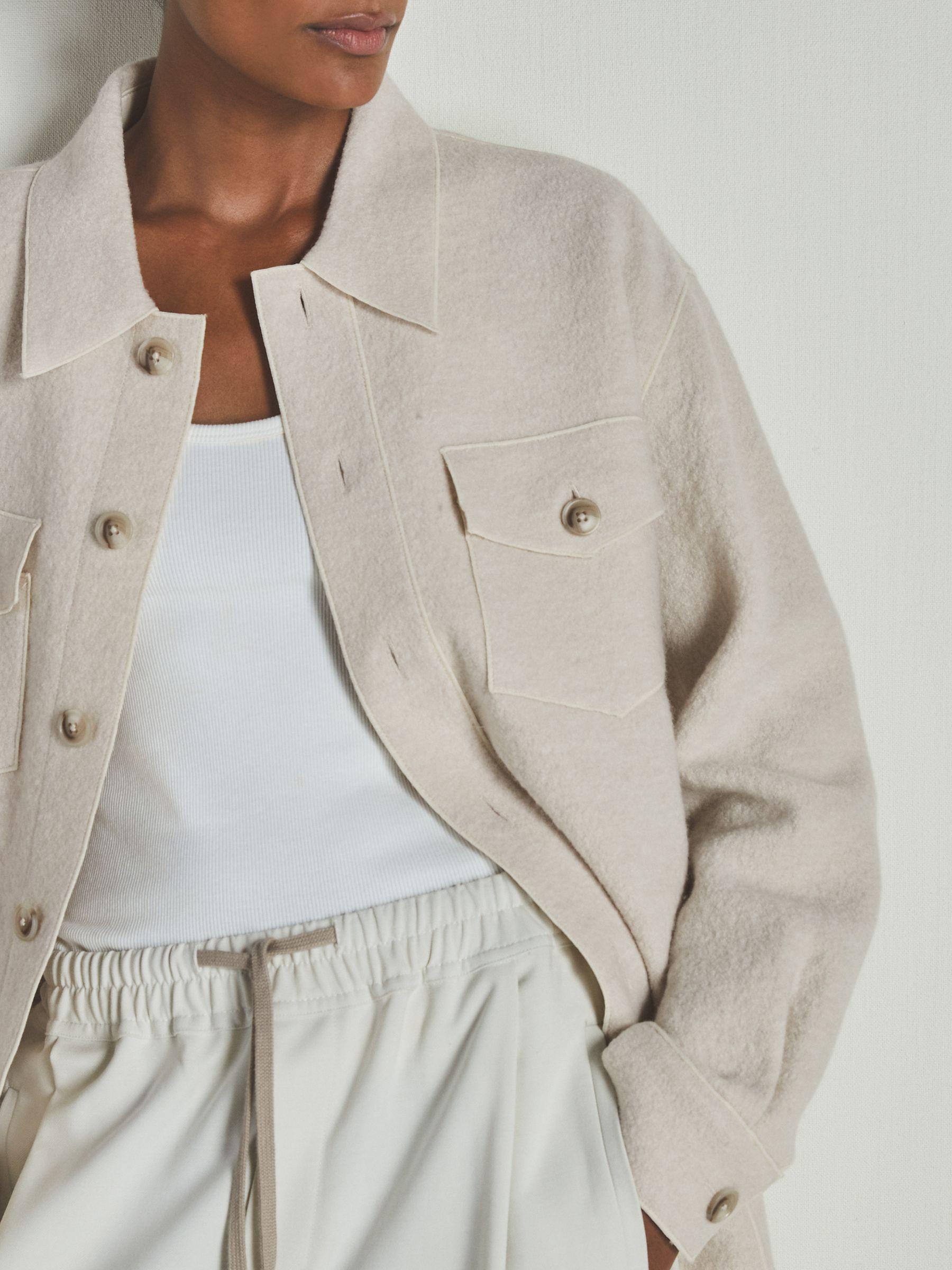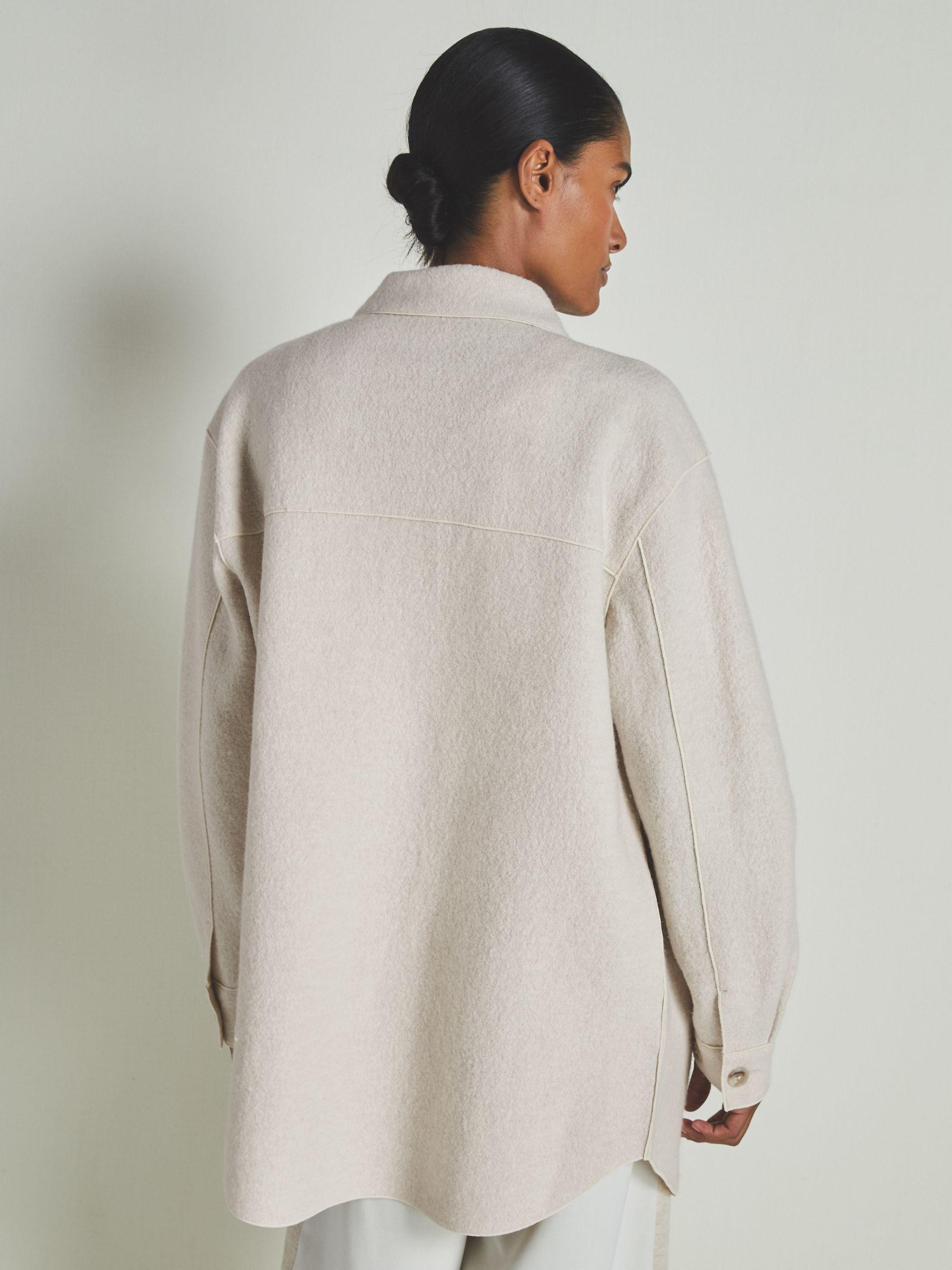 The contemporary oversized silhouette of the Dakota overshirt is accentuated with tonal piping throughout. Crafted from tactile boiled-wool bouclé, it’s patched with pockets, then accented with roomy inseam pockets and a curved hem. 100% wool Spread collar Patch pockets Inseam pockets Curved hem Relaxed fit Front buttons The Reiss | Les 100 Ciels collaboration puts contemporary refinement at its heart. Crafted with exquisite cashmere as its cornerstone, the considered selection of versatile staples is the ideal complement to your regular Reiss wardrobe. Measurements of model: Height 5'10" / 177.8cm. The model is wearing a size S.