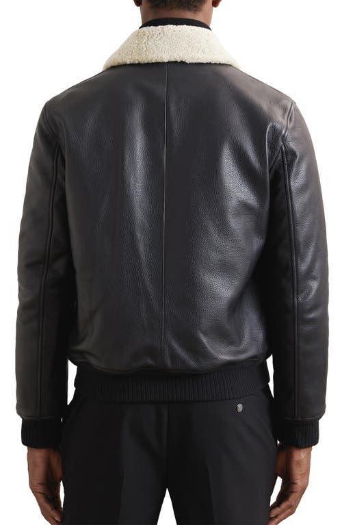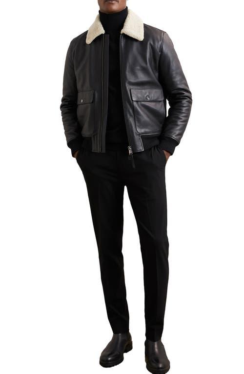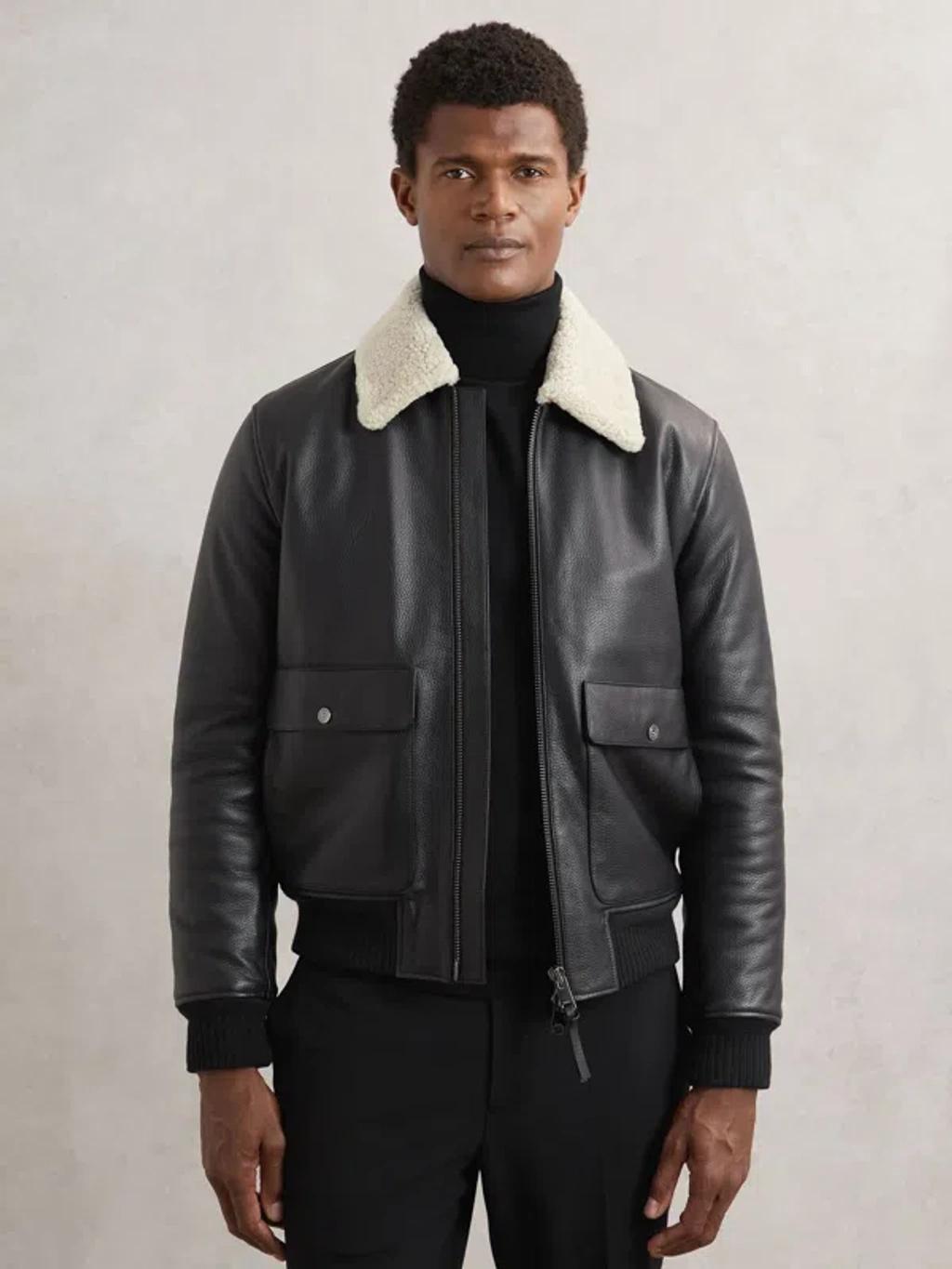 Shop Reiss Shaker Shearling Collar Leather Bomber Jacket In Black from 800+ stores, starting at $733. The classic aviator jacket takes flight once more in richly grained leather and upgraded to first class with a plush genuine shearling collar, quilted lining and comfortable stretch-cotton-blend ribbed trim. Two-way front-zip closure Point collar Front snap-flap patch pockets Ribbed cuffs and hem Quilted lining Leather, with genuine shearling (Turkey) collar and 86% cotton, 11% polyester, 3% elastane Professional leather clean Made in Turkey