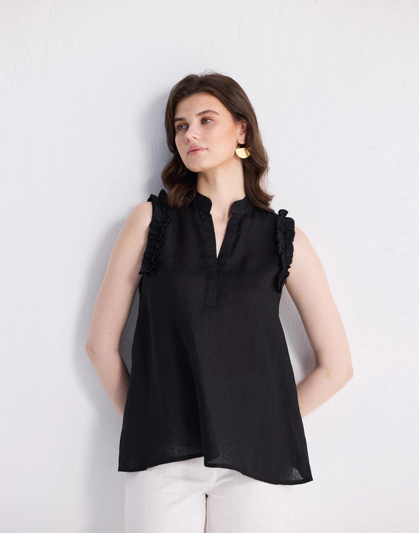 With its stylish Mandarin V-neck collar, this versatile ruffle sleeveless top is made from comfortable & eco-friendly hemp fabric and has the perfect flirty and flattering fit!