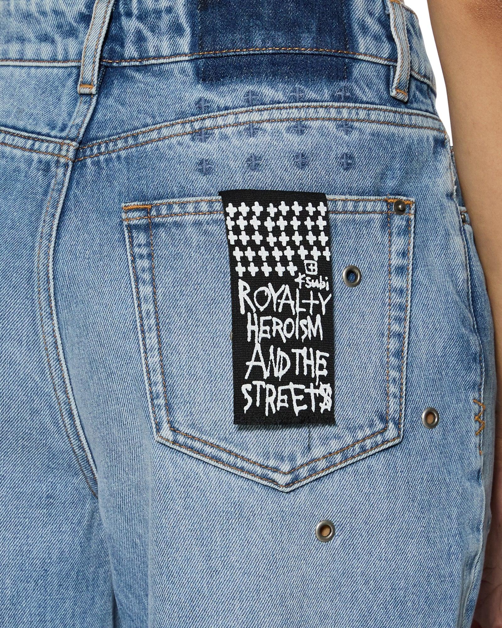 The Relax Jean Chroma is a mid-rise straight leg jean with an asymmetric fly front detail and full length. Made from European rigid denim in a mid-blue with subtle sanding, it features silver eyelet detail all over, classic five-pocket styling, Ksubi branded hardware, T-box and 3x4 embroidery, and a removable pocket tag on the wearer's right back pocket.