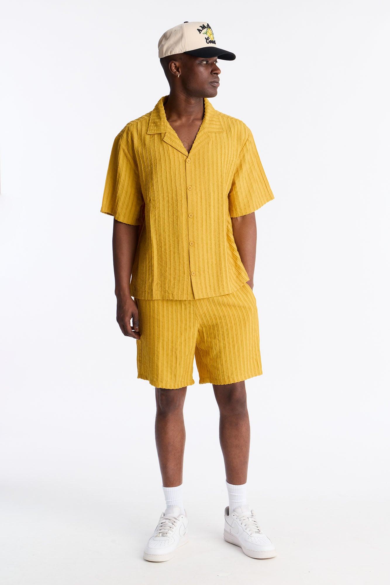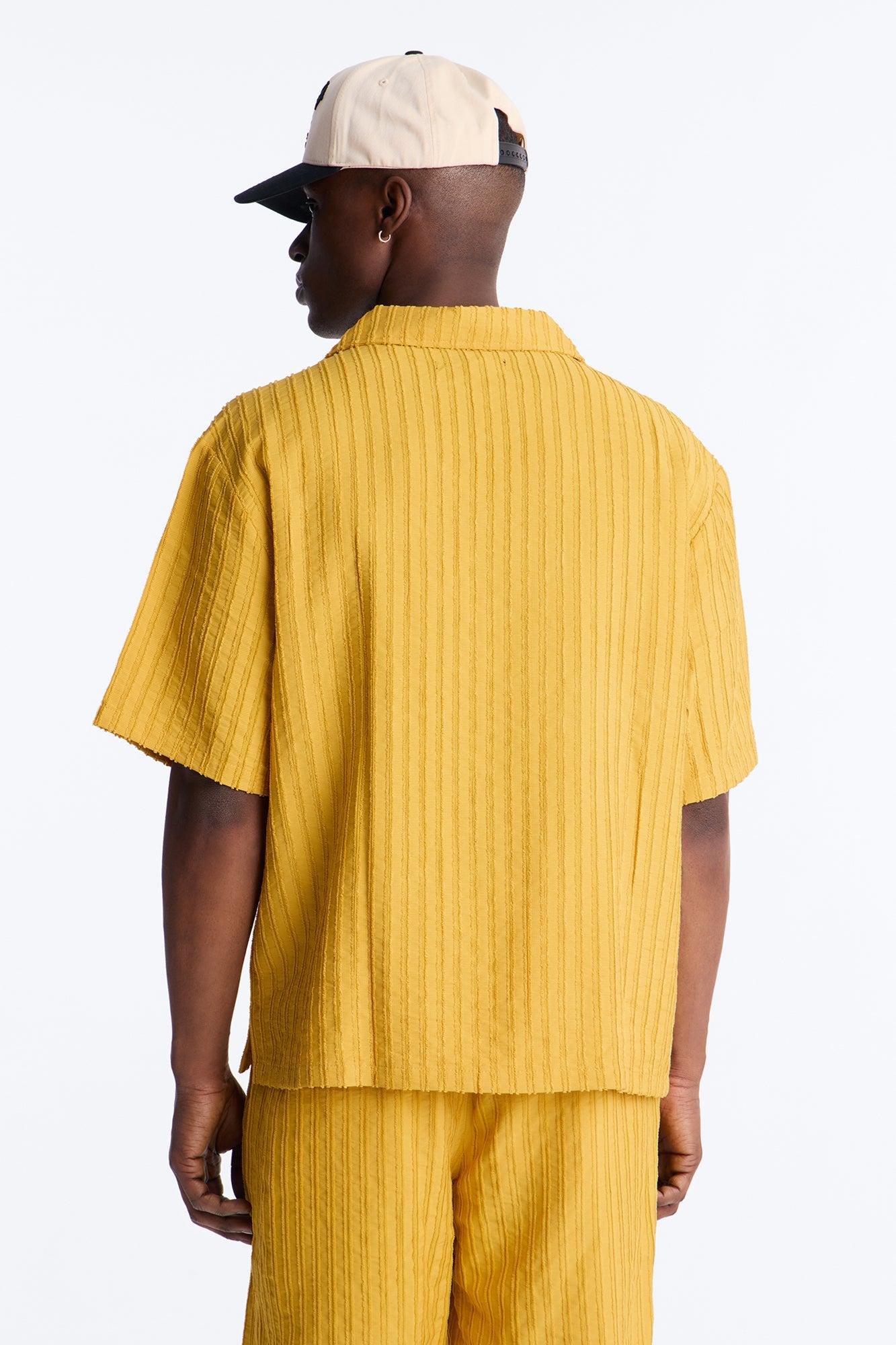 Available In Mustard. Relaxed Fit Stripes Textured Fold Down Collar Cuban Collar Front Button Closure Pleated Detail Short Sleeve Pair With "Relaxed Aegean Pleat Short" Pair With "Straight Flared Aegean Pleat Pant" Self: 45% Rayon 40% Polyester 15% Nylon Imported