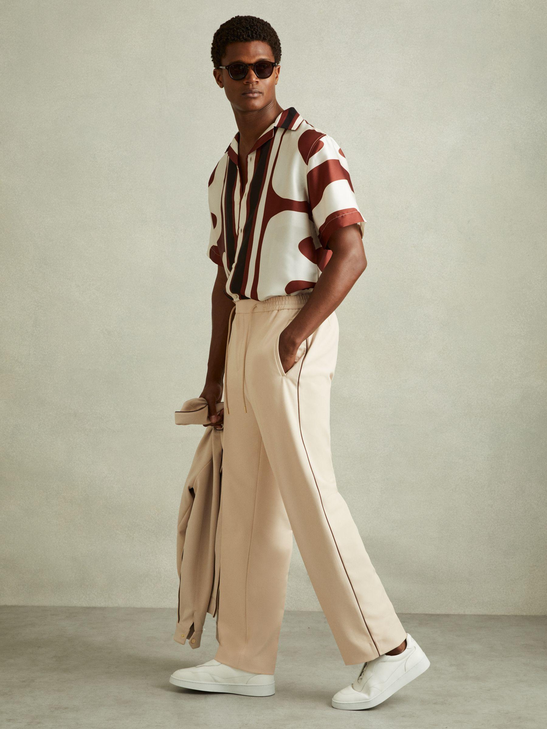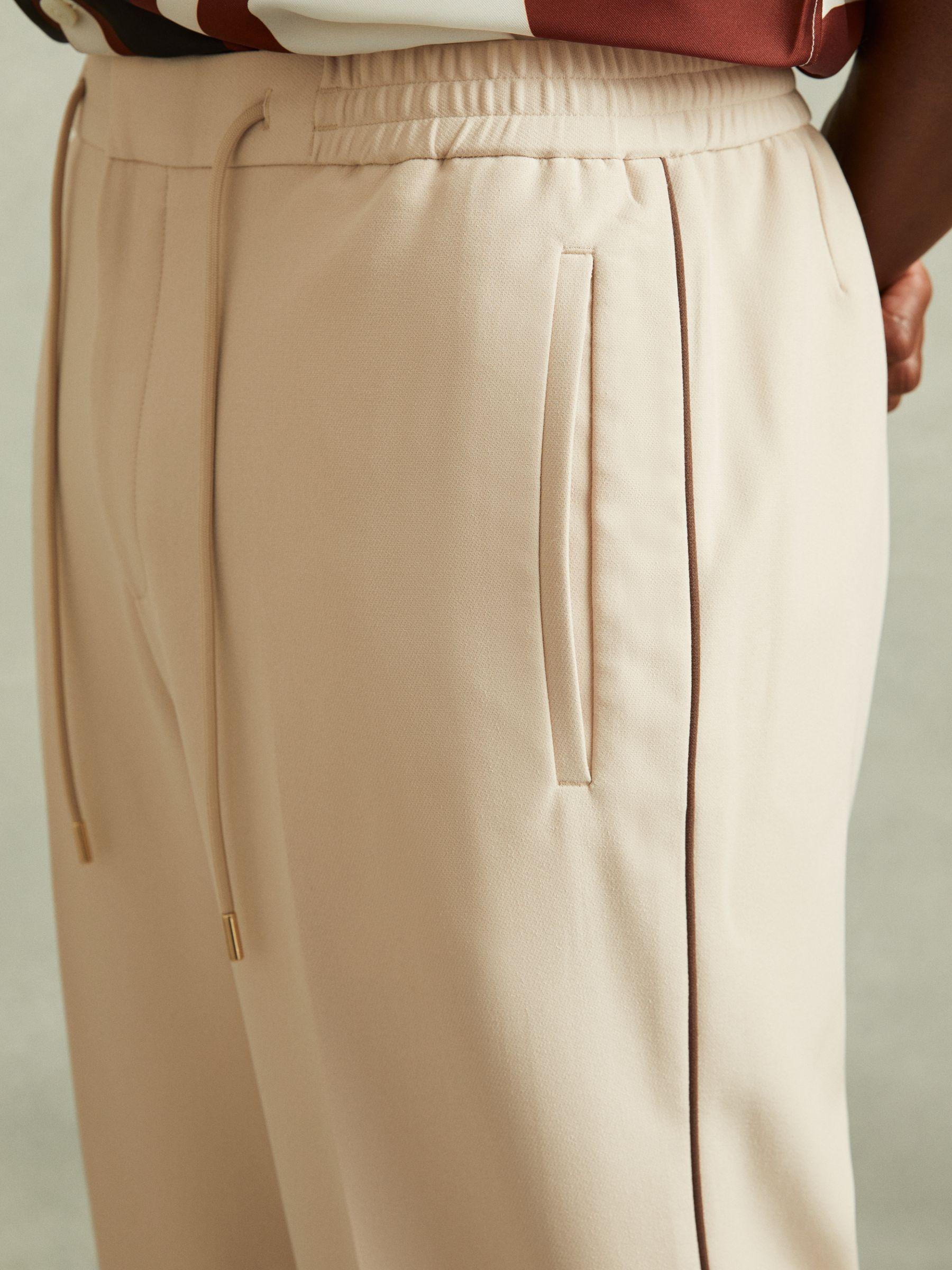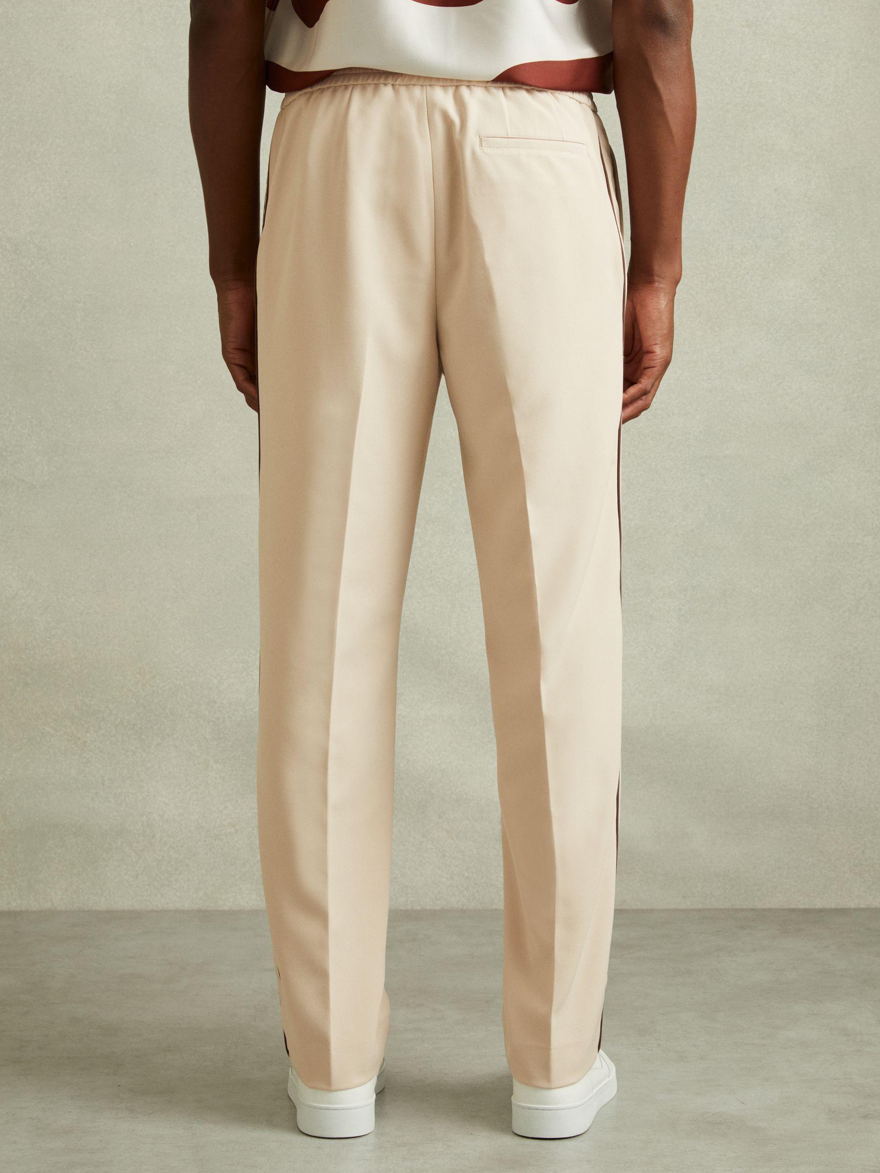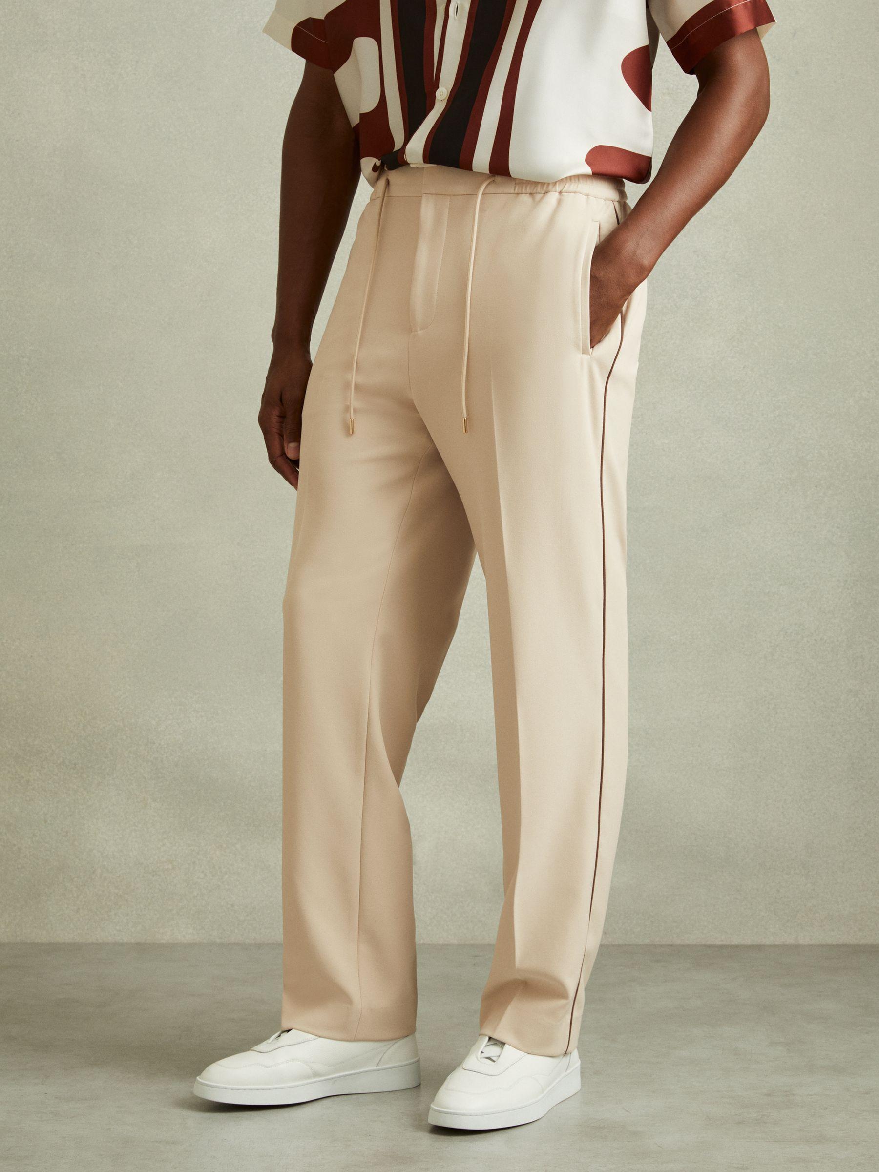 The Roy trousers are made from a soft, stretchy fabric and tailored with contrast pipe detailing to the sides, offering a casual look and feel. Matching jacket. Relaxed fit. Elasticated drawstring waistband. Contrast pipe detailing. Straight leg. The model is wearing a size 32. Measurements of model: Height 6ft 2.5" / 189cm.