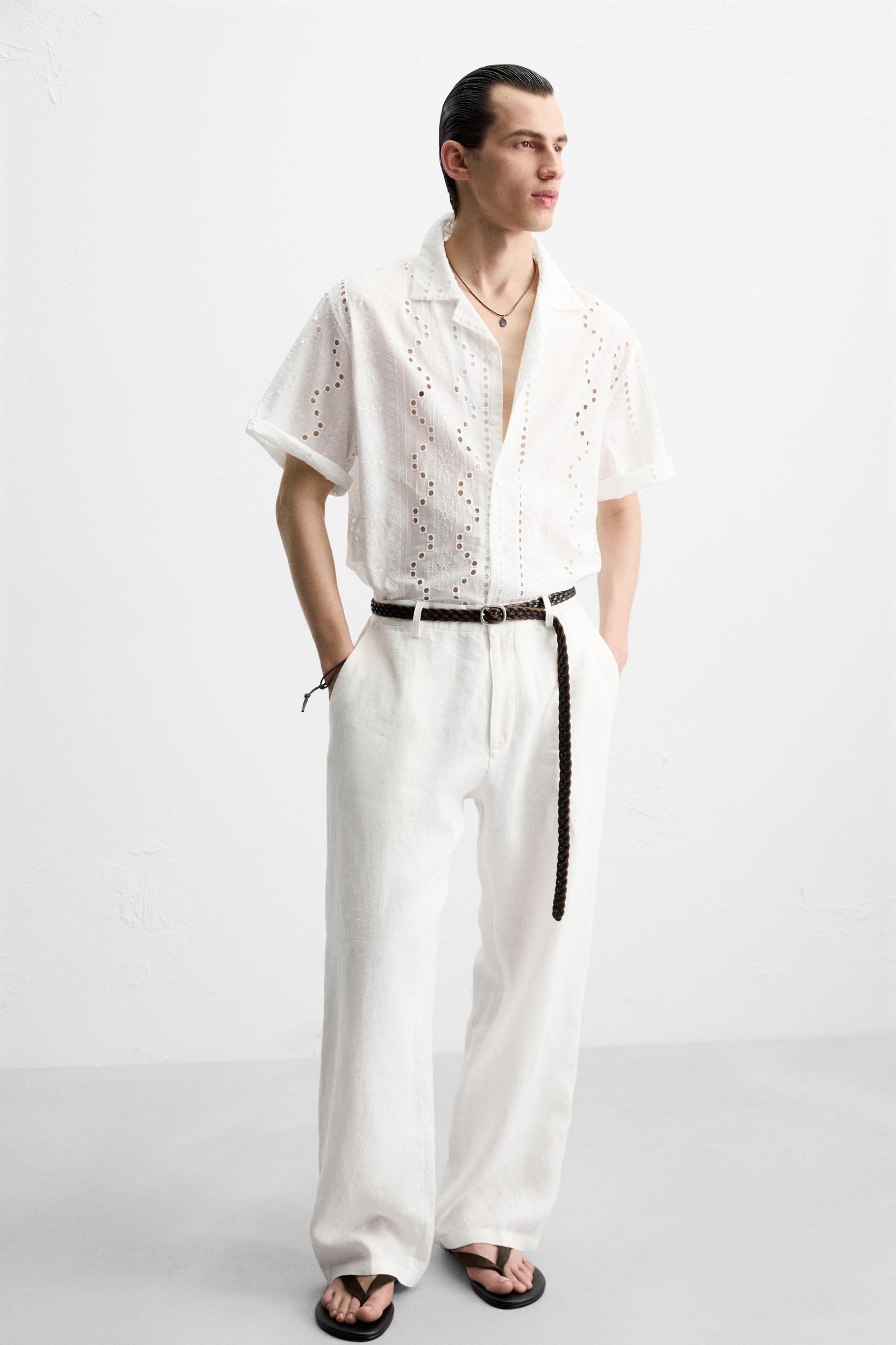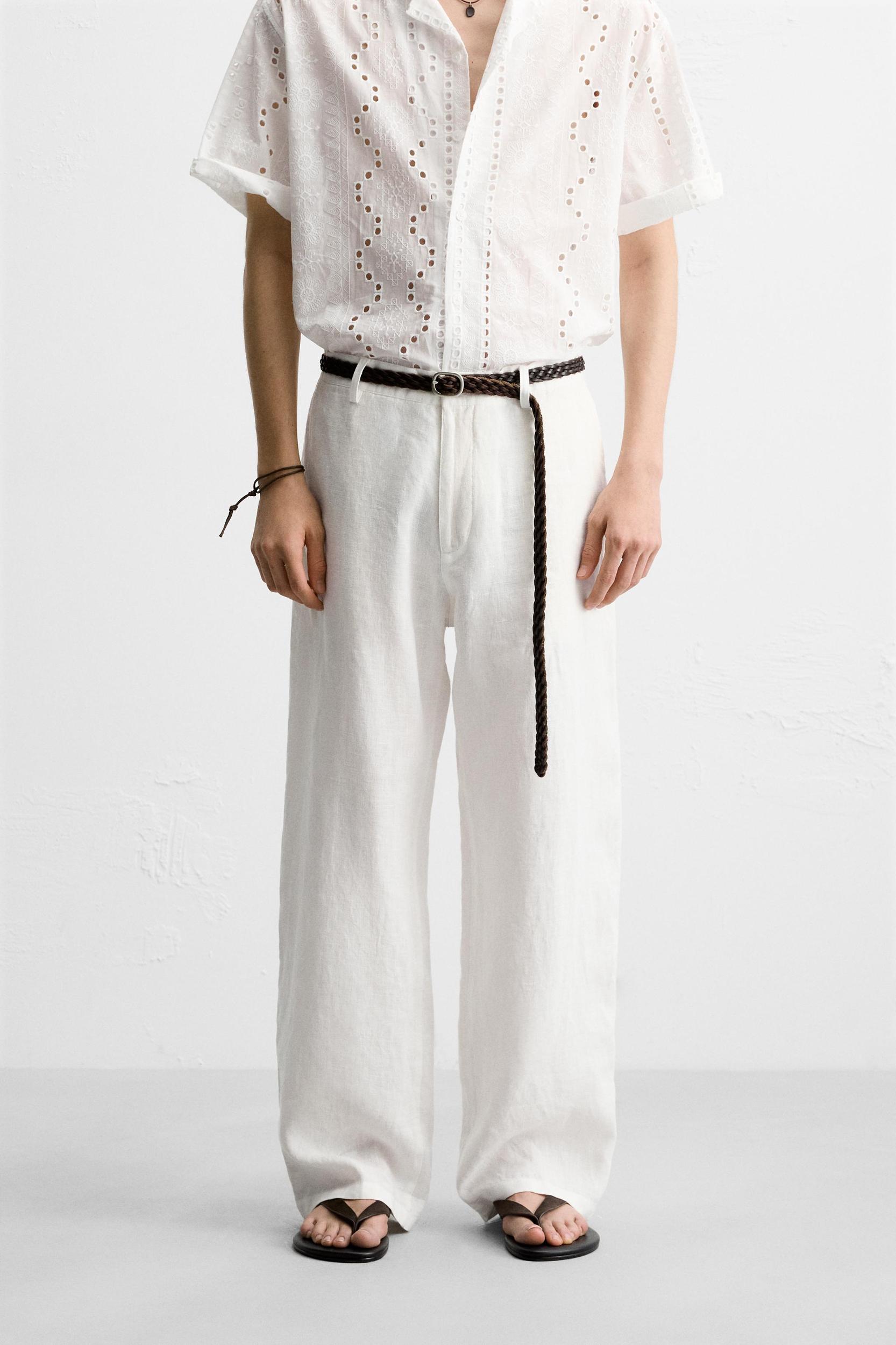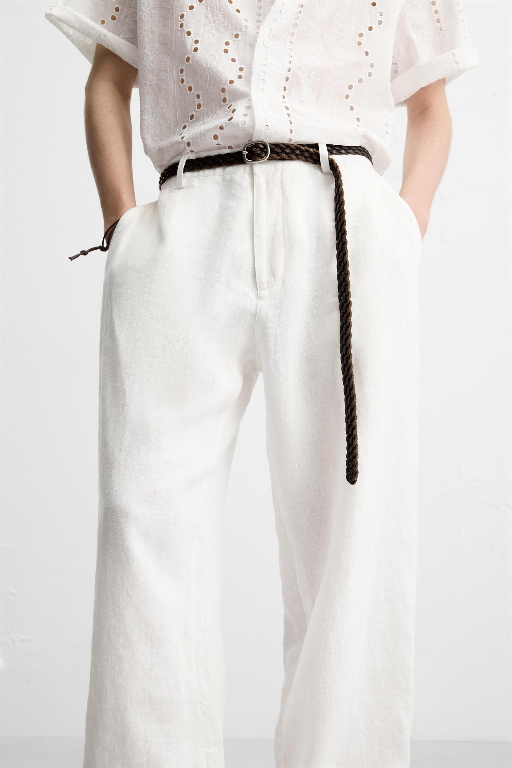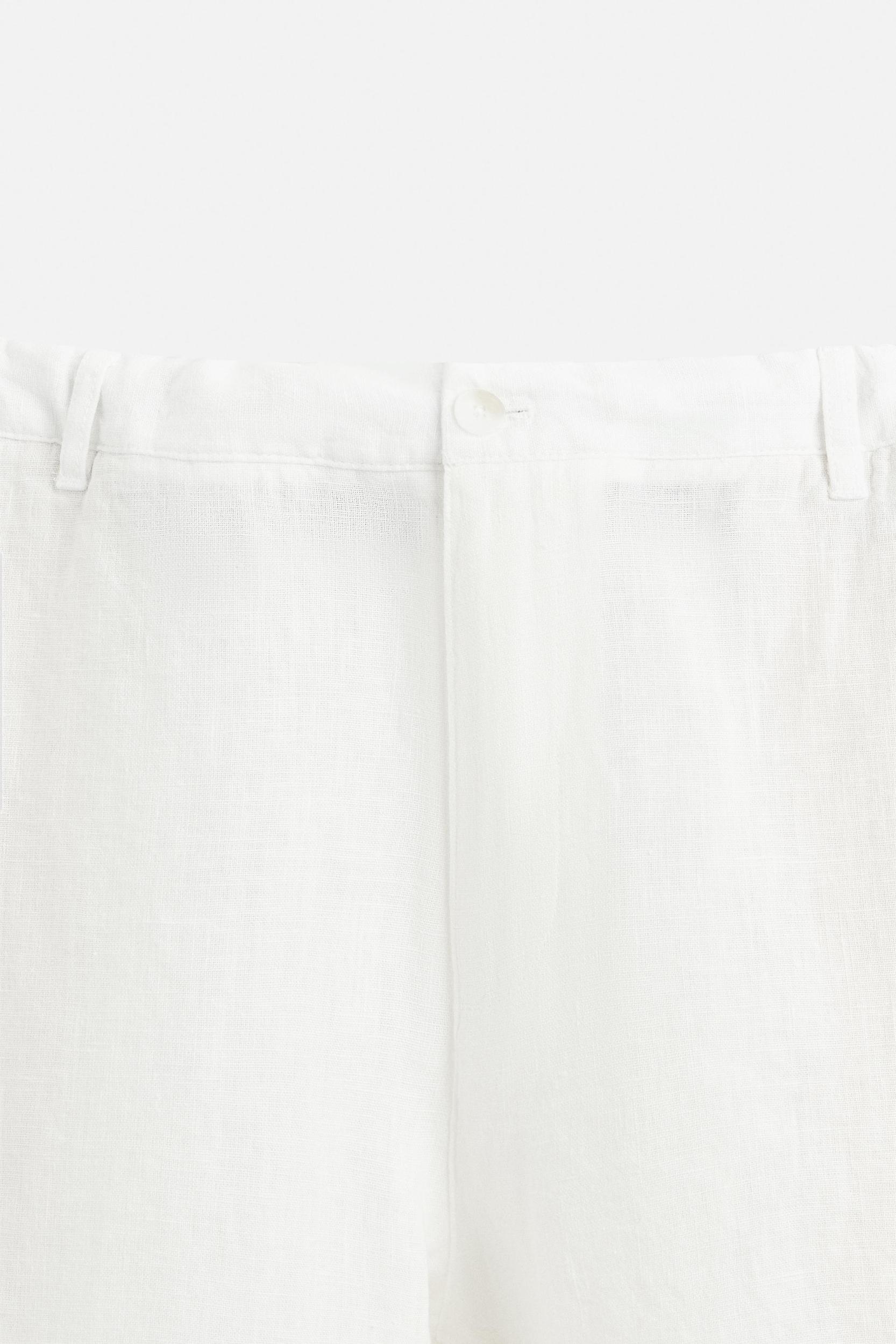 Relaxed fit pants made of linen fabric. Adjustable elastic waistband with inner drawstring. Front pockets and back patch pockets detail. Front zip and button closure.