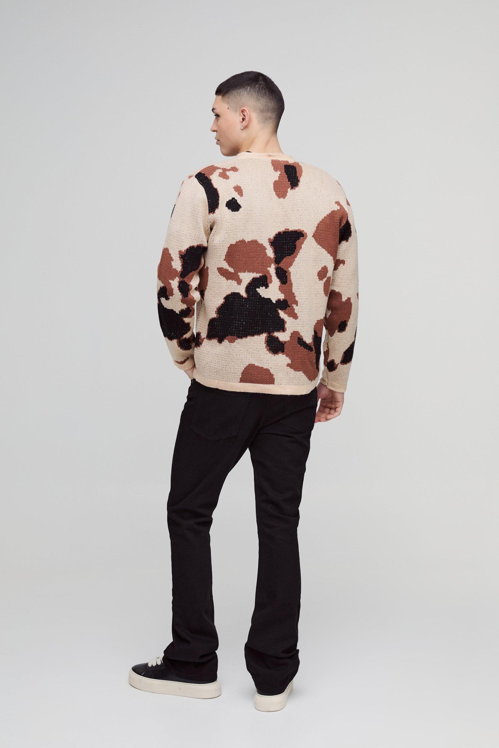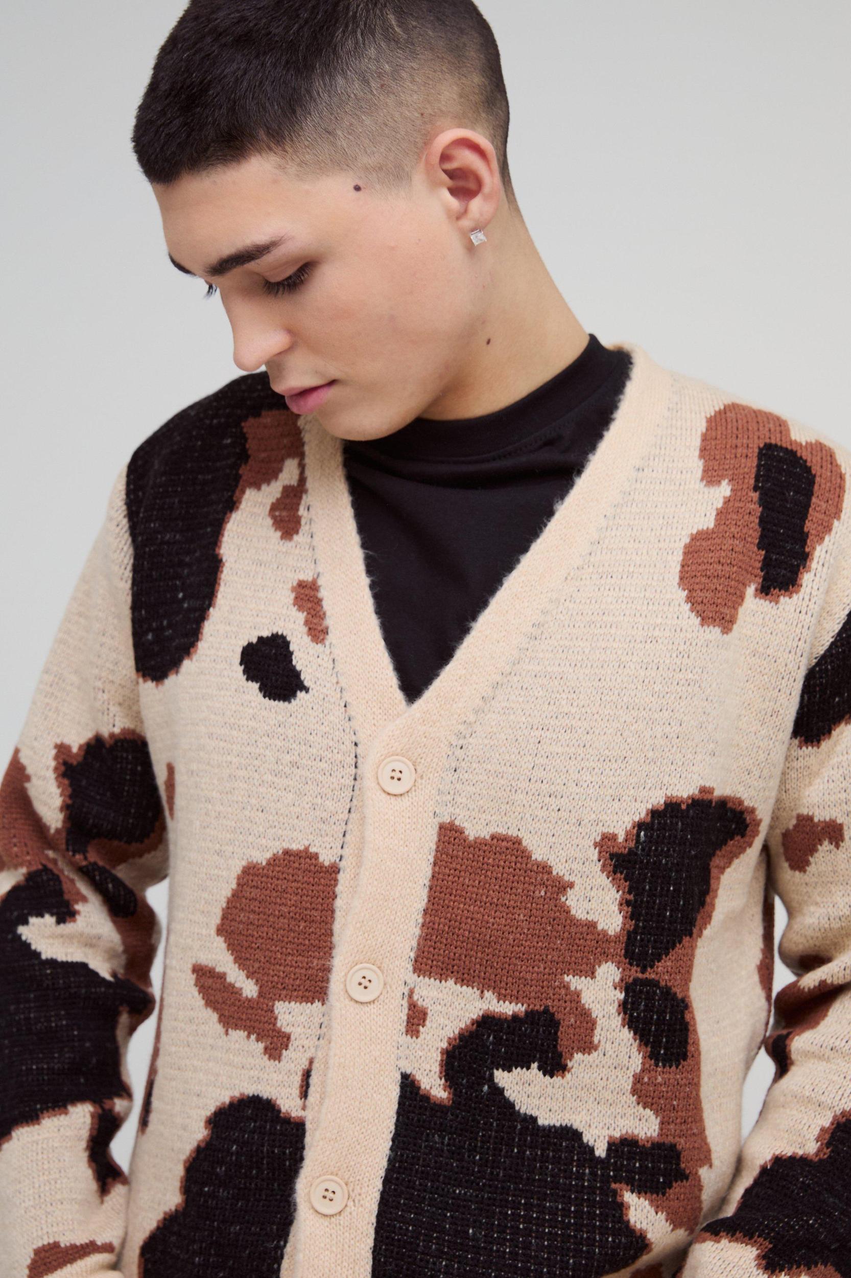 Relaxed Fit Brushed Cow Print Knitted Cardigan | boohooMAN USA