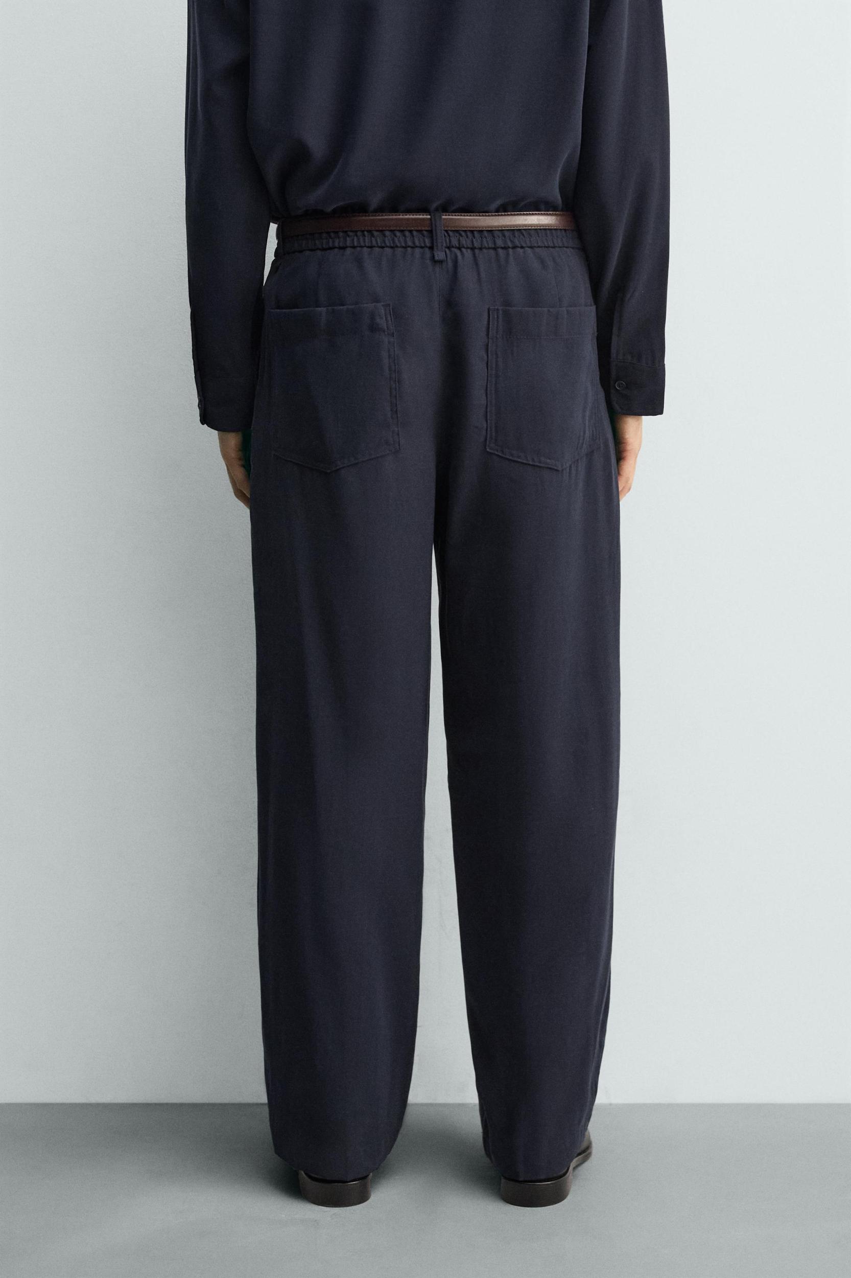 Relaxed fit pants made from a viscose blend fabric. Elastic waistband with front pleats. Front pockets and back patch pockets. Front zip and button closure.