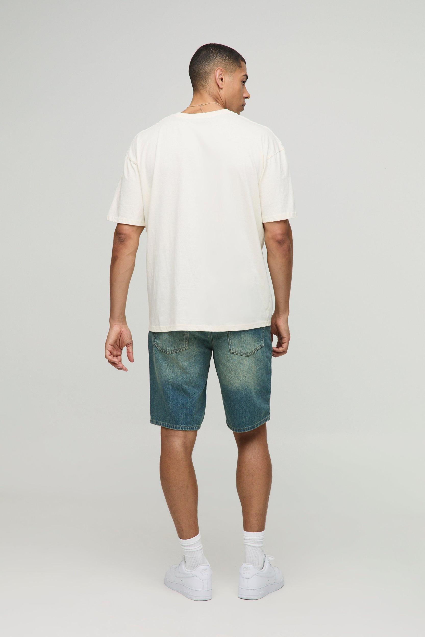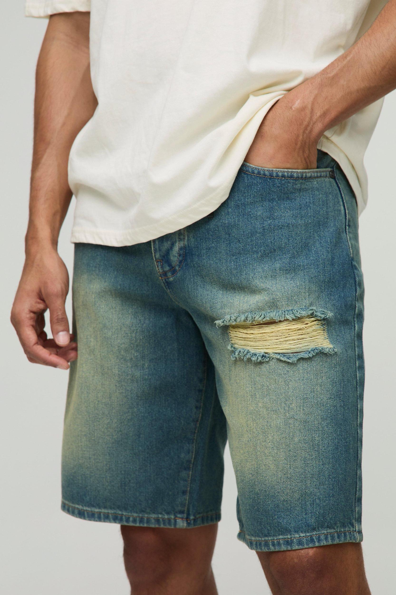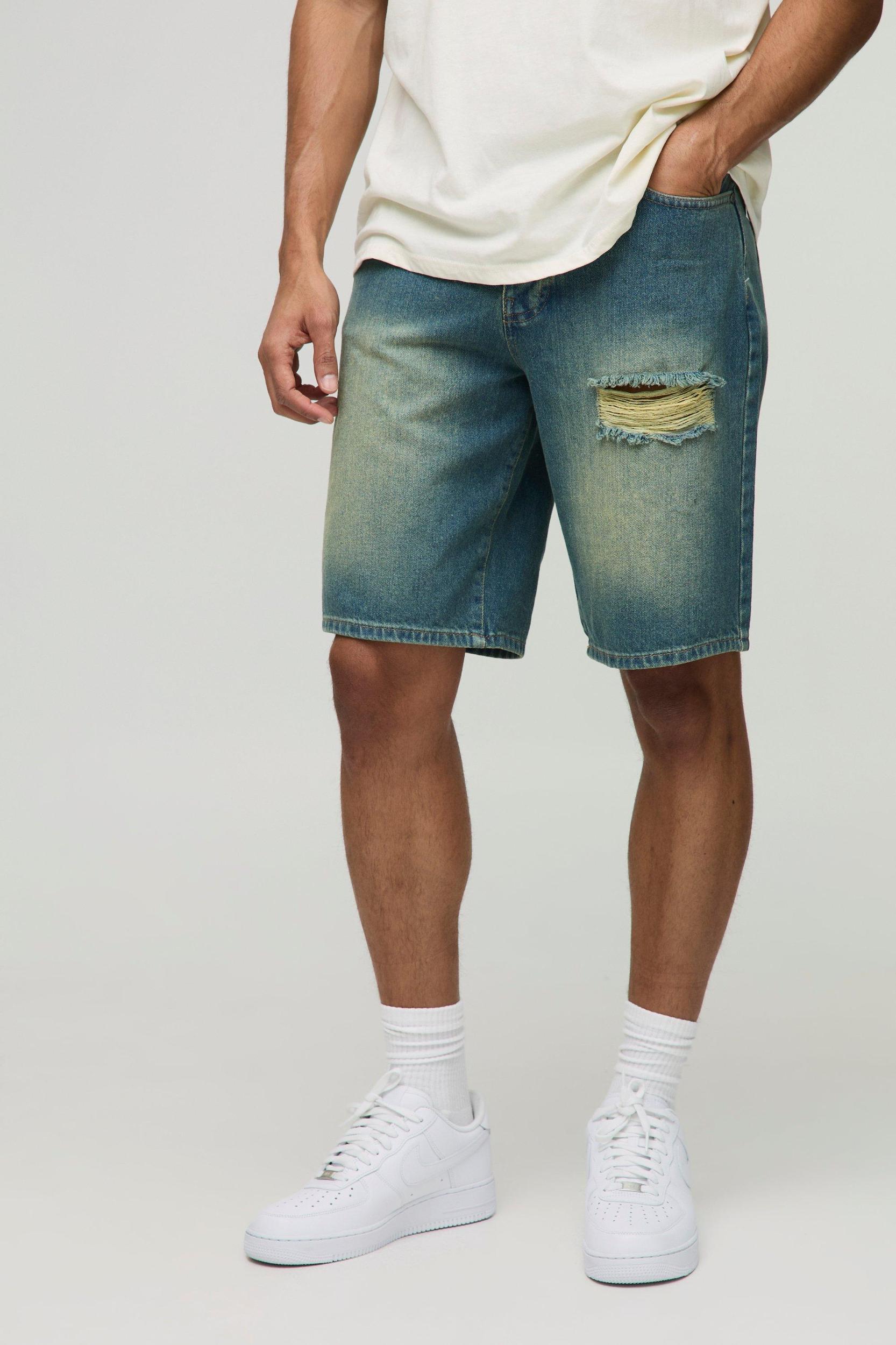 Relaxed Fit Long Length Vintage Blue Ripped Jean Shorts | boohooMAN USA