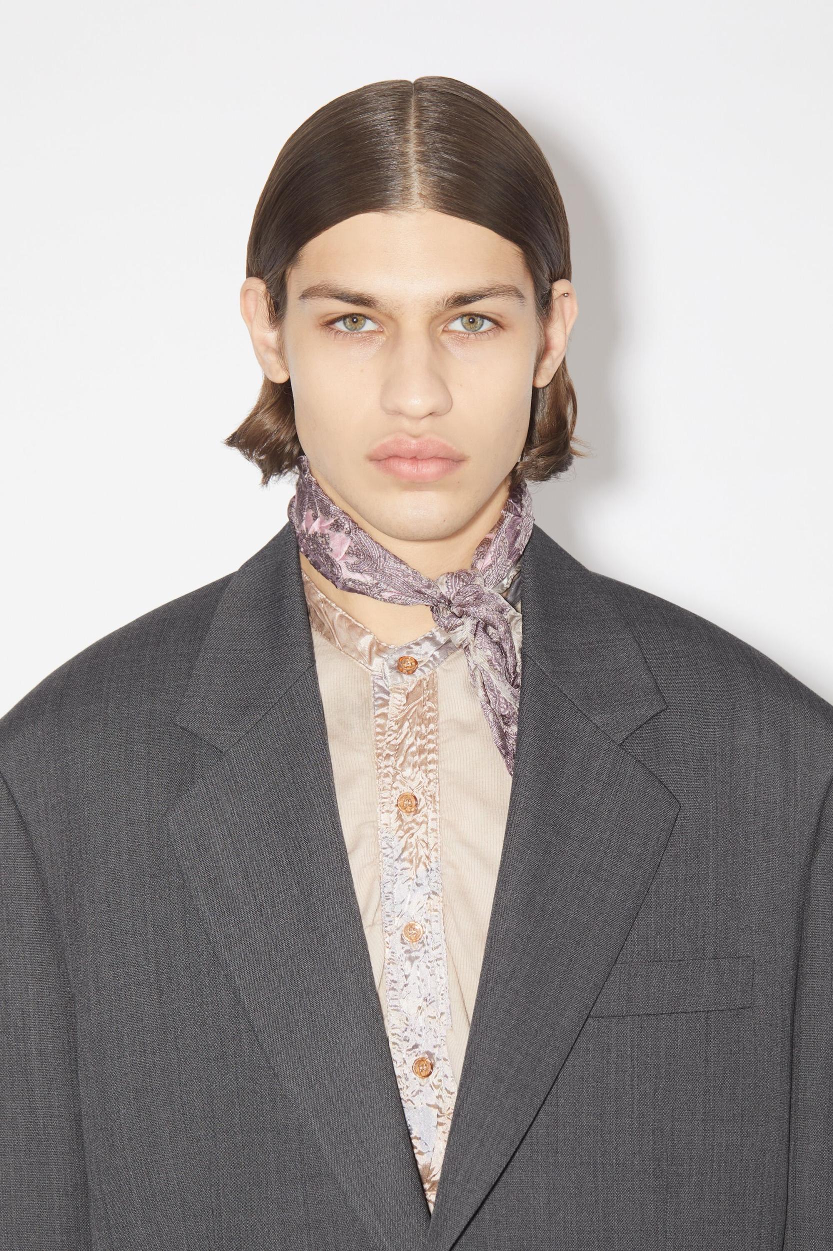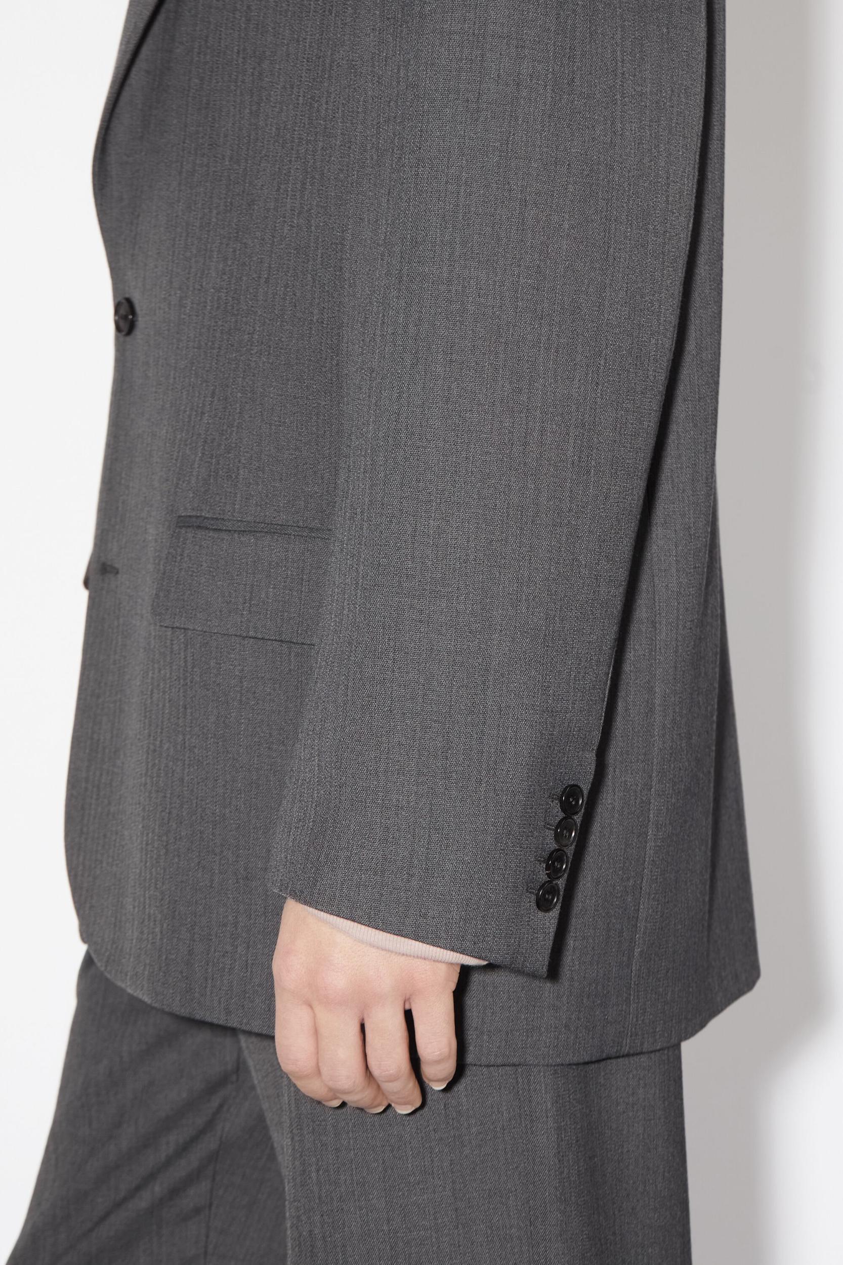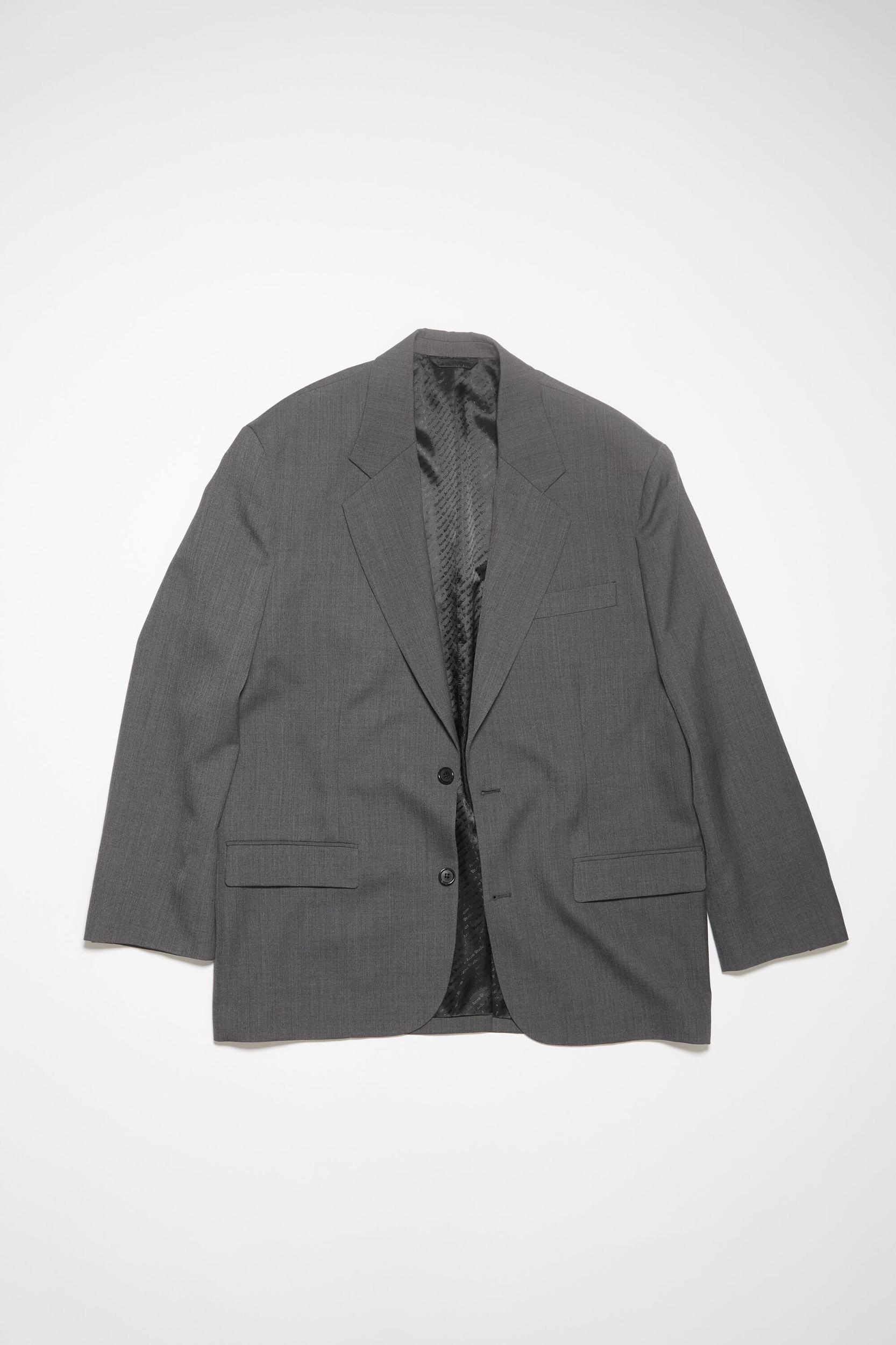 Acne Studios dark grey melange single-breasted suit jacket is crafted from a wool blend, complete with front flap pockets. Cut to a relaxed fit and mid-length. FN-MN-SUIT000328