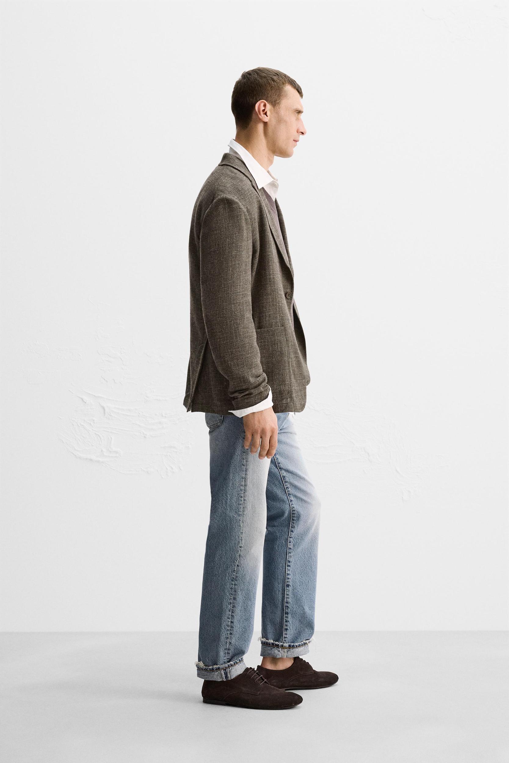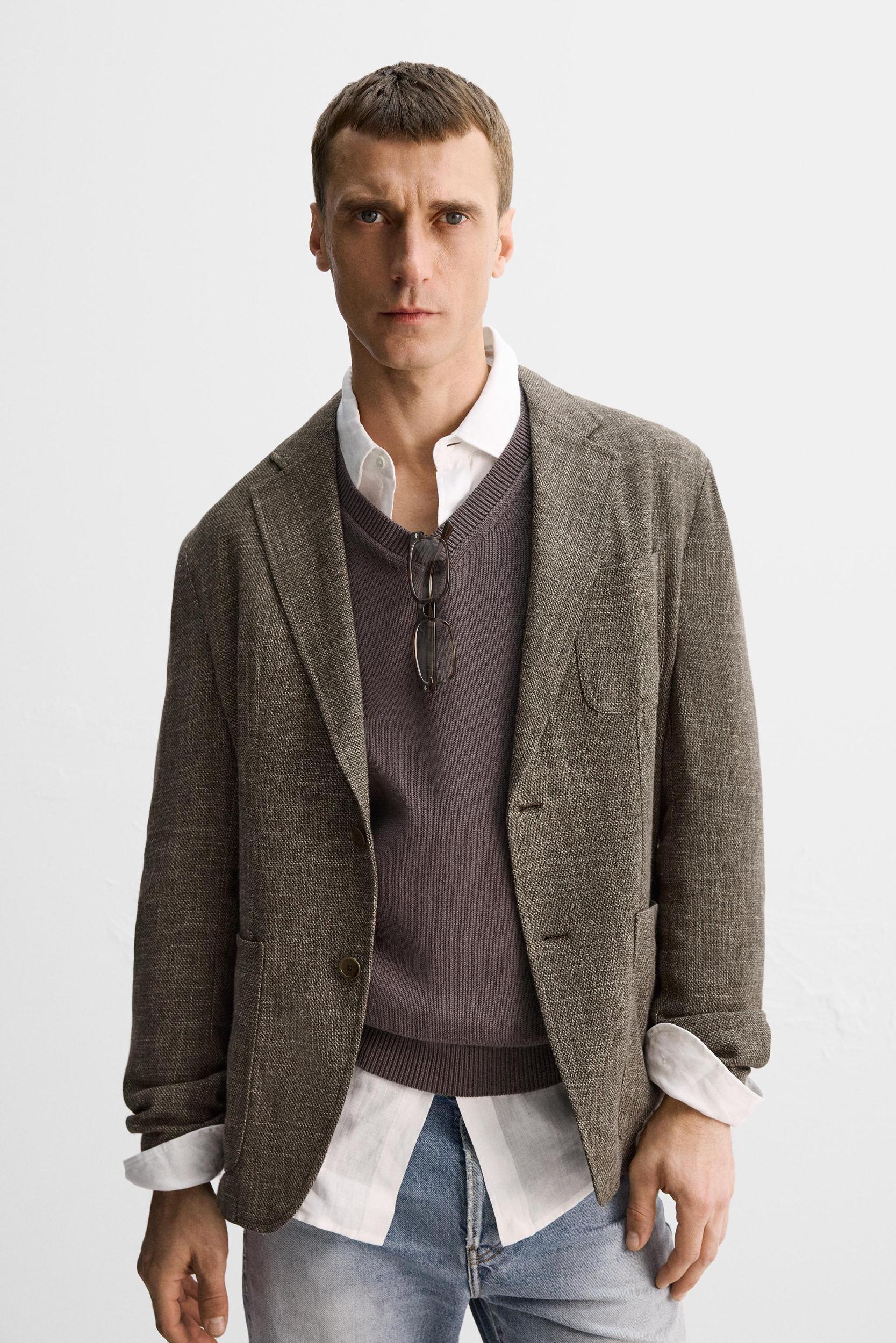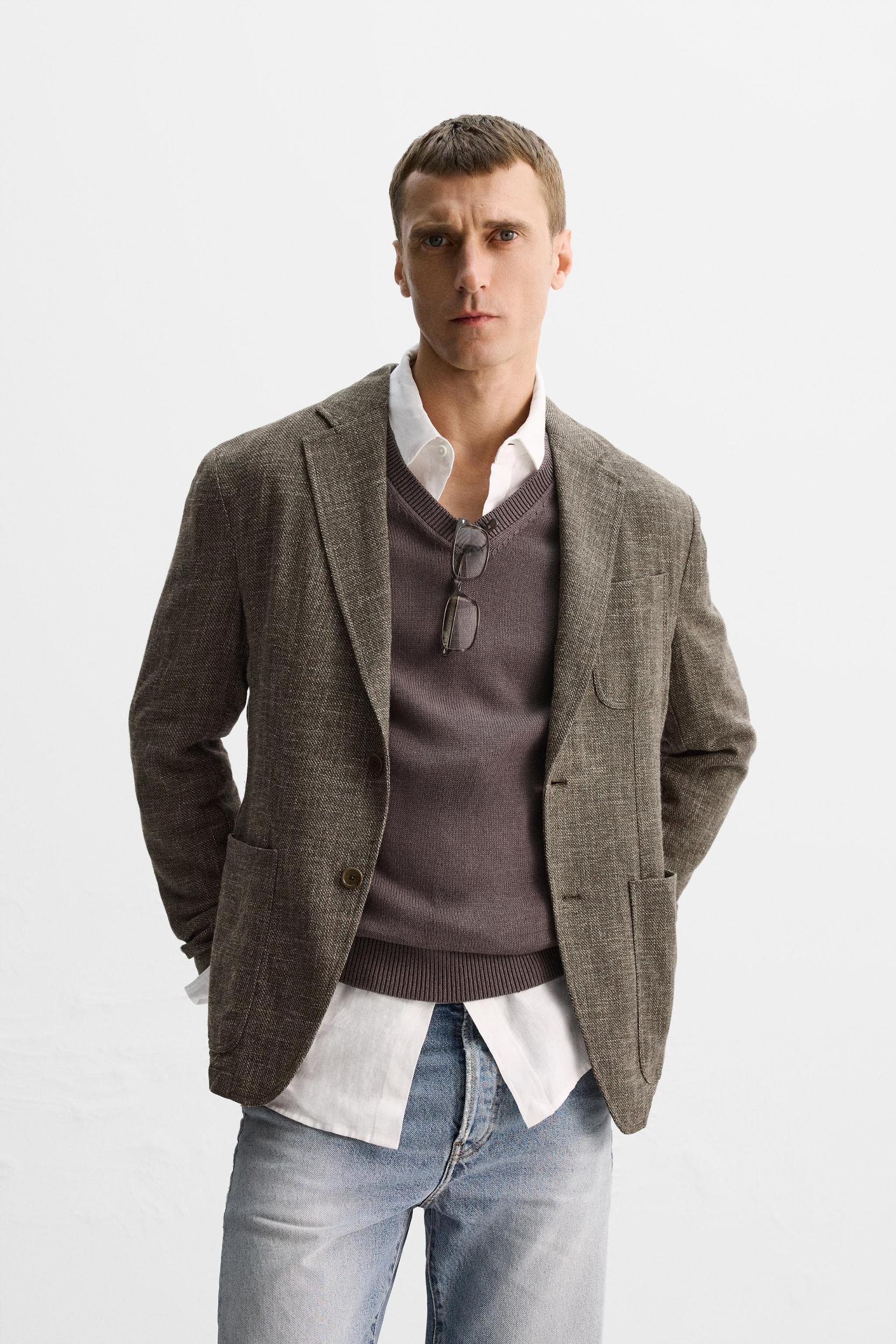 Relaxed fit blazer made of fabric with viscose, cotton and 12% linen. Notched lapel collar and long sleeves with buttoned cuffs. Unlined interior. Front patch pockets. Interior pocket detail. Front button closure.