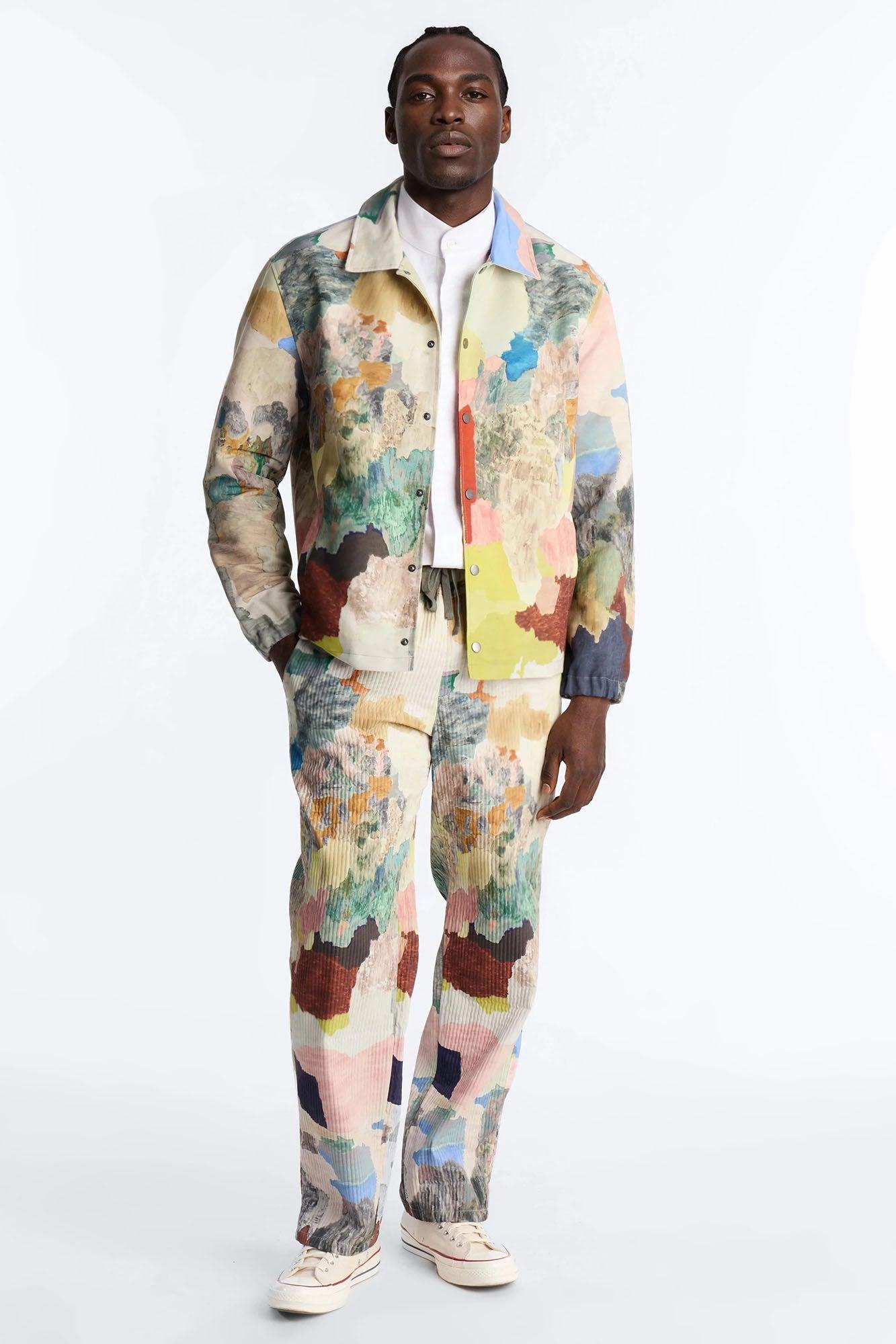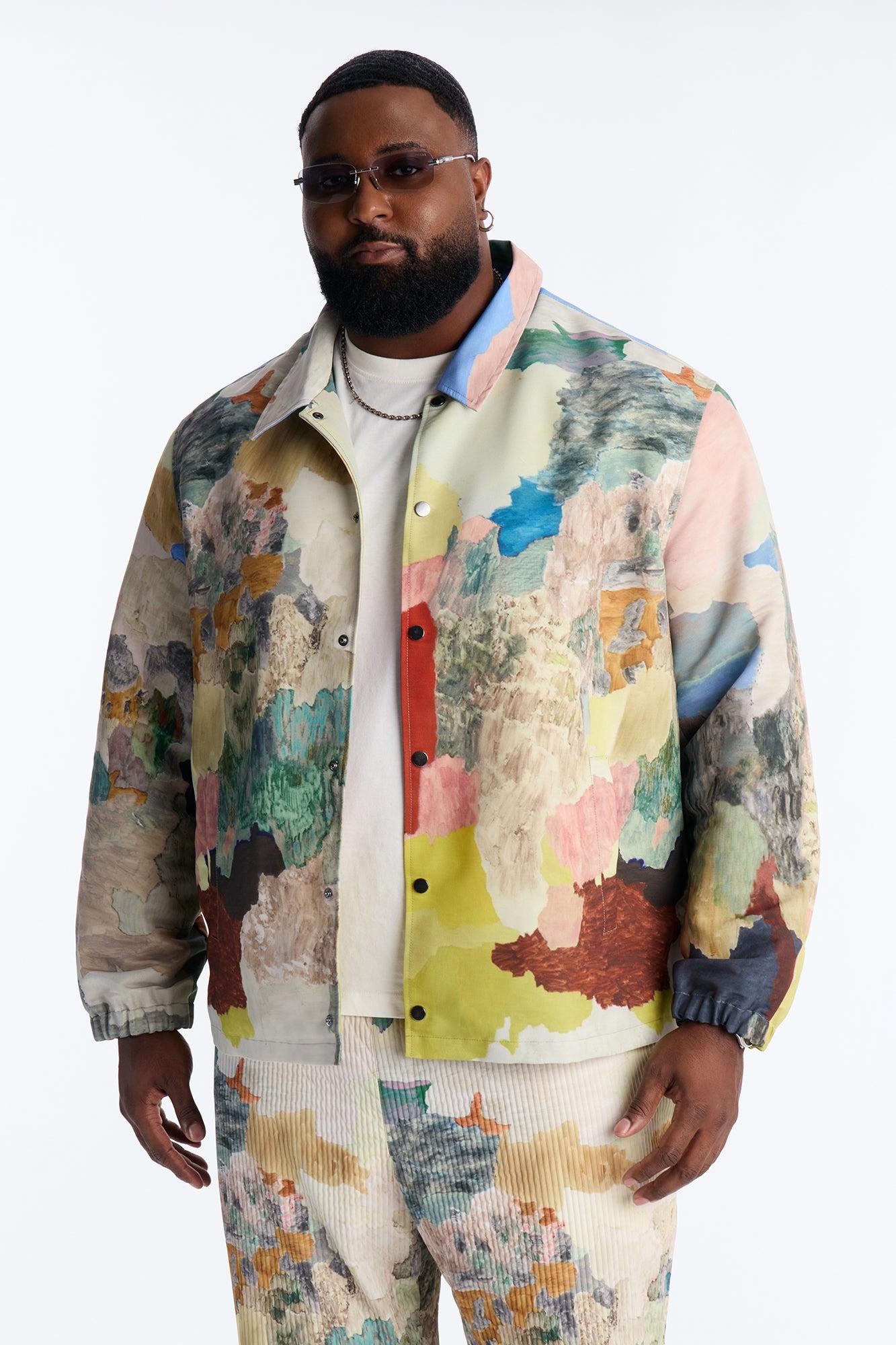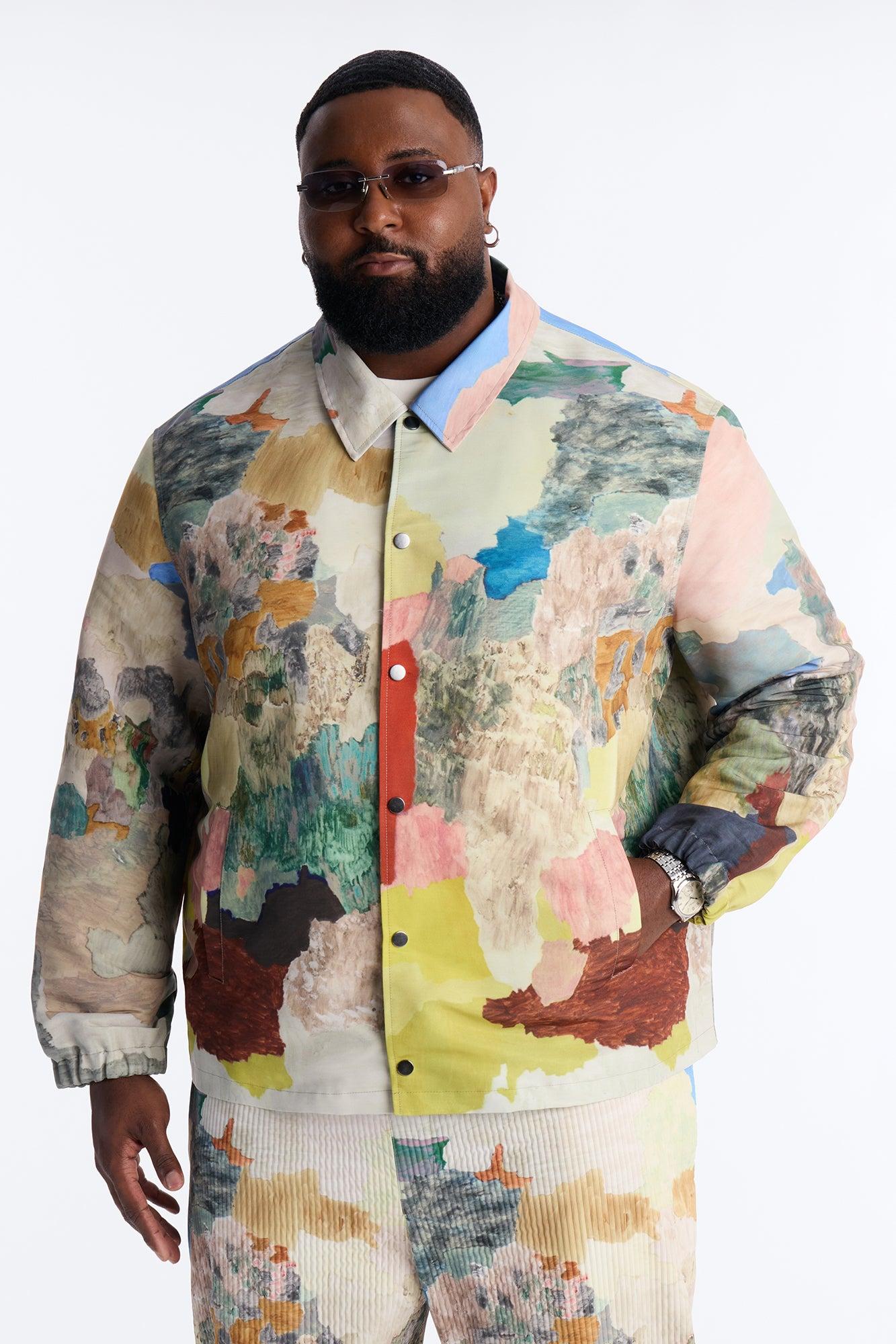 Available In Multi Color. Coach Jacket Relaxed Fit Folded Down Collar Front Full Snap Button Closure Textured Plisse Abstract Printed Painters Brush Strokes Side Hand Pockets Elastic Cuffs Long Sleeves Disclaimer: Due To The Printing Process A Difference In Saturation May Occur. Each Garment Is Unique. Shell/Lining: 100% Polyester Pair With "Straight Painters Room Printed Pant - Multi Color" Imported California Proposition 65WARNING: Cancer and Reproductive Harm - www.P65Warnings.ca.gov.