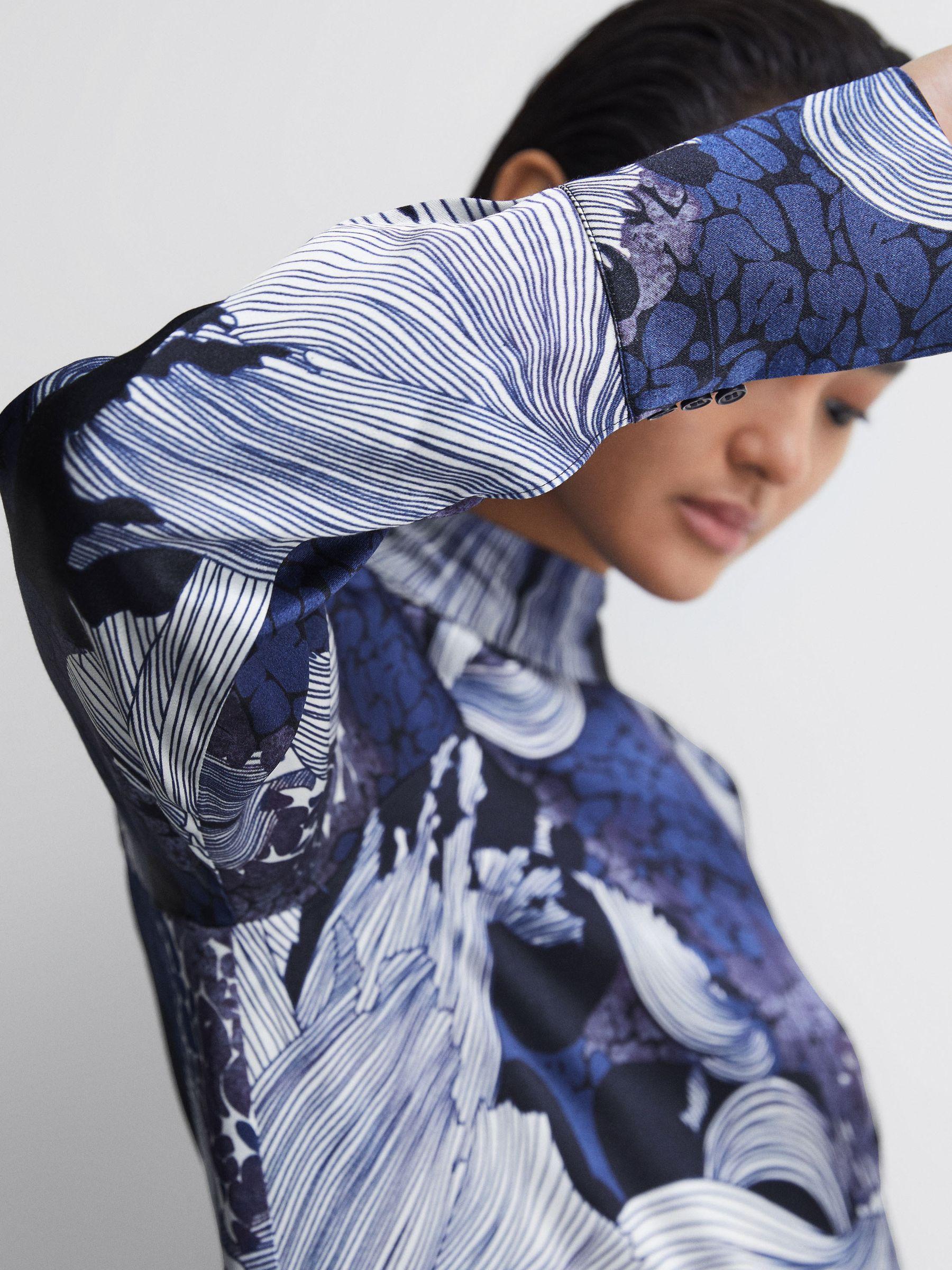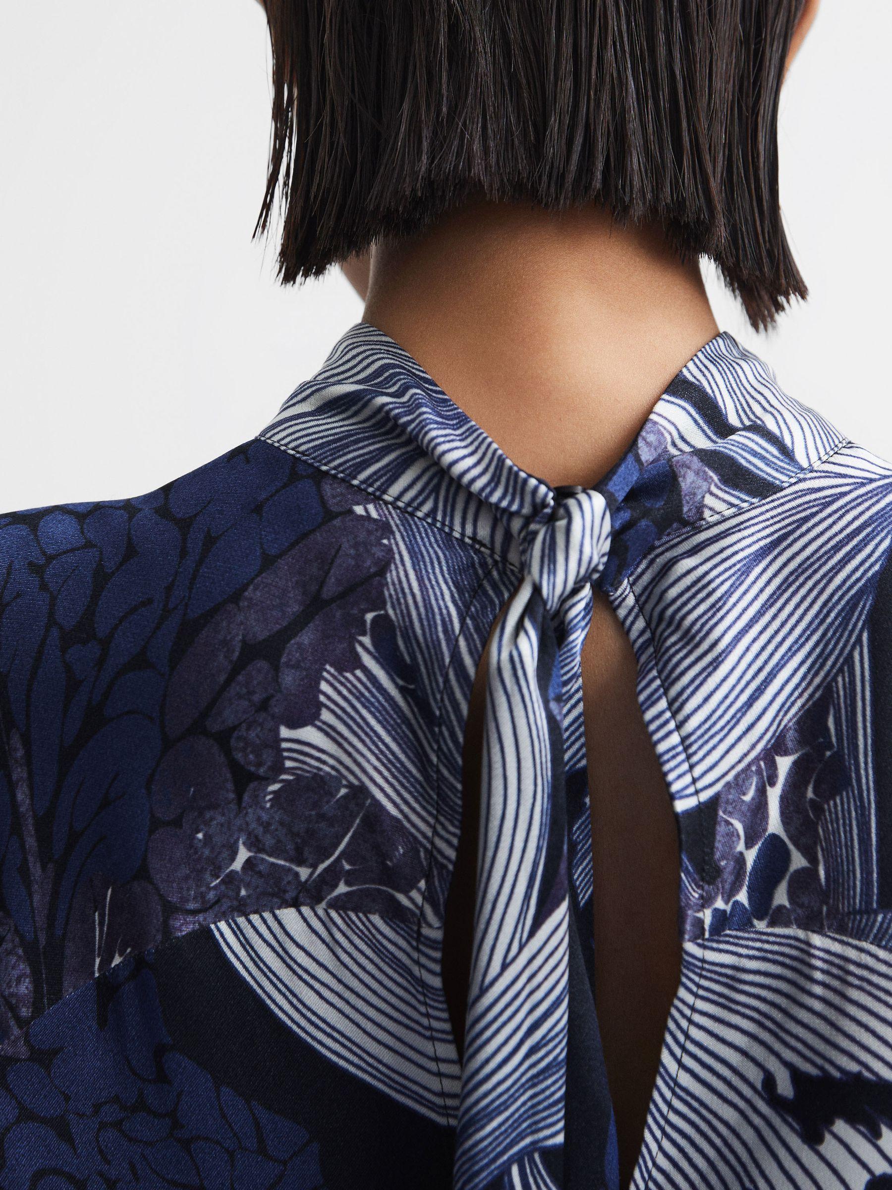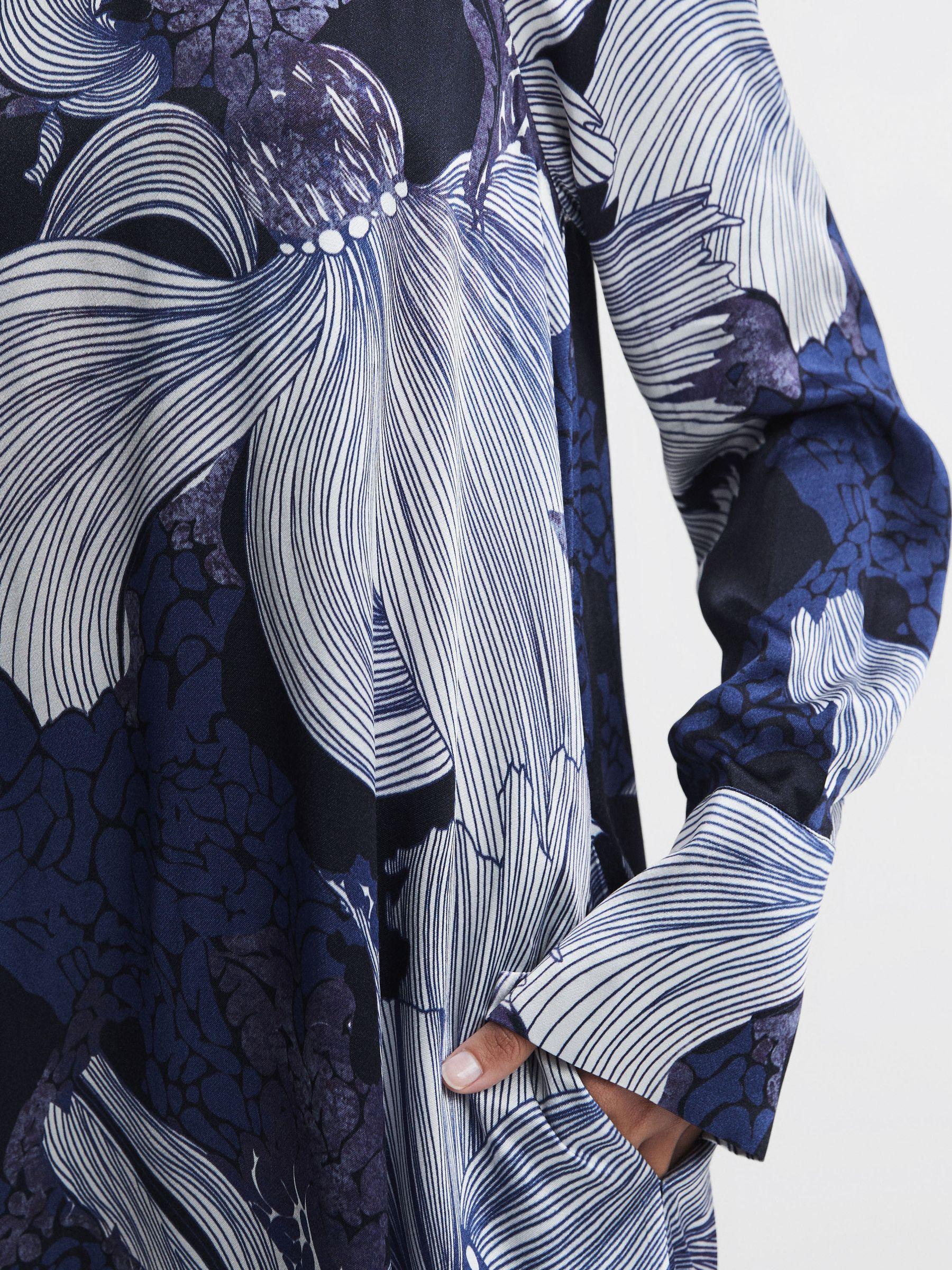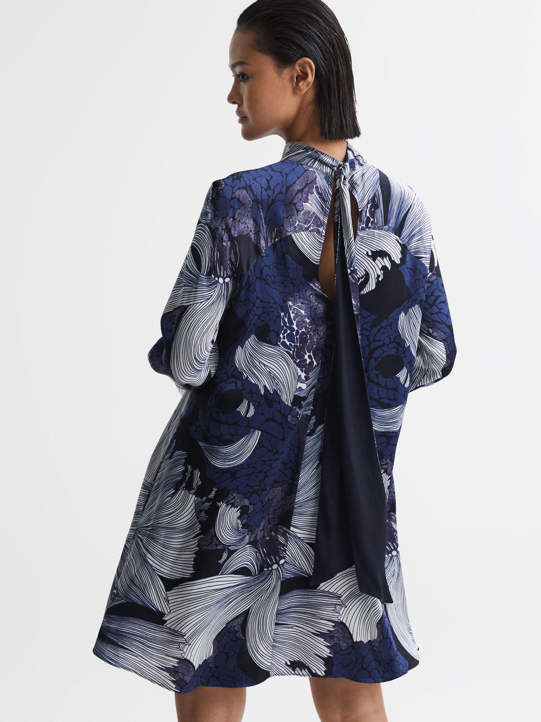 A lustrous satin fabric is designed in a blue and white floral print and cut into a sophisticated shape for the Thea dress. Note its high neckline which ties at the reverse and its long, raglan sleeves which enhance the movement of the piece. Its fluid mini skirt finishes mid-way on the thigh, elongating the profile. Satin fabrication Printed High neckline Self-tie fastening to reverse Keyhole opening to reverse Long, raglan sleeves Buttoned cuffs Mini length Relaxed fit The model is wearing a size 8 Measurements of model: Height 5ft 9" / 175cm
