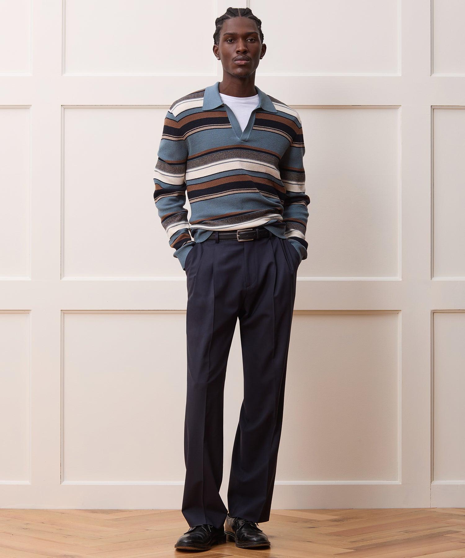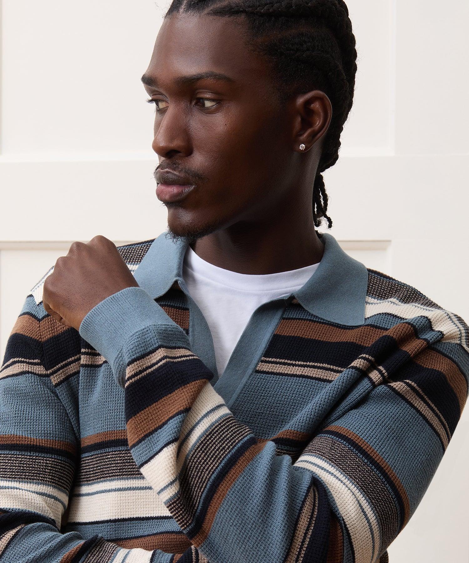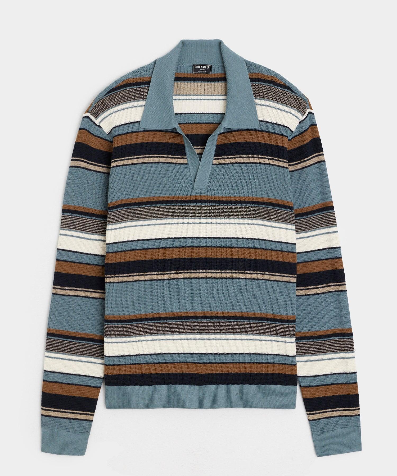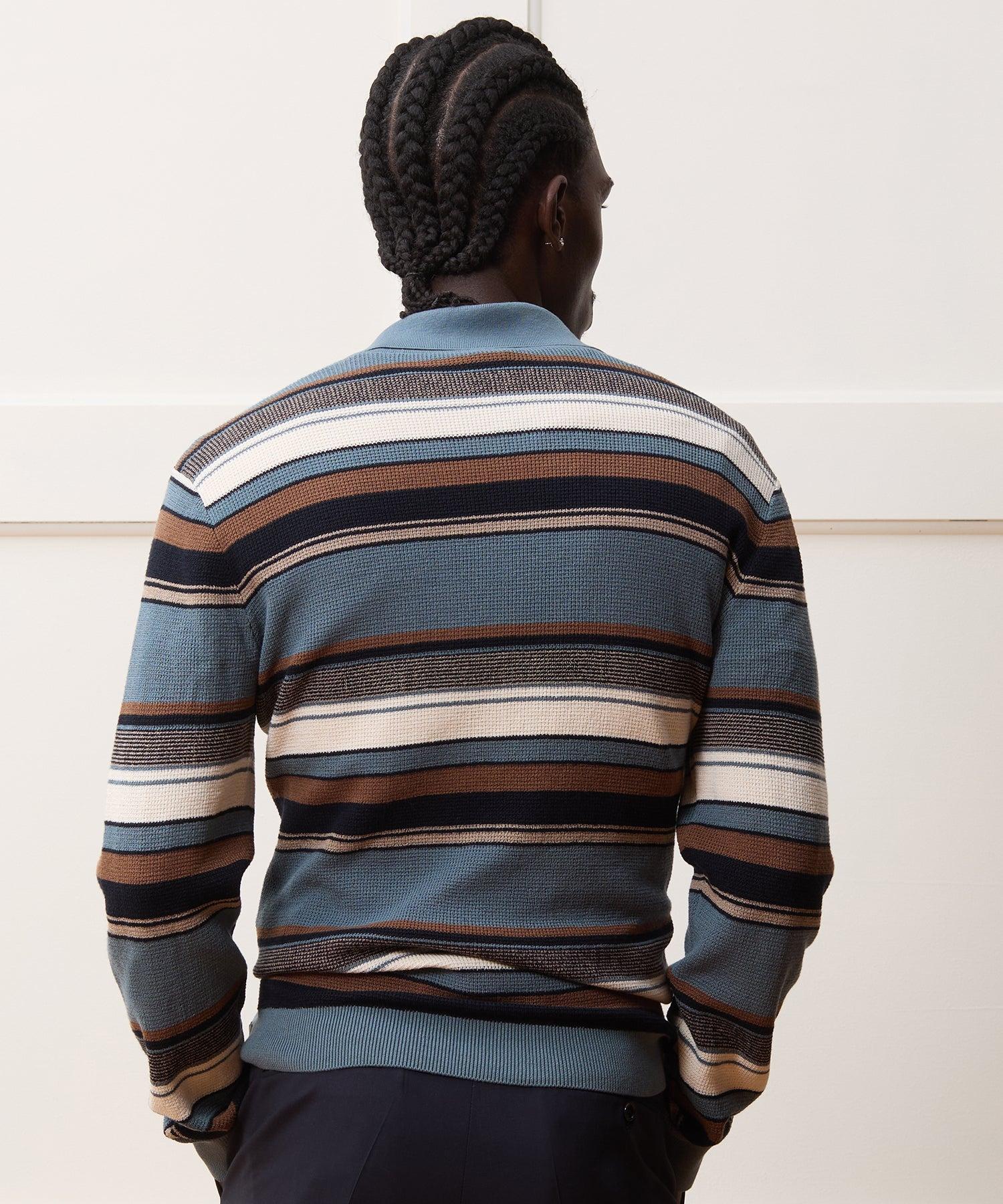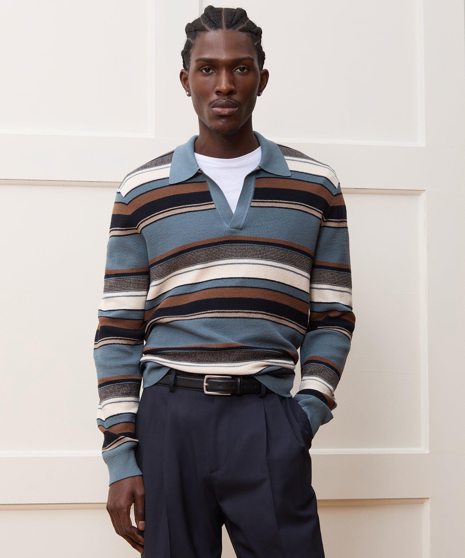 This easy polo is made from a soft and lightweight silk-and-cotton yarn, in coastal-inspired shades of brown, blue and white. It’s knit with a micro waffle stitch for a textured look and feel, with ribbing at the hem. It has a slightly easier fit than our standard polos, with our signature Johnny collar, open placket and a relaxed body. We like this styled casually, thrown on with your favorite chinos. 55% Silk, 45% Cotton Relaxed Fit Model is 6'1" and is wearing a size Medium Montauk Collar Ribbed Trim Vented Side Seams Made in China Dry clean or hand wash cold. Lay flat to dry. Cool iron if needed. Style SW5470093