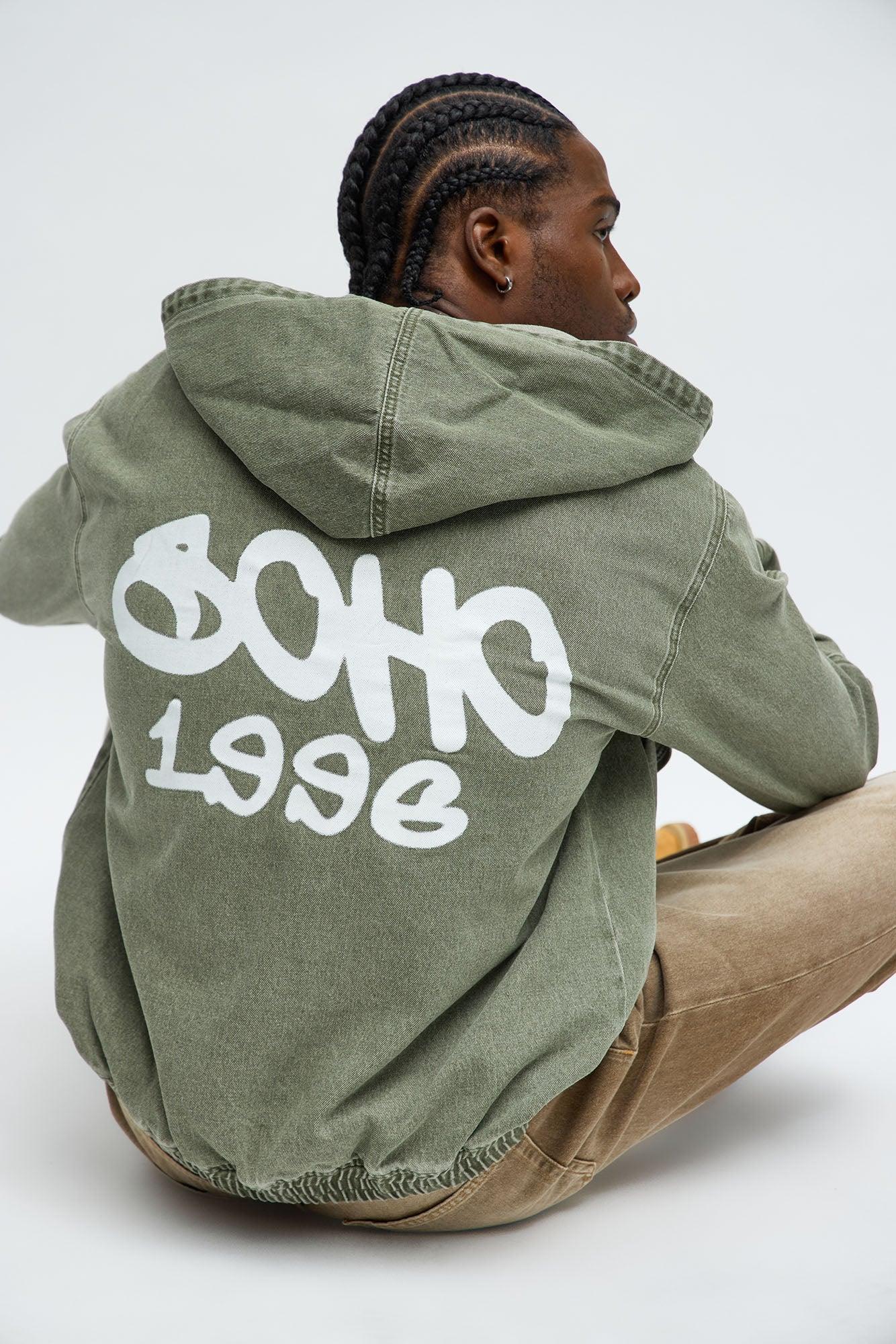 Available In Olive. Relaxed Fit Pullover Jacket Hooded With Cinch Detail Front Half Snap Neckline Front Paneled Details Back "Soho 1996" Graffiti Print Detail Invisible Side Hand Pockets Elastic Hem And Cuffs Long Sleeves Disclaimer Due To The Specialized Wash Process, Each Garment Is Unique. Self: 53% Cotton 28% Polyester 19% Rayon Imported
