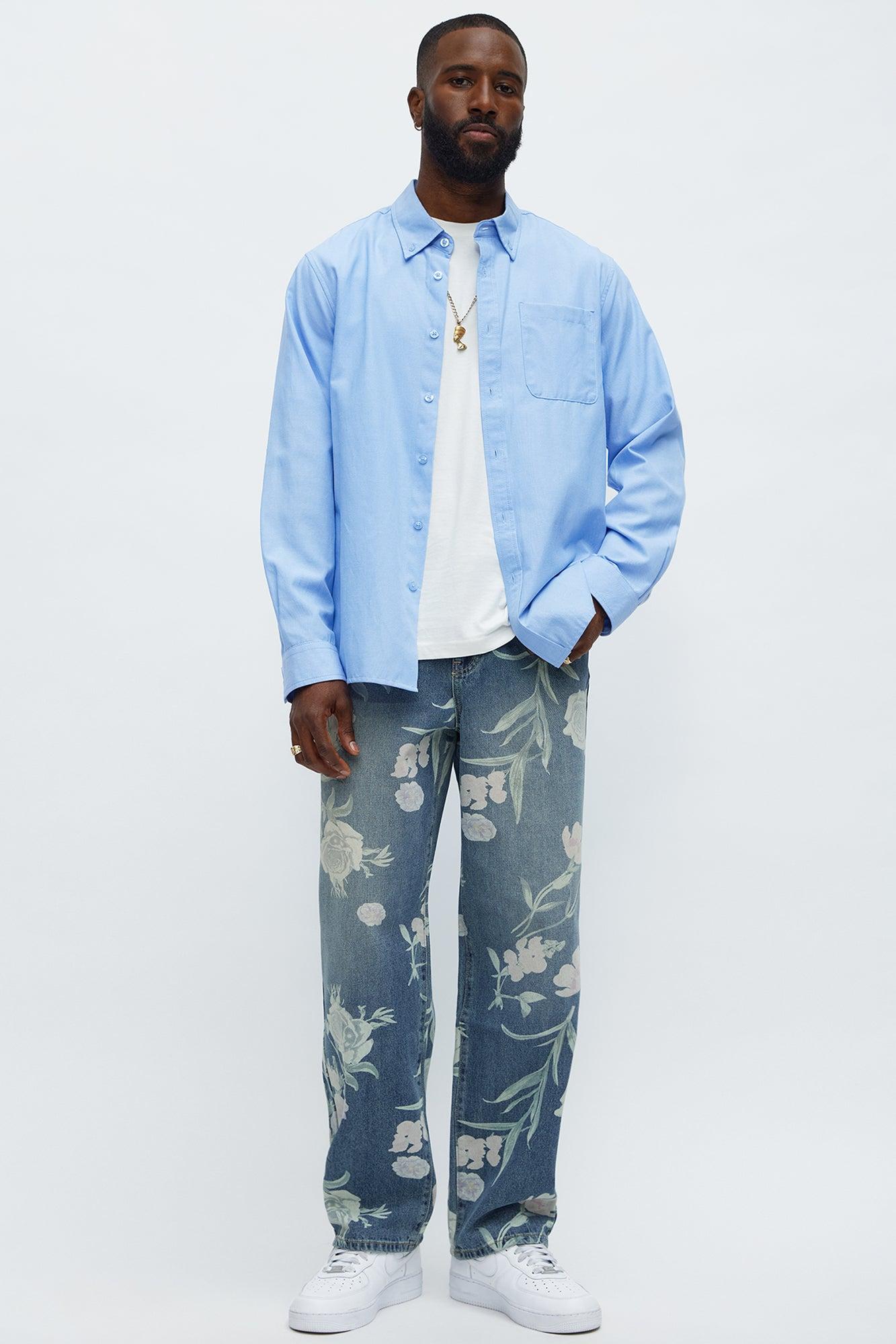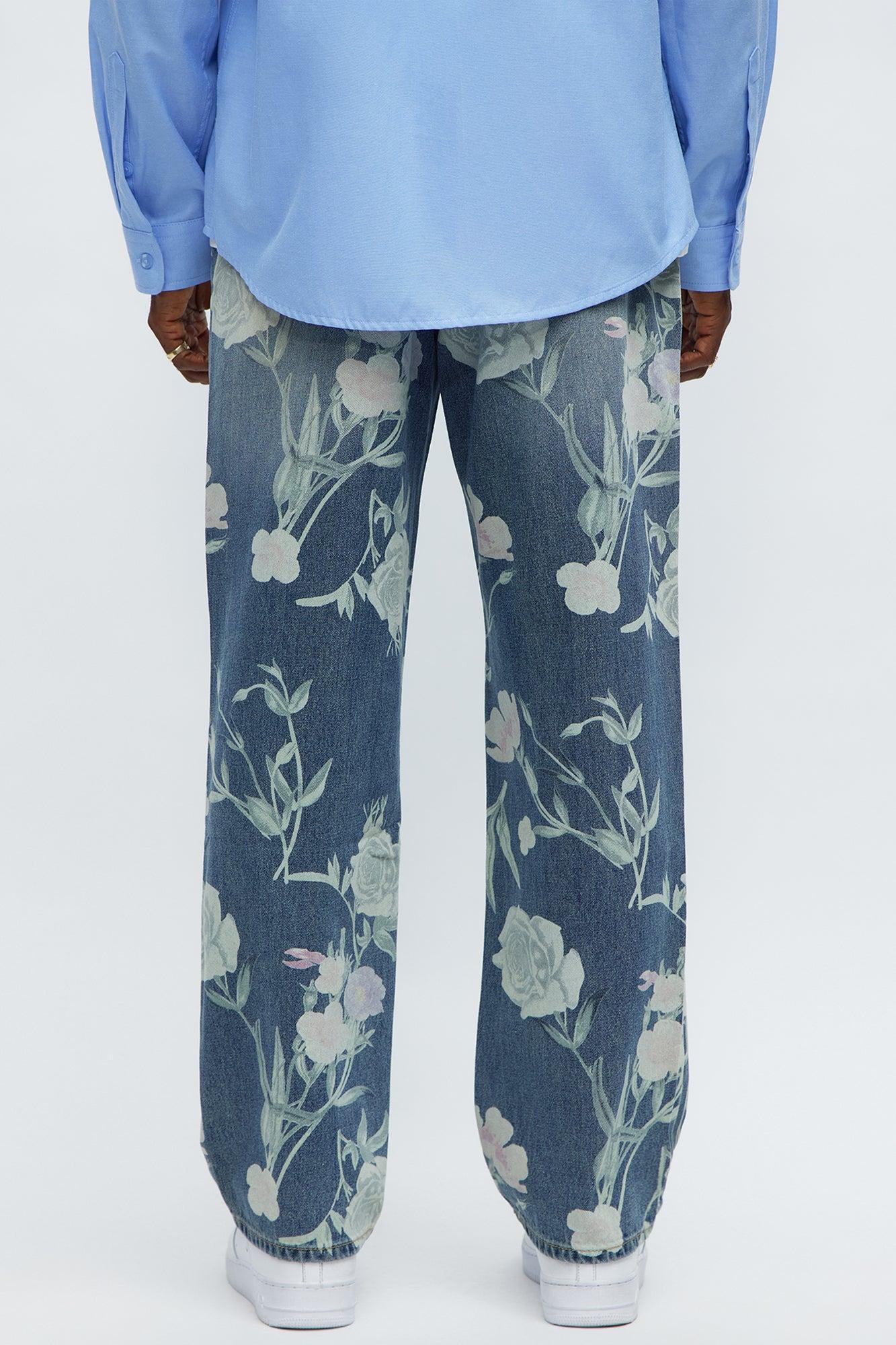 Available In Medium Blue Wash. All Over Rose Relaxed Relaxed Fit Zip Fly Button Closure 5 Pocket Body Pair With "Fallen Roses Trucker Jacket" Disclaimer: Due To The Specialized Wash, Printing, & Distressing Process, Each Garment Is Unique. Self: 100% Cotton Imported California Proposition 65WARNING: Cancer and Reproductive Harm - www.P65Warnings.ca.gov.