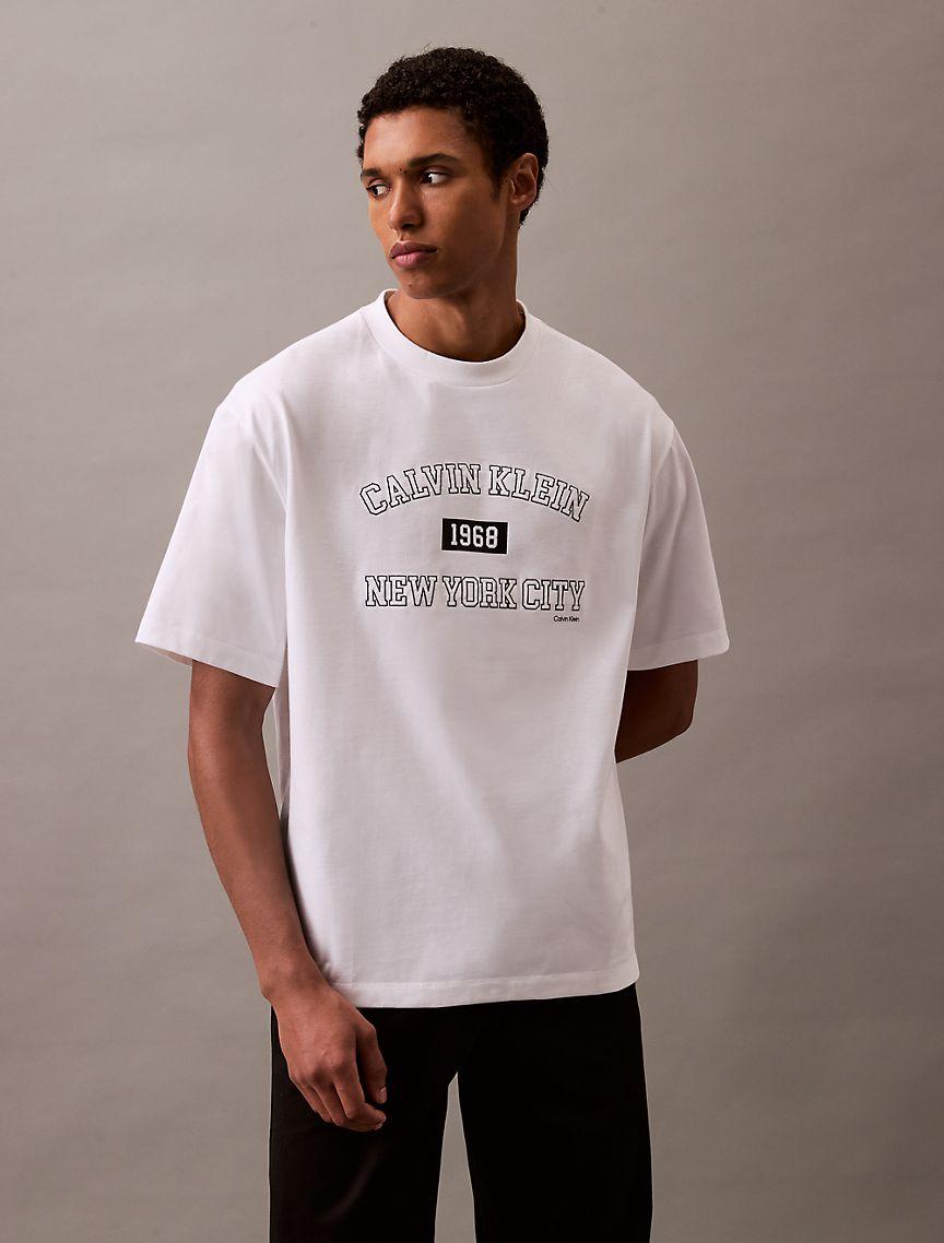 Inspired by varsity athletic styling, this Calvin Klein tee is designed with a CK 1968 NYC printed logo for a classic, sporty look. Cut in relaxed fit with drop shoulders for a generous drape. Crafted from soft cotton for an effortless feel.