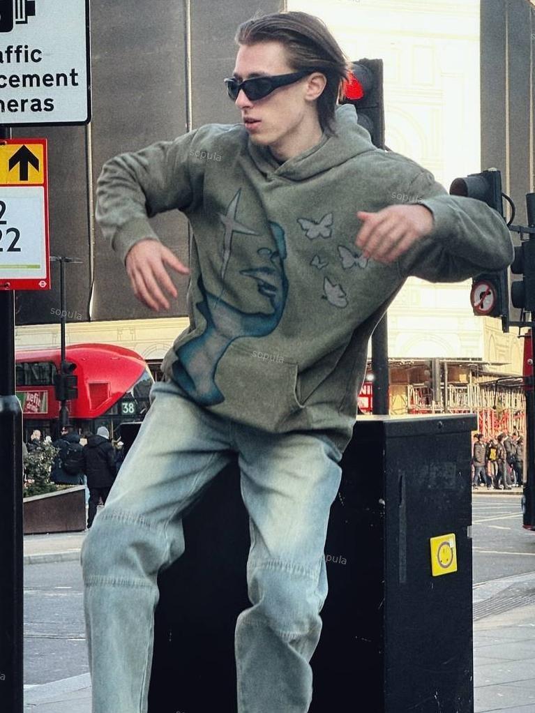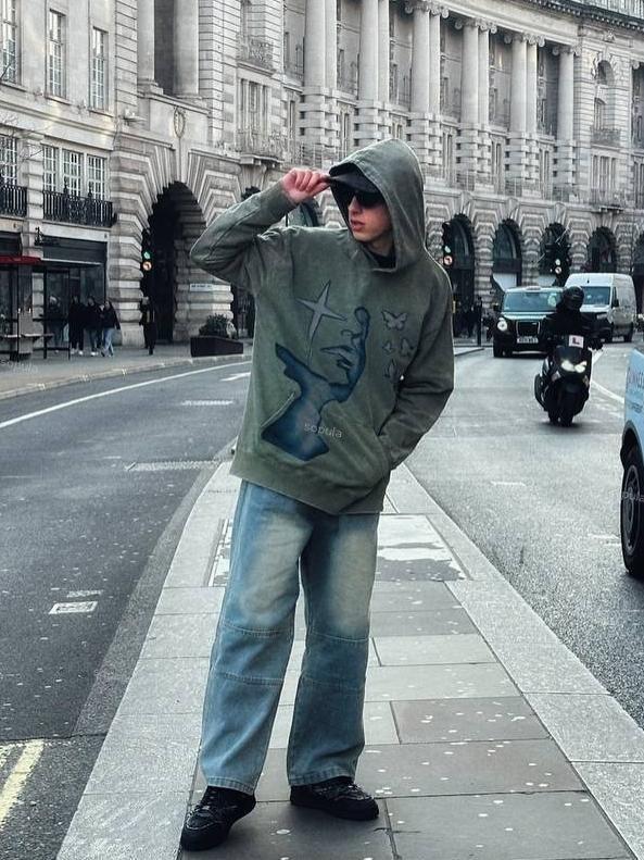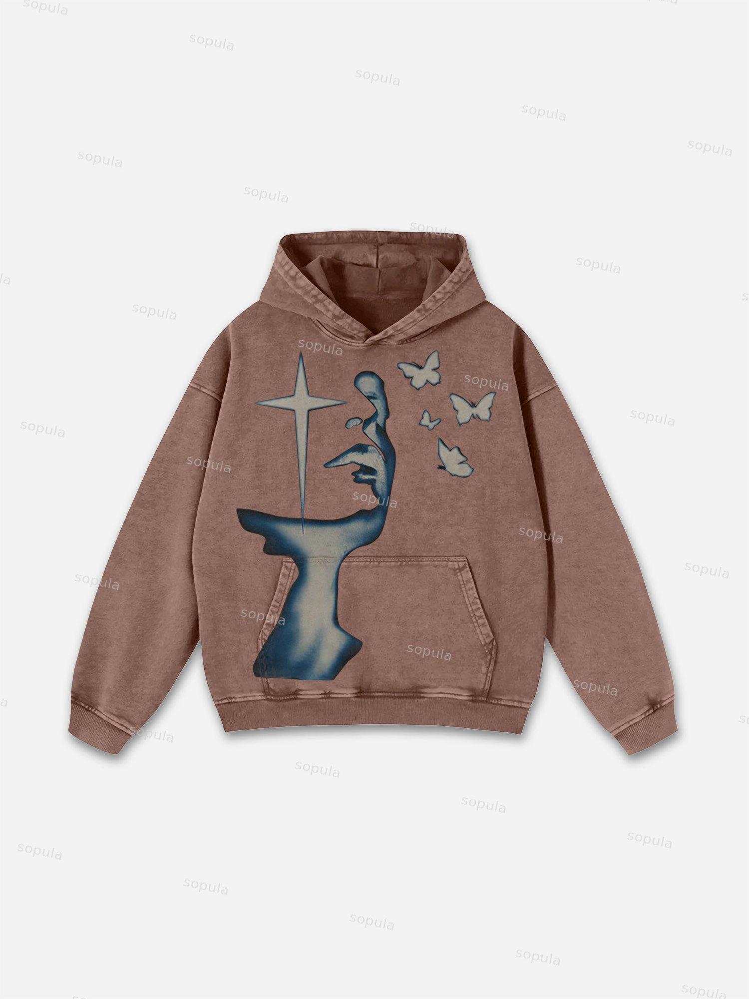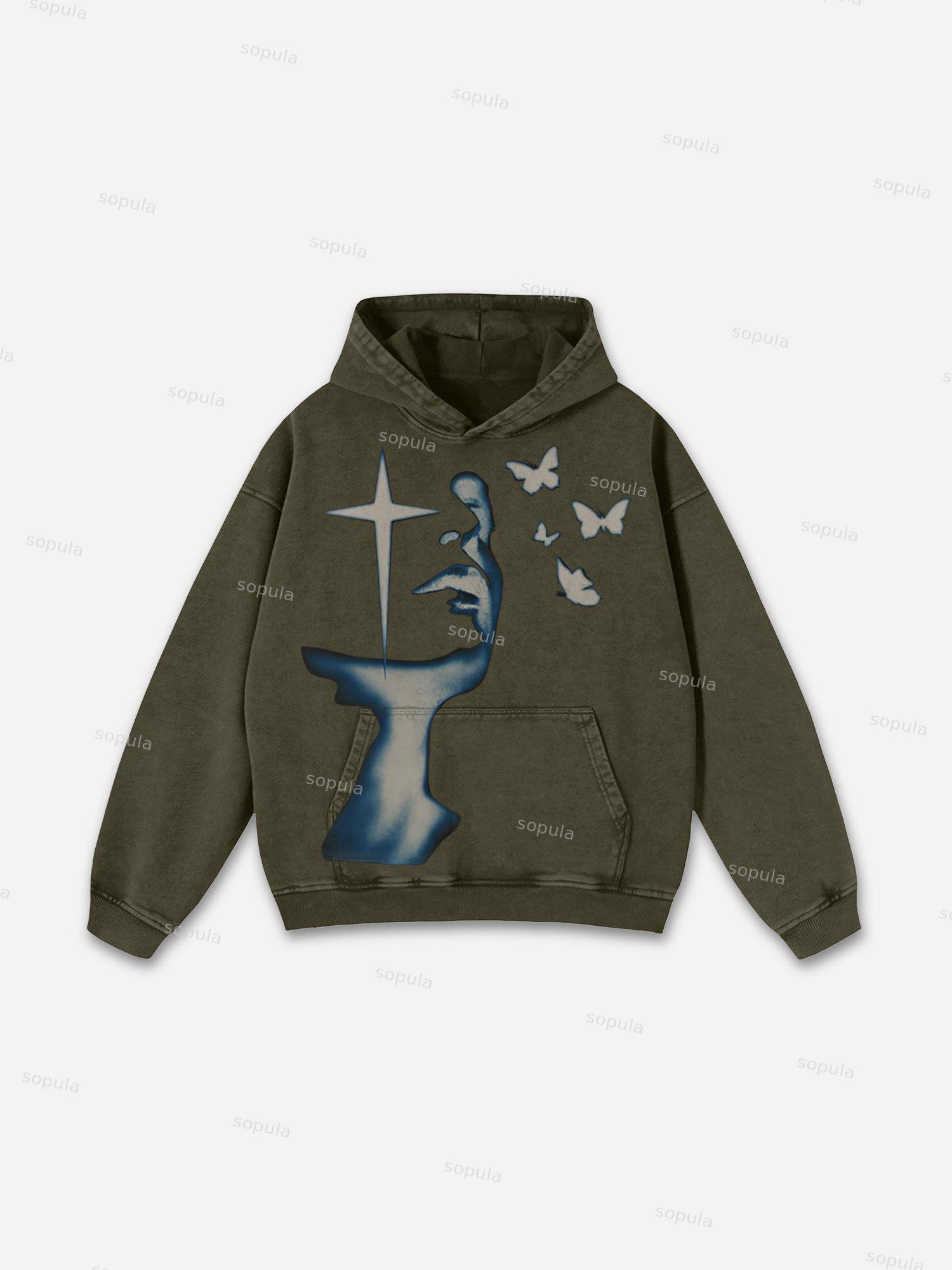 Relaxed Vintage Cross Butterfly Mix Print Graphic Casual Street Washed Hoodie. SPU: CP-105074-LSX Fabric Name: 100% Cotton Wax-Dyed Fabric Pattern: Cross Butterfly Print Process: Printed Style: Vintage Length: Regular Collar: Hoodie Collar Popular Elements: Pocket Sleeve Type: Long Sleeve Occasion: Daily, Street Theme: Spring, Fall
