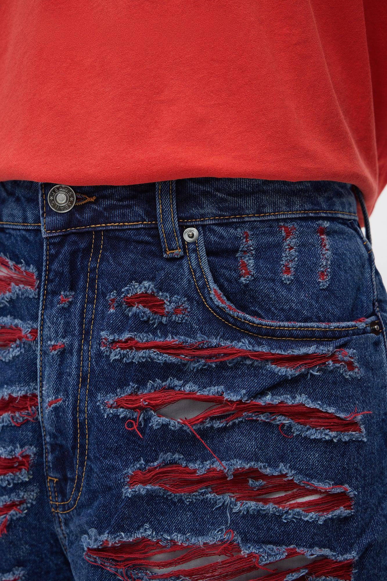 Available In Dark Wash. Relaxed Fit Zip Fly Button Closure 5 Pocket Body Contrast Distressed Detail Ripped And Repaired Disclaimer - Due To The Specialized Distressing & Wash Process, Each Garment Is Unique. 100% Cotton Imported