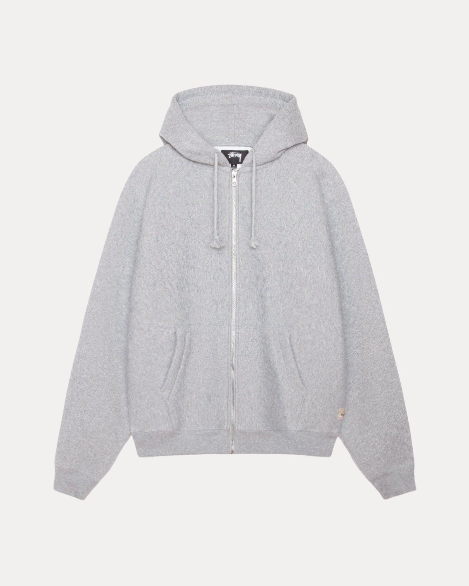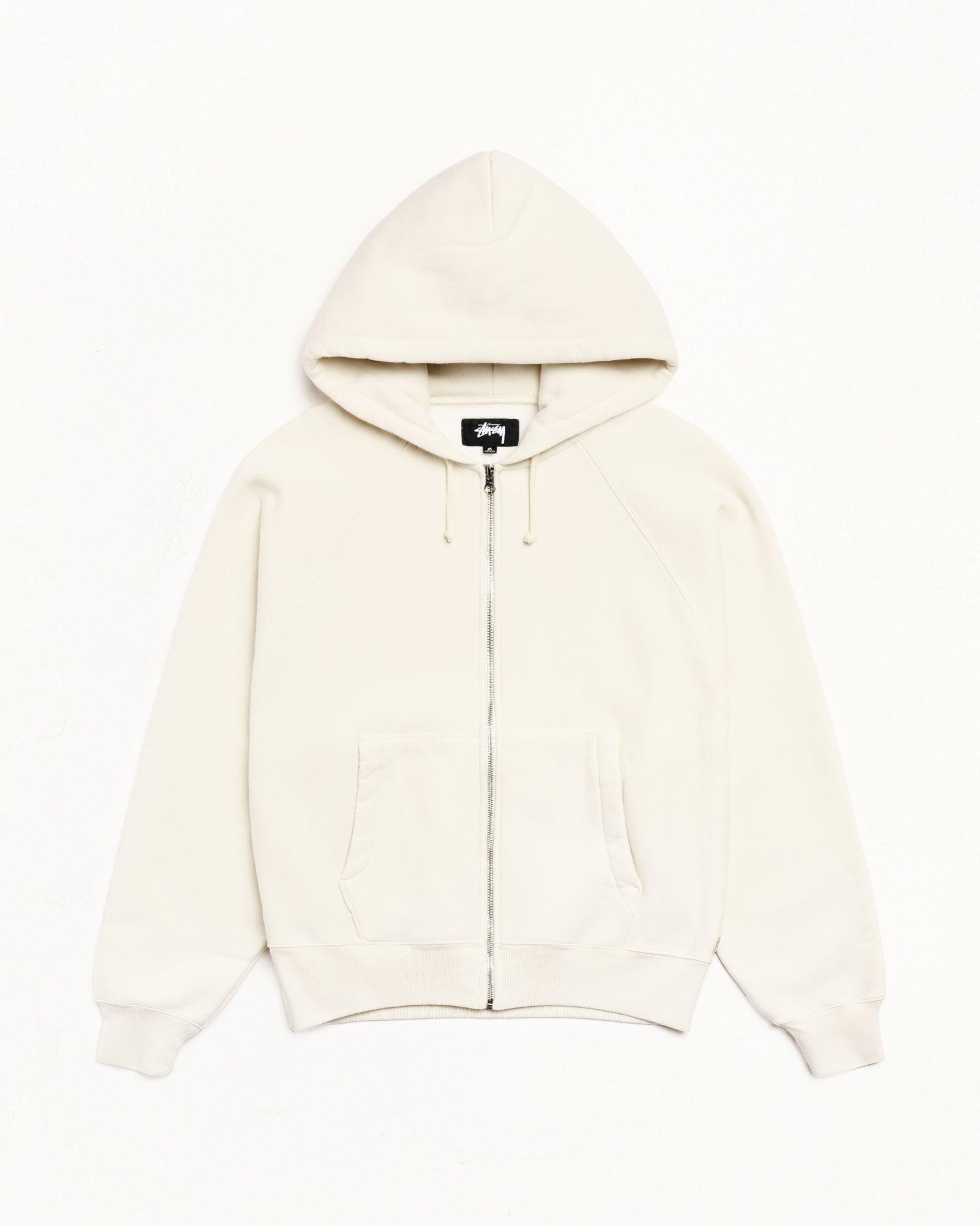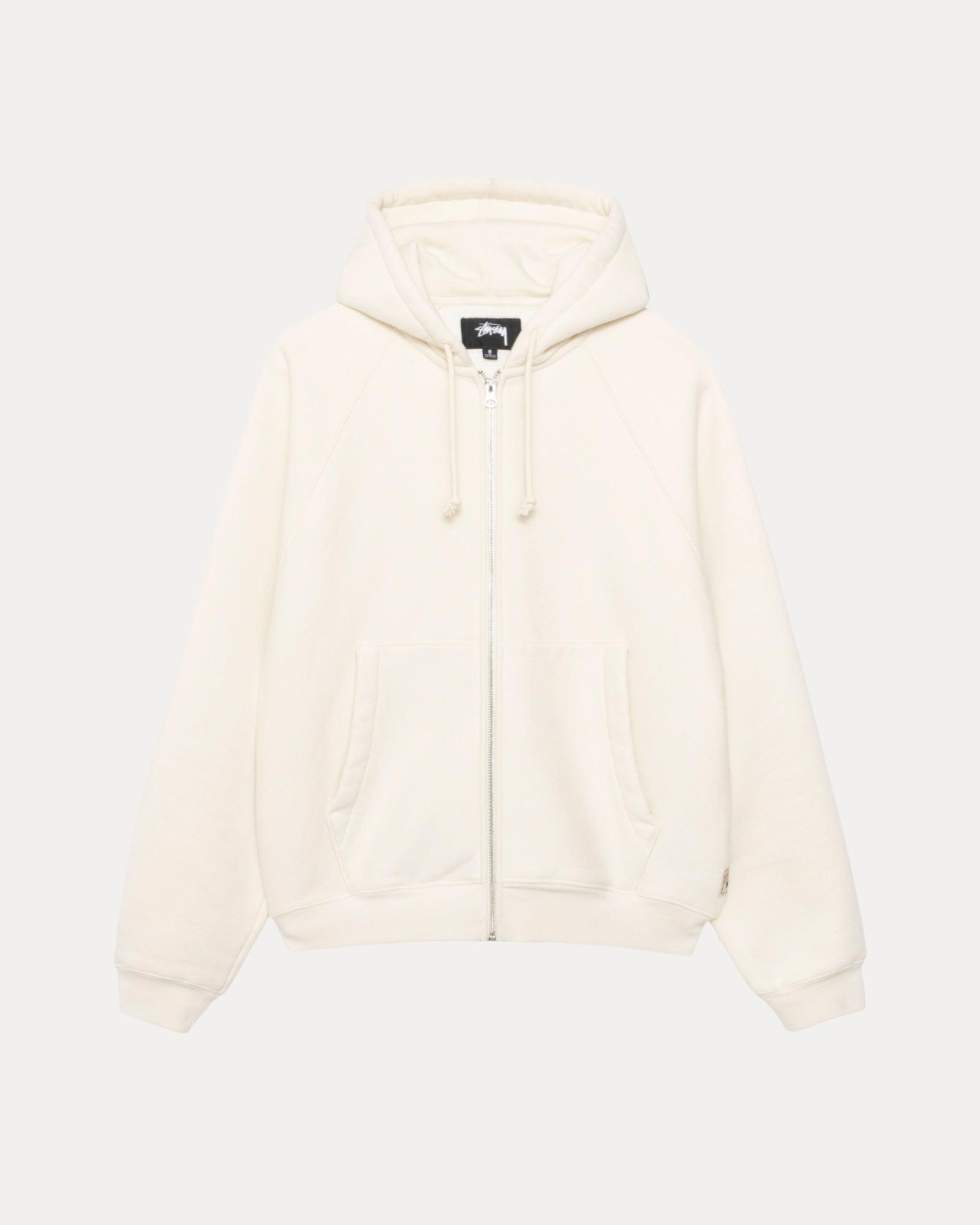Relaxed zip-front hooded sweatshirt in a heavy 15.8oz cotton blend fleece. Stüssy authentic workgear label sewn at the side. - Raglan sleeve - Round woven drawcord - #5 YKK zip front closure - Ribbed cuffs and hem - Kangaroo pocket - Relaxed fit - Unisex - Material: 66% cotton / 34% polyester - Imported