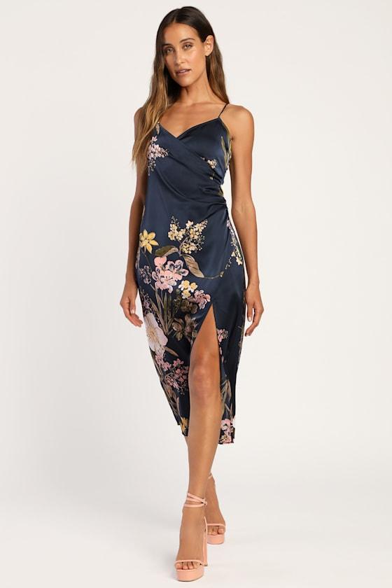 Feel like a queen for the day in the Lulus Remarkable Entrance Navy Blue Floral Print Satin Midi Dress! Sleek woven satin, with stunning hues of pink and green floral print, shapes this dress that has adjustable spaghetti straps and a surplice neckline. A fitted bodice tops light gathering at the waist and flows into a midi skirt with a front slit.