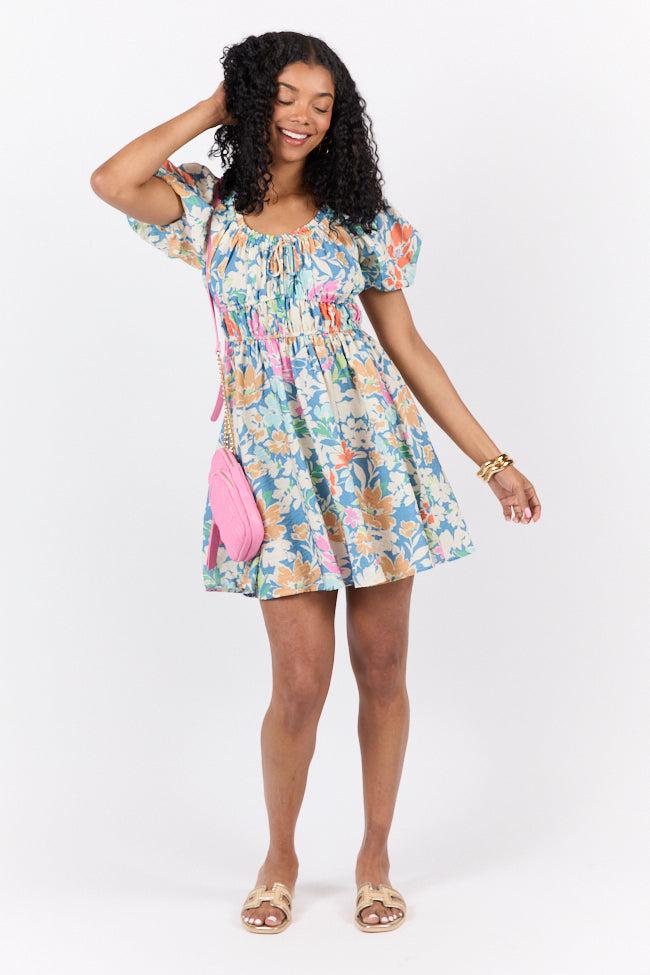 Details Teal Multi Floral S/S Mini Dress Fabric has some stretch Short sleeves, square neckline, elastic waistband, bow neckline detail Unlined Size small from shoulder to hem: 25.5" Material and Care 80% rayon 20% nylon Hand wash cold, line dry Patterns may vary Materials may have natural variations Colors may vary from different viewing devices.