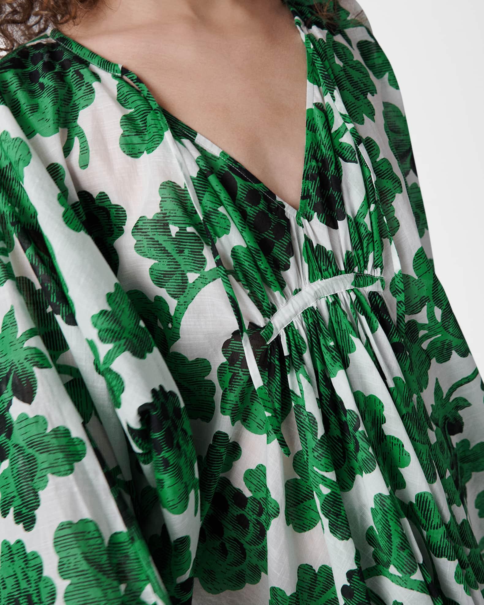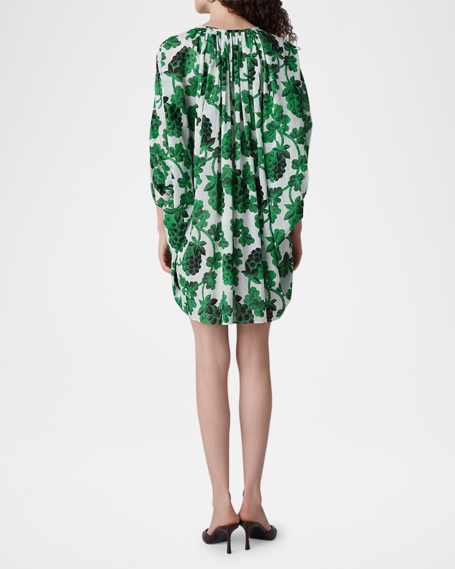 Diane von Furstenberg "Remi" mini dress in a viney fruit print with ruches finishes Approx. 37"L from shoulders to hem V neckline; front self-tie 3/4 dolman blouson sleeves Gathered empire seam Hem falls above the knee Shift silhouette Slipover style Cotton/silk Imported