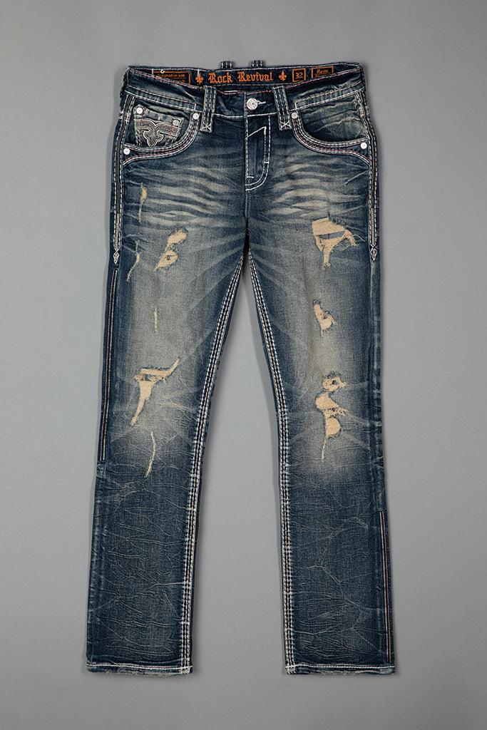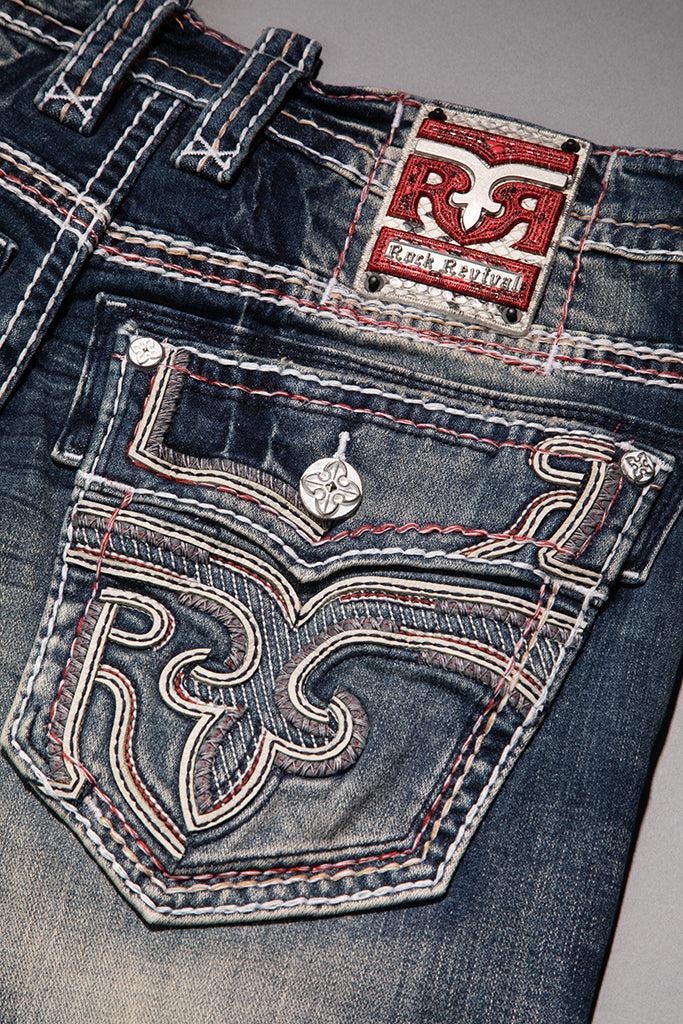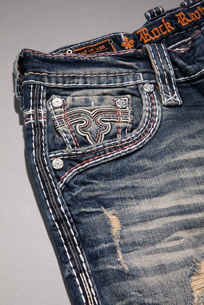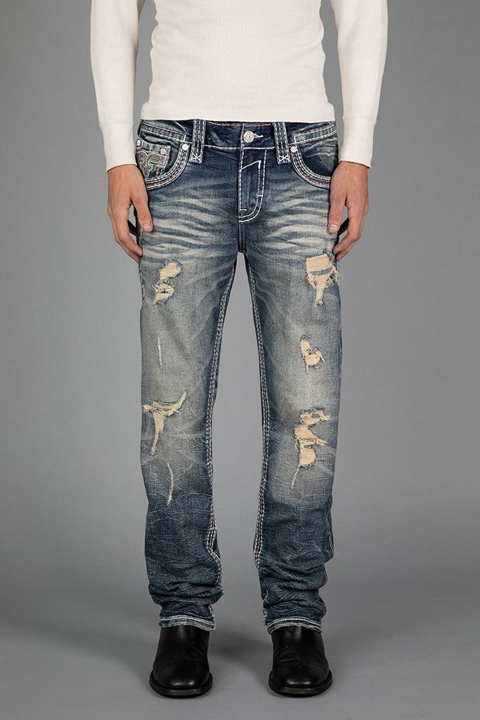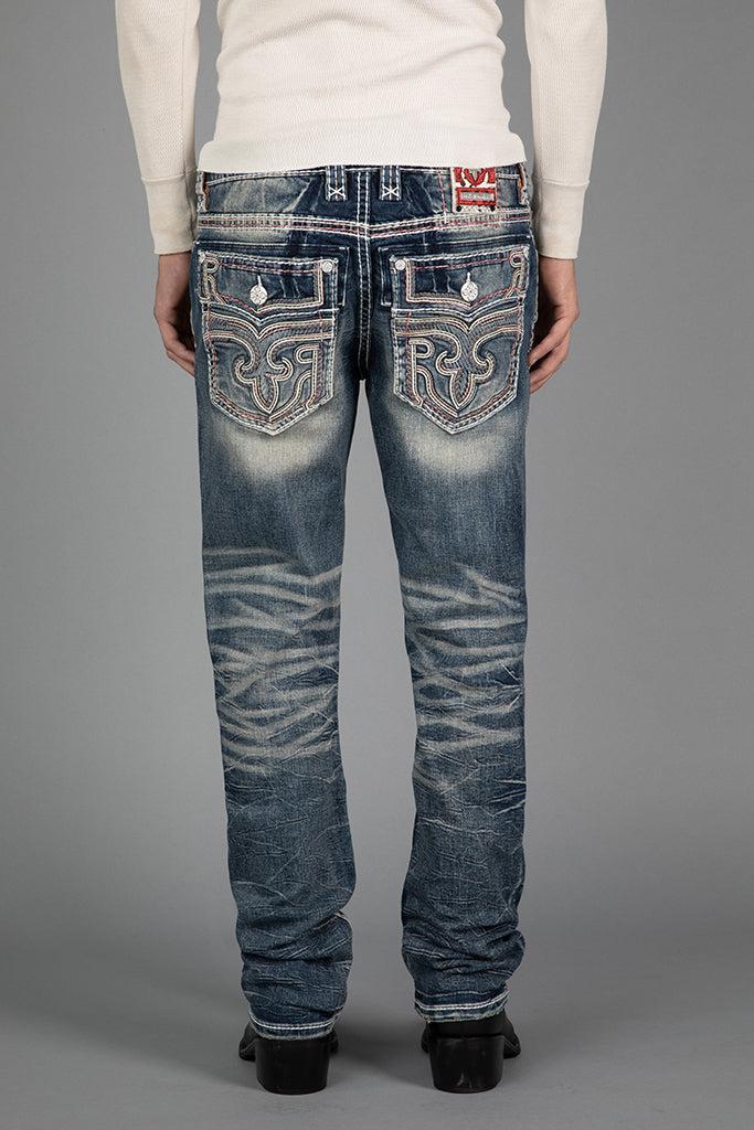 Straight-fit jean featuring white brushed hardware. Red thread "Fleur de Lis" embroidery on the back pockets. Heavy distressing, hand whiskers, and red snake-print emblem detail. Designed with care and creativity in Los Angeles, California.