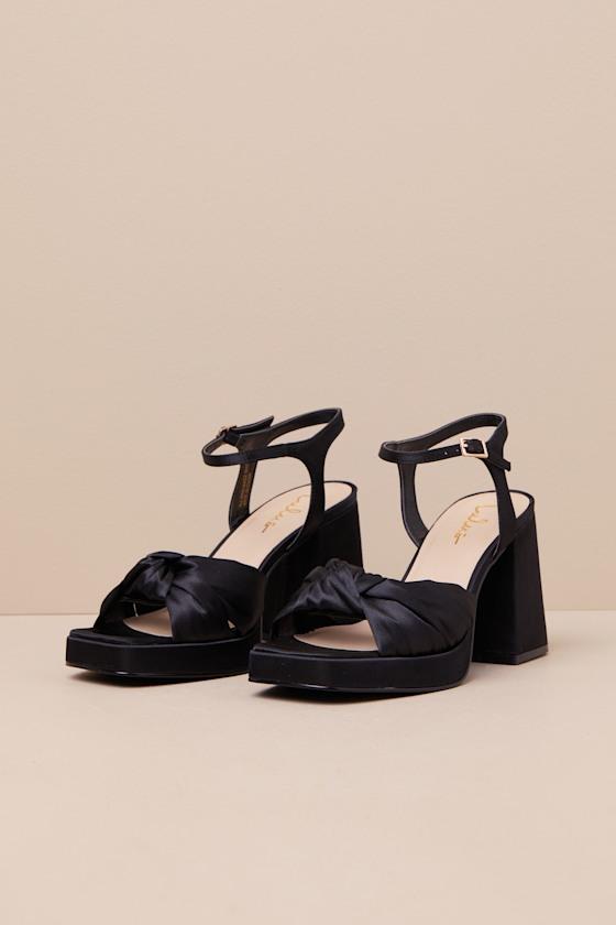 We recommend styling the Lulus Remie Black Satin Knotted Platform High Heel Sandals with any look that needs an extra dash of fabulousness! Sleek woven satin shapes these iconic heels that feature a trendy square footbed (atop a 0.75" toe platform) and gather straps that create a wide, knotted peep-toe upper. A matching quarter strap secures around the ankle with a gold buckle, all atop a chunky block heel.