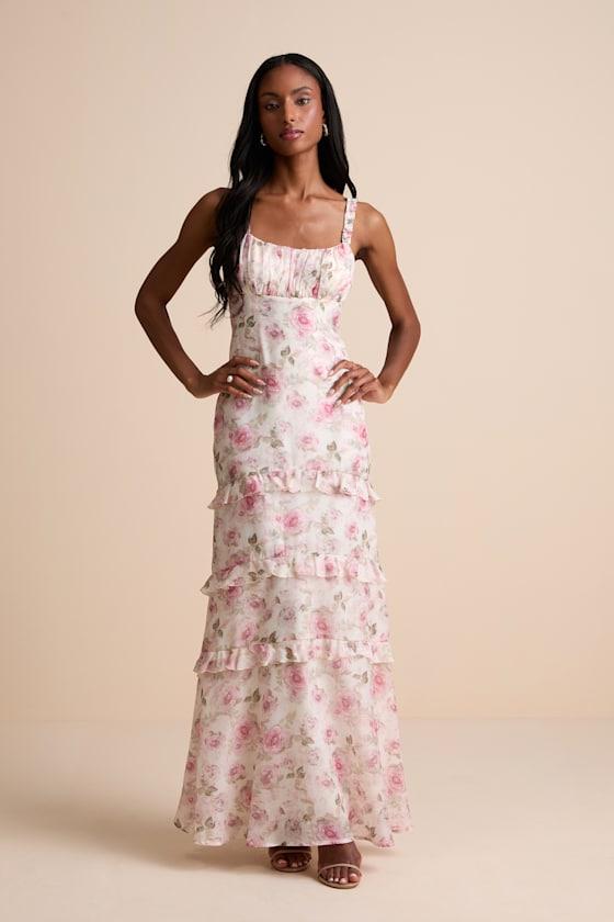 With a dreamy floral print and an airy woven construction, this ethereal maxi dress will make any crowd swoon the moment you arrive. Ruffled, adjustable straps support a gathered bodice and a romantic empire waist that sits atop a floaty A-line skirt, accentuated with ruffles for an elegant tiered effect. Hidden back zipper/clasp.