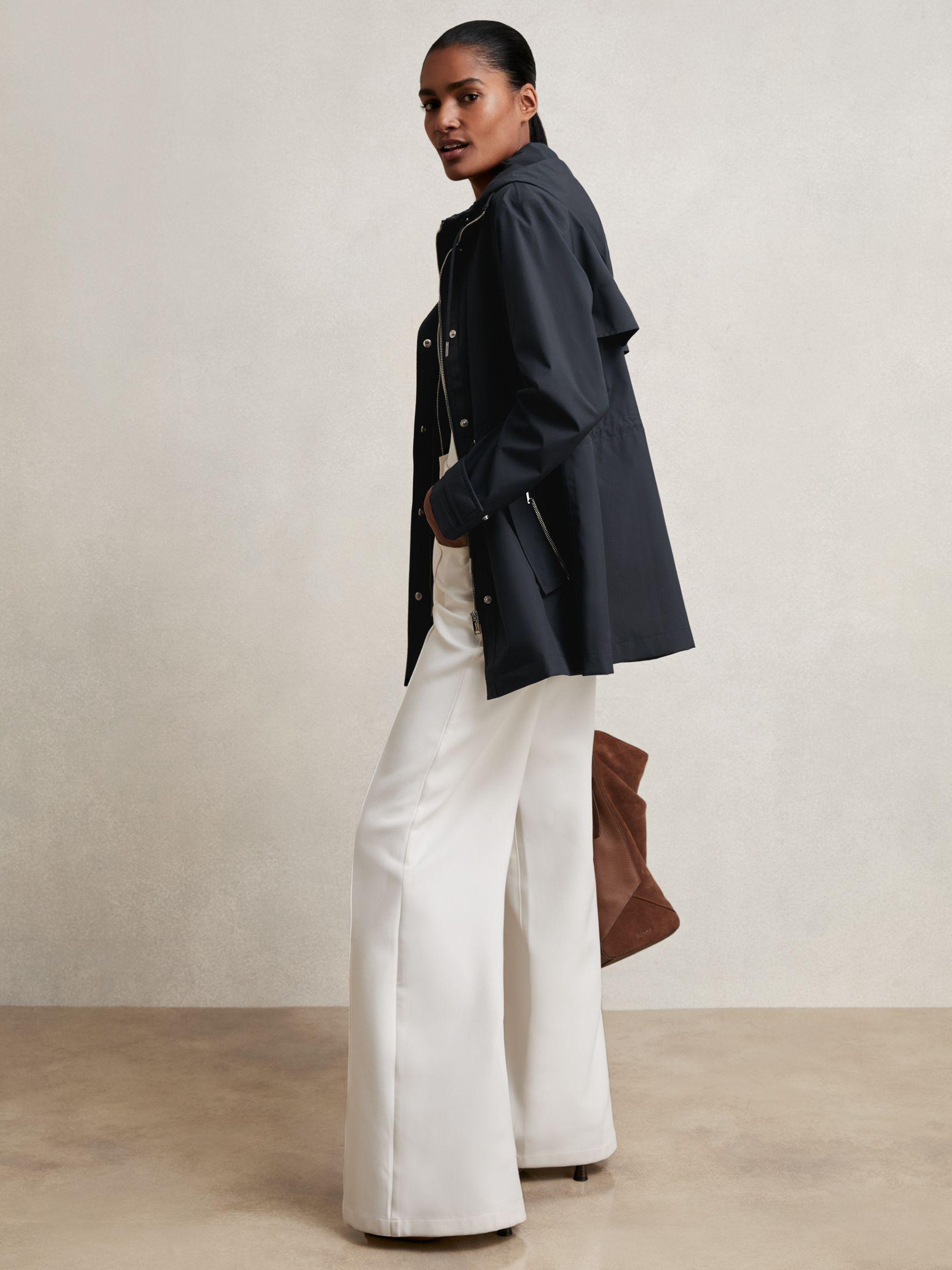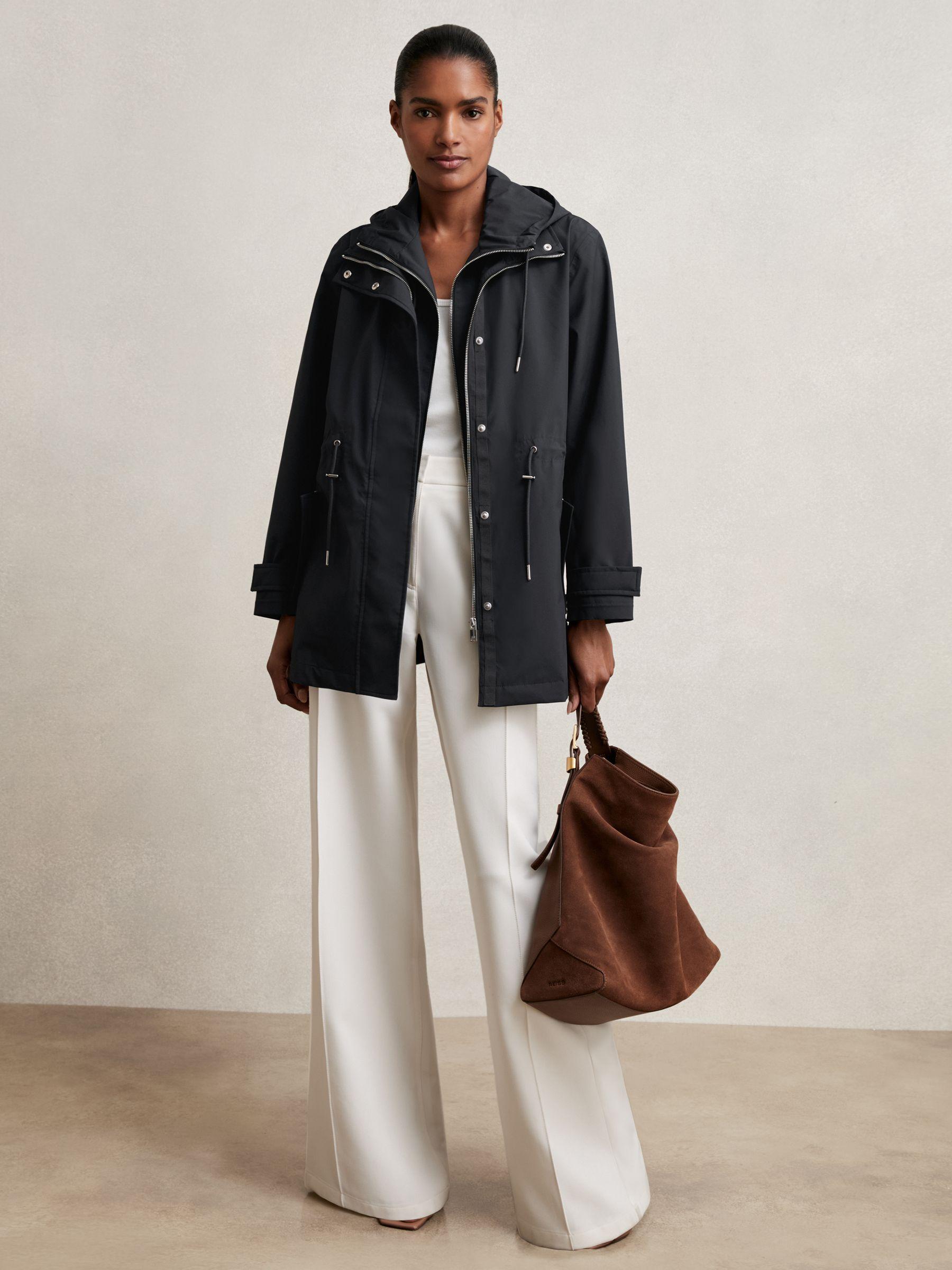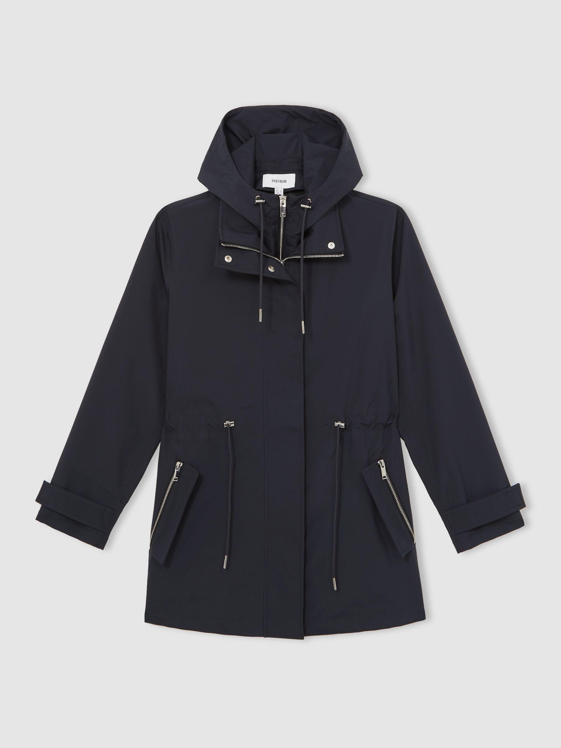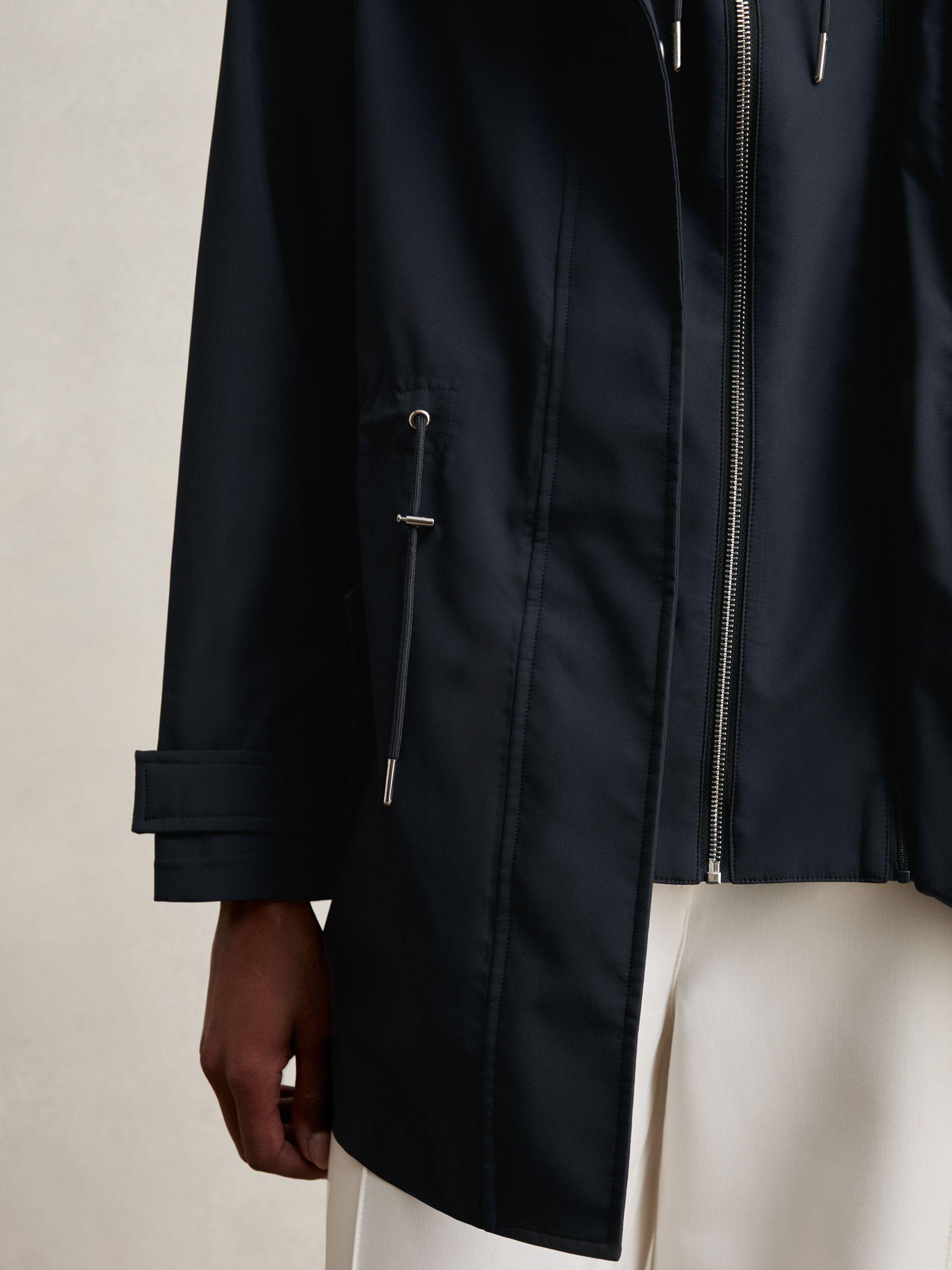 The Tia rain coat features a removable hooded insert for adaptable styling in changeable weather. Side zip pockets, adjustable cuffs, and an internal drawstring waist lend practical detail to its streamlined silhouette. Removable hooded insert Side zip pockets Adjustable press-stud cuffs Internal toggle drawstring waist Front zip with press-stud placket The model is wearing a size 8 Measurements of model: Height 5 10" / 177.8cm