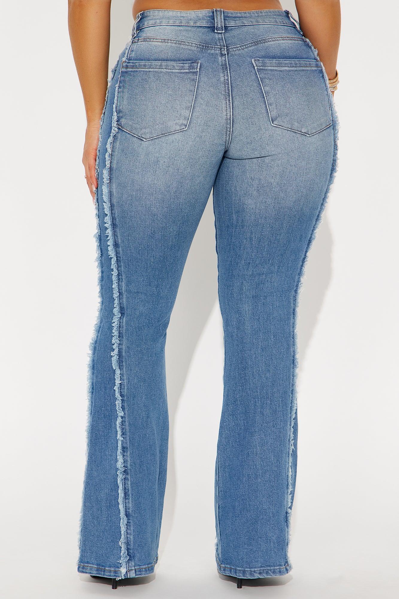 Available In Medium Wash. Flare Leg Jean 5 Pocket Frayed Detail 10" Mid Rise 32" Inseam Low Stretch Disclaimer: Due To The Specialized Wash, Each Garment Is Unique. 90% Cotton 6% Rayon 1% Spandex 3% Other Fiber Imported