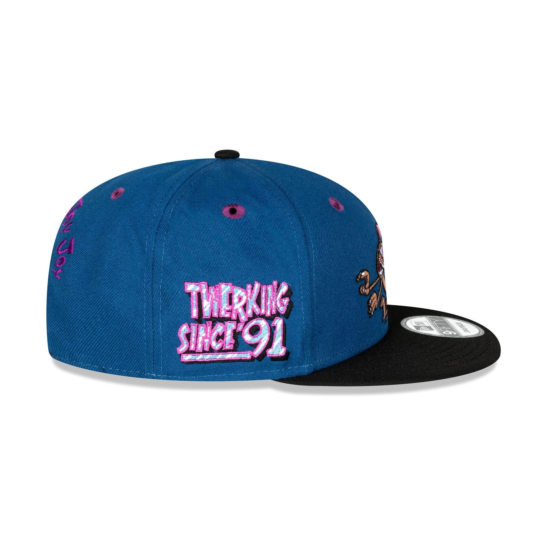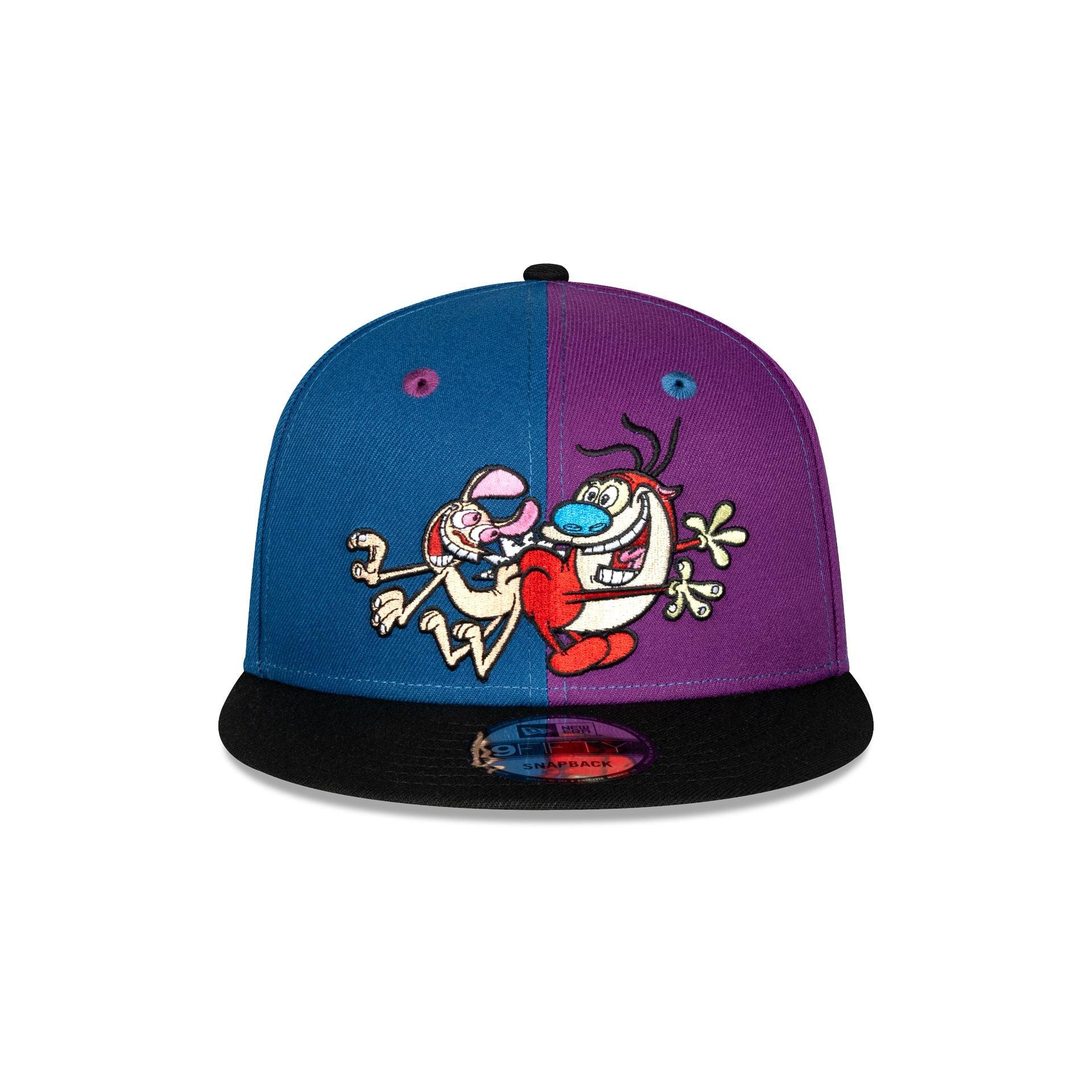 The Ren & Stimpy 9FIFTY Snapback Hat features an embroidered Ren & Stimpy character patch against a purple and blue split panel. Additional details include a Twerking Since '91 patch at the right-wear side and a "Happy Happy Joy Joy" embroidery above a snapback closure at the rear.