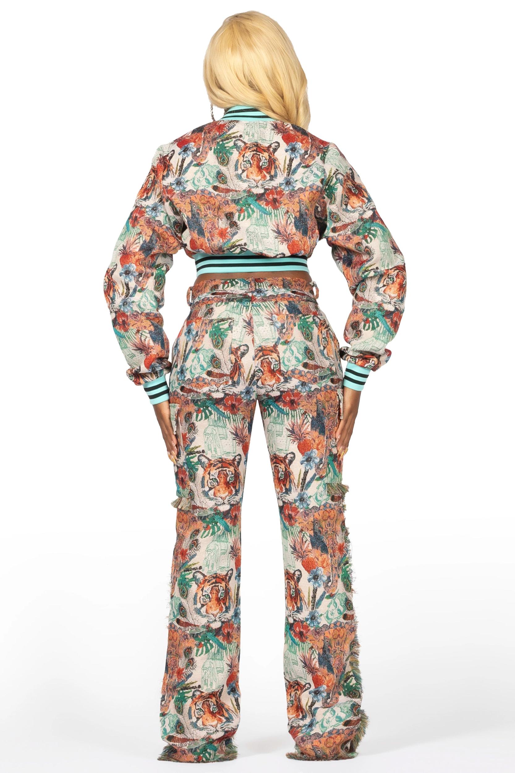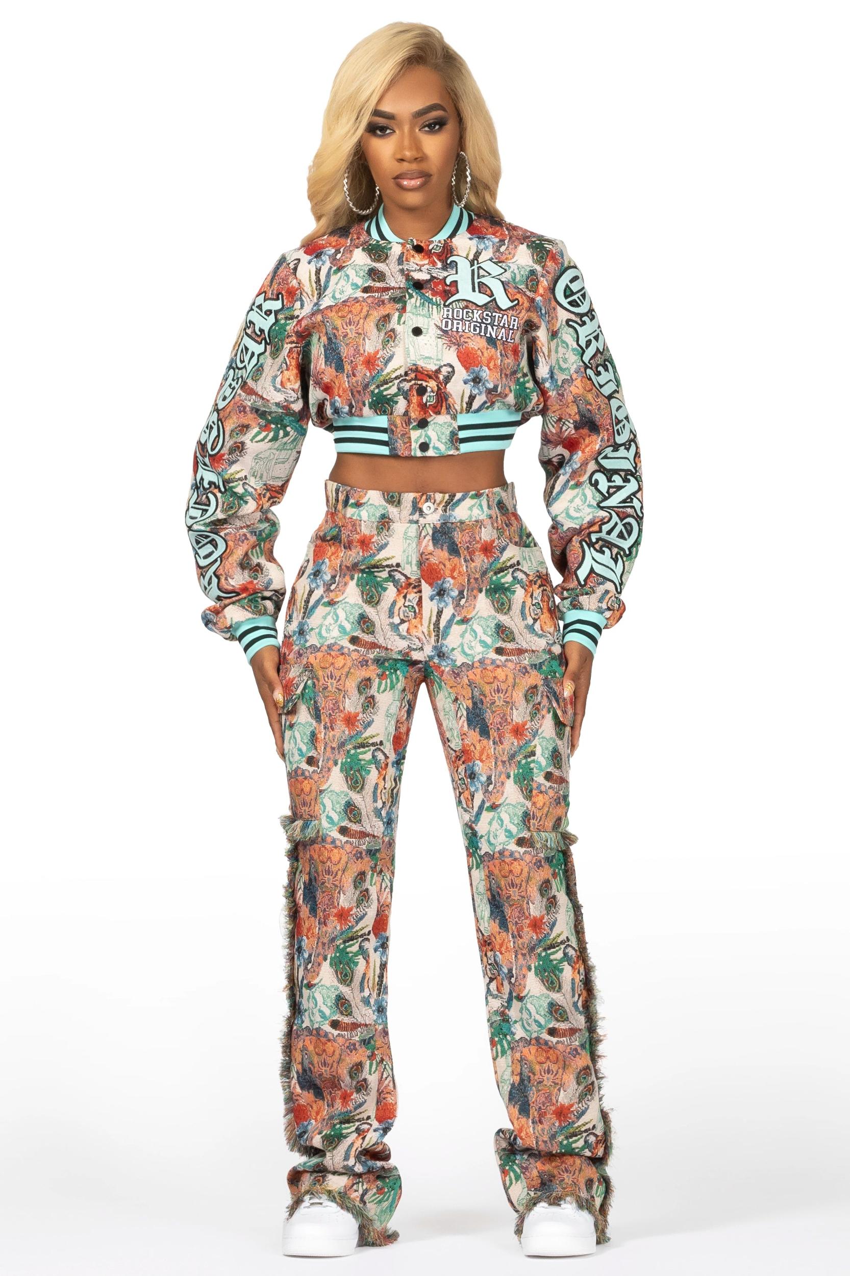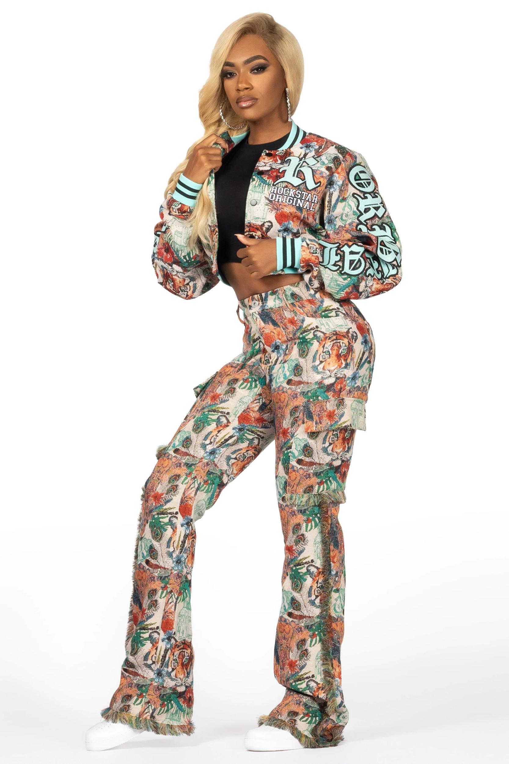 An urban tapestry crop bomber jacket for women in beige. Designed with contrast botanical fabric and custom embroidery for the perfect layering piece. Striped ribbed knit trims Snap button closure Tapestry fabric Cropped length Embroidered patches Custom RSO logo patches