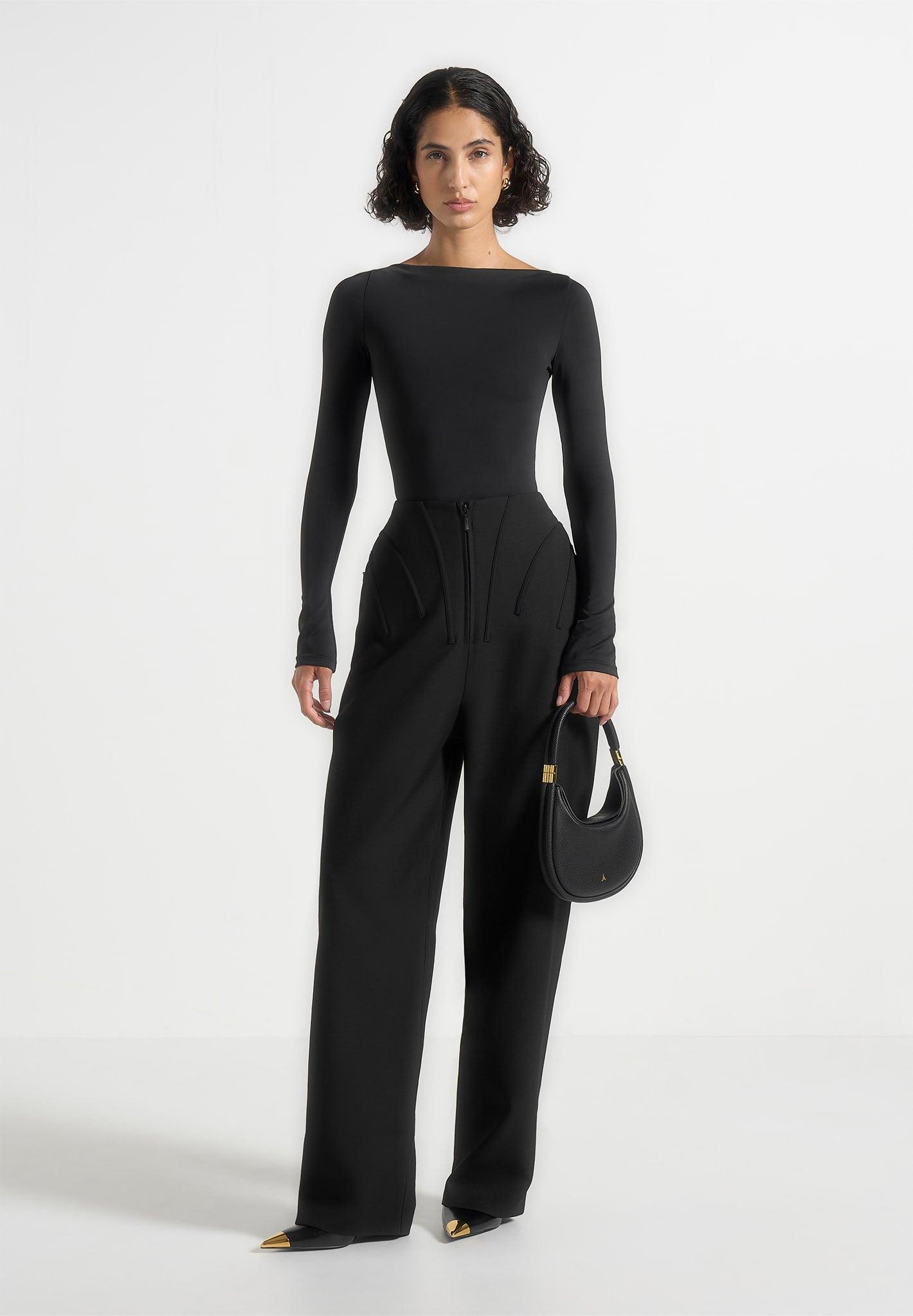 This high-waisted corset trousers is designed to sculpt and define, with structured boning that enhances the waistline. A front zip closure keeps the silhouette sleek and streamlined, while the elasticated back ensures flexibility and comfort. High-waisted corset silhouette for structured definition Corset boning for added shape and contouring Front zip closure for a sleek, functional finish Elasticated back waist for a flexible, comfortable fit Black Eiffel zip-through side pockets for a signature detail