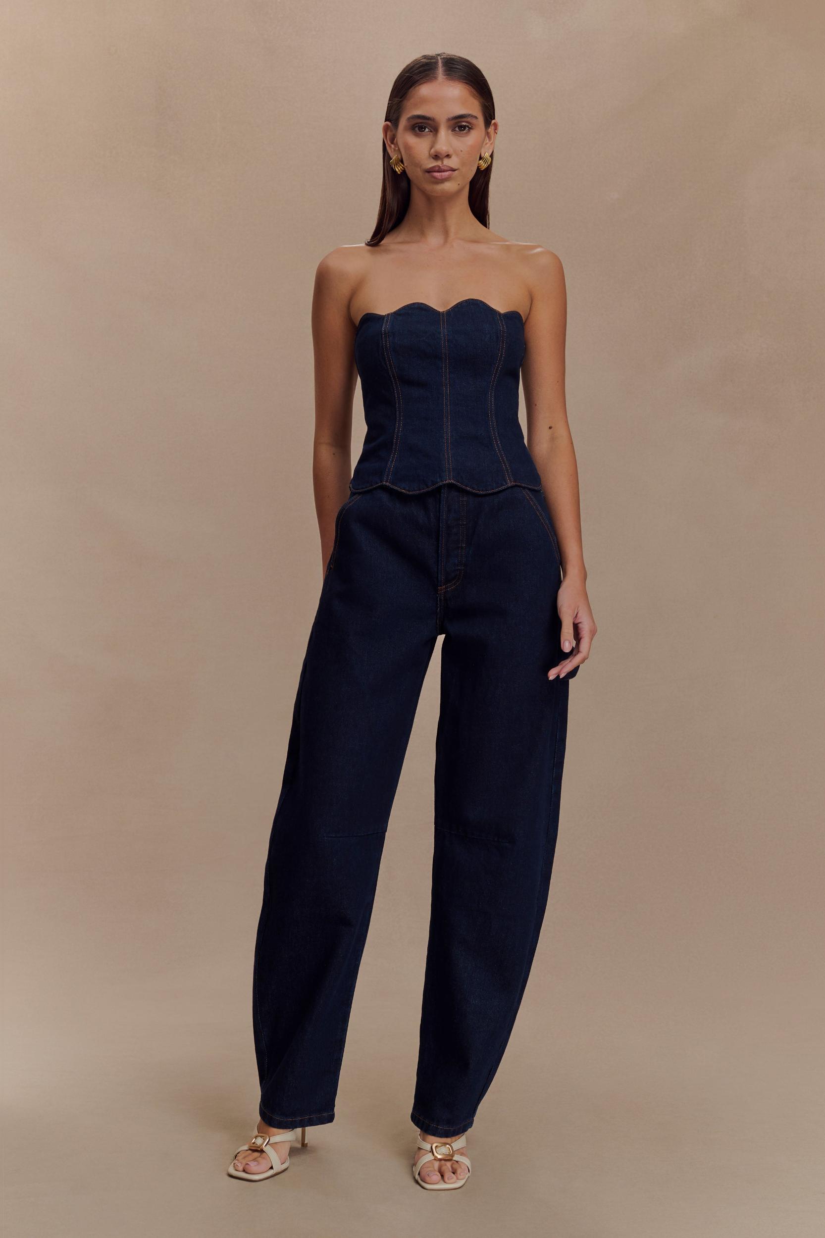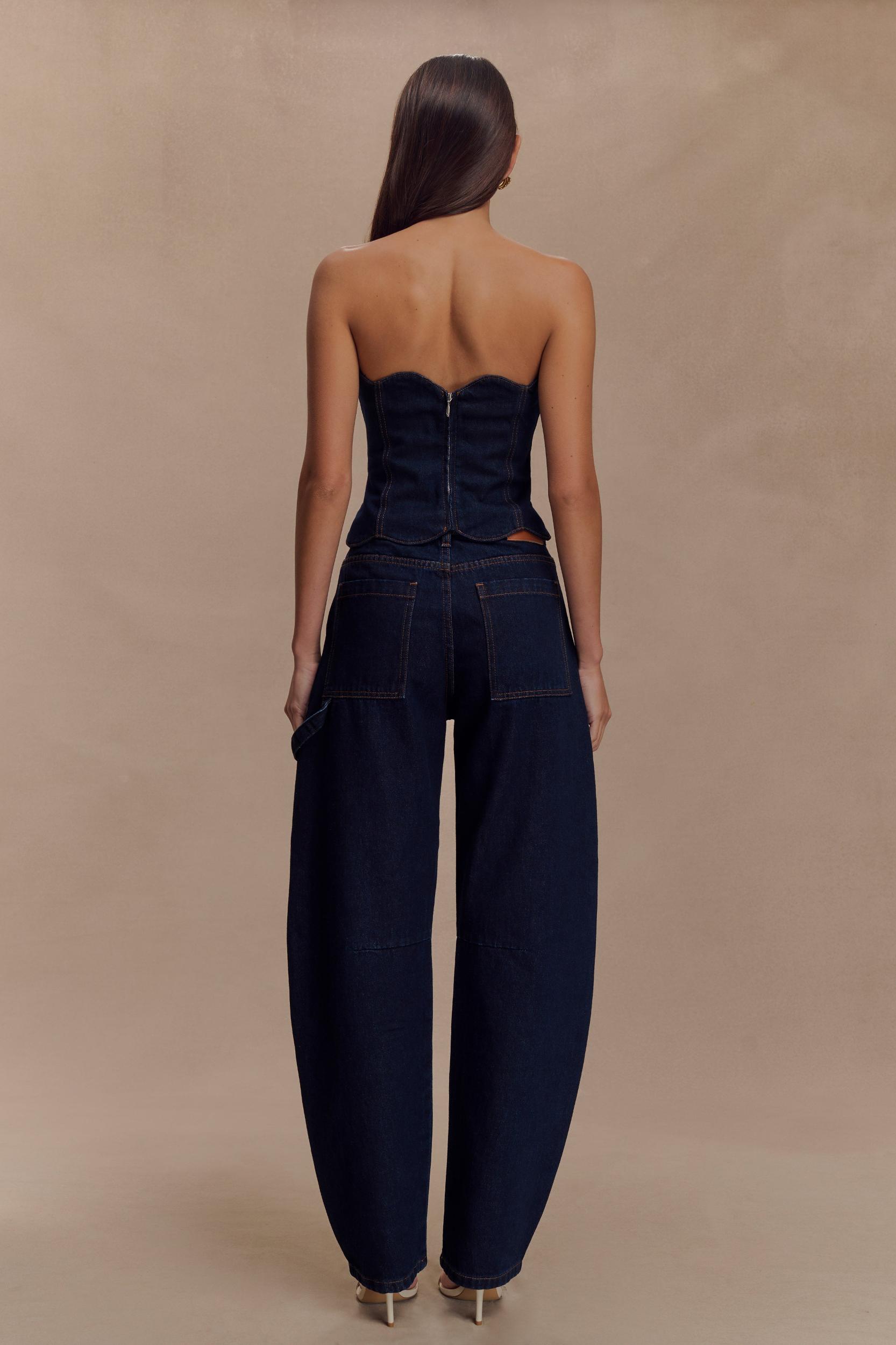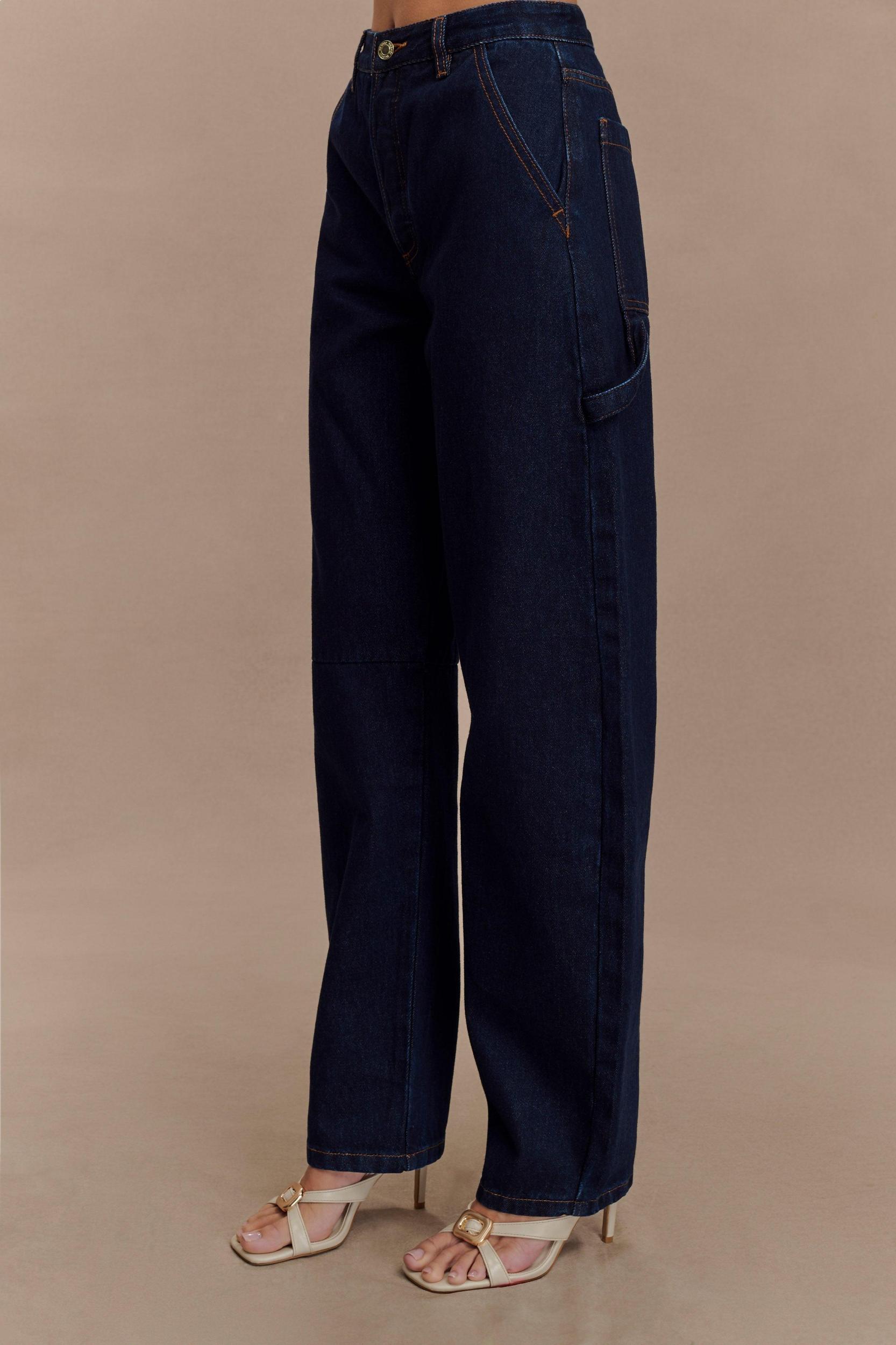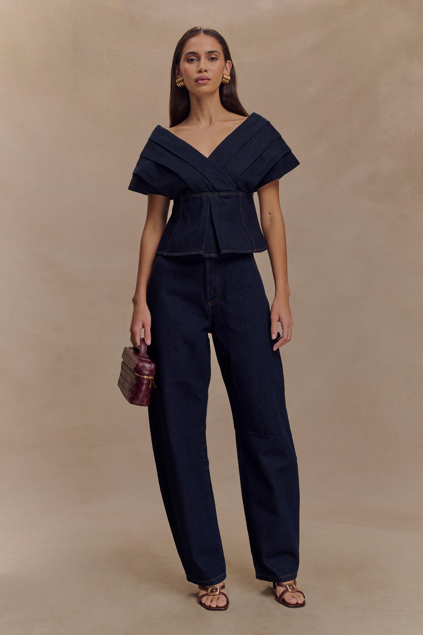 Denim in a new dimension. Step up your denim game with the RENATA Barrel Denim Jeans, a statement silhouette designed for modern impact. Featuring a low-rise waist and voluminous balloon legs, these jeans are finished with a fly front opening and a gold button for a refined touch. Back yoke detailing with topstitching adds structure, while side straps, belt loops, and functional pockets bring both style and utility. Crafted in classic denim, this dress delivers a fresh take on a wardrobe essential.