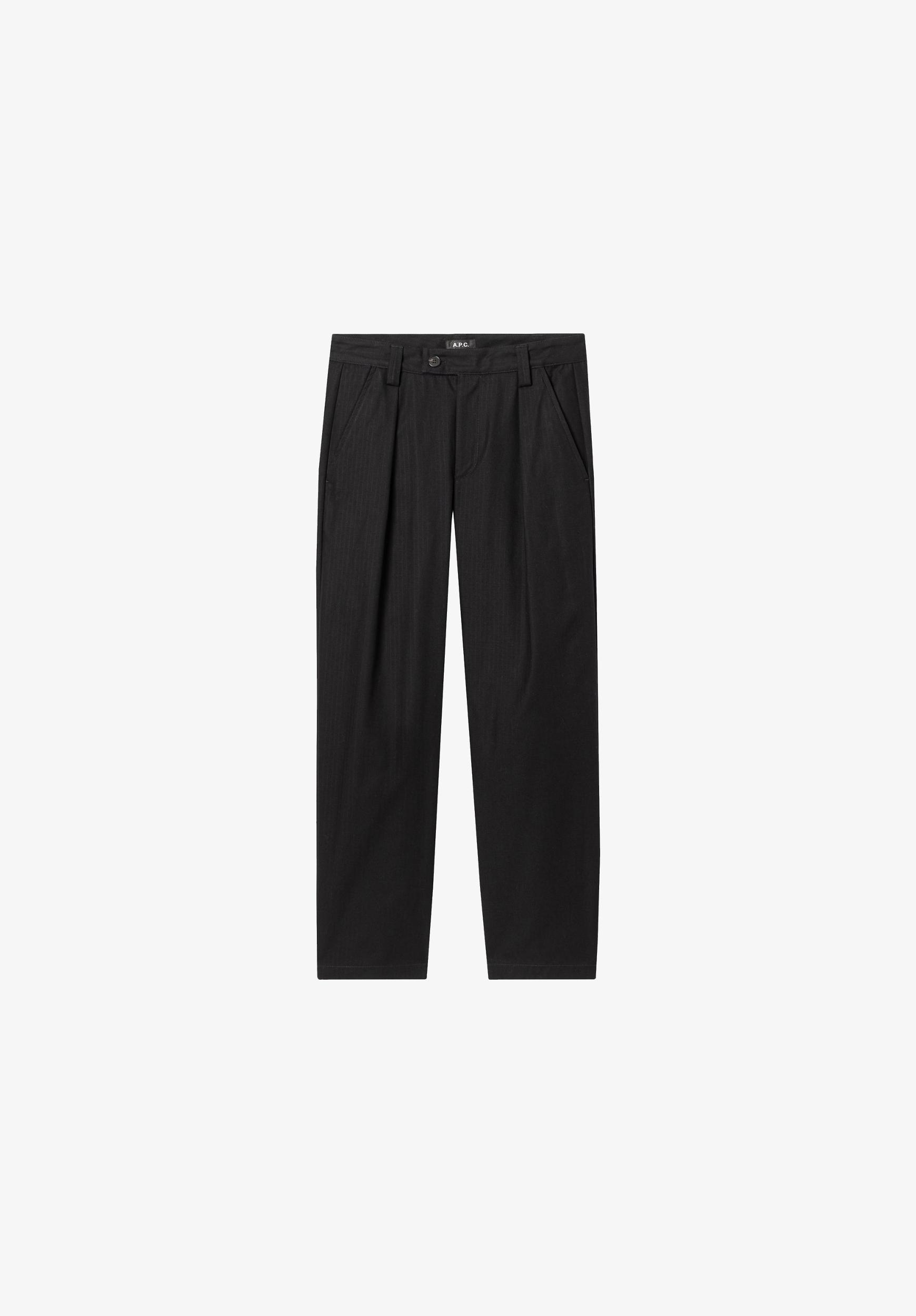 - Wide leg with a slight carrot cut. - Front pleats at the waist. - Off-centre buttoned placket. - Zip fly. - Two side pockets and one back flap pocket. - 100% organic cotton.