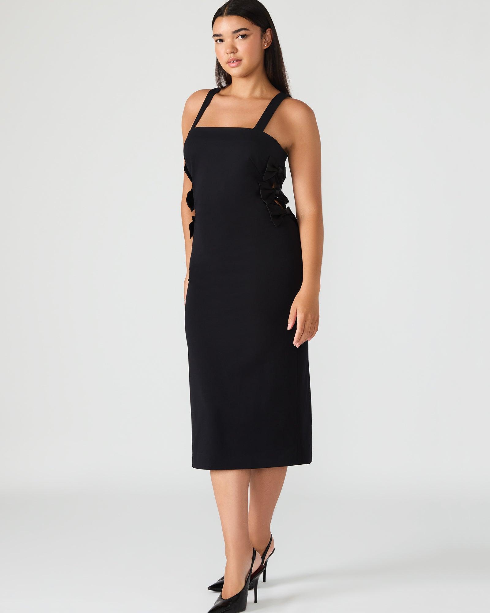 This RENE expertly designed midi-length dress features a form-fitting silhouette that accentuates your shape with elegant cut-outs on the sides. Delicate bows add a refined touch, enhancing its sophisticated black fabric. Perfect for occasions where style and subtle allure are essential. Form-fitting midi dress Cutouts on the side Delicate bows 63% polyester 33% raton 4% elastane Hand wash Breanna is 5ft 9in and is wearing a size 10 Madison is 5ft 8in and is wearing a size 4 Imported