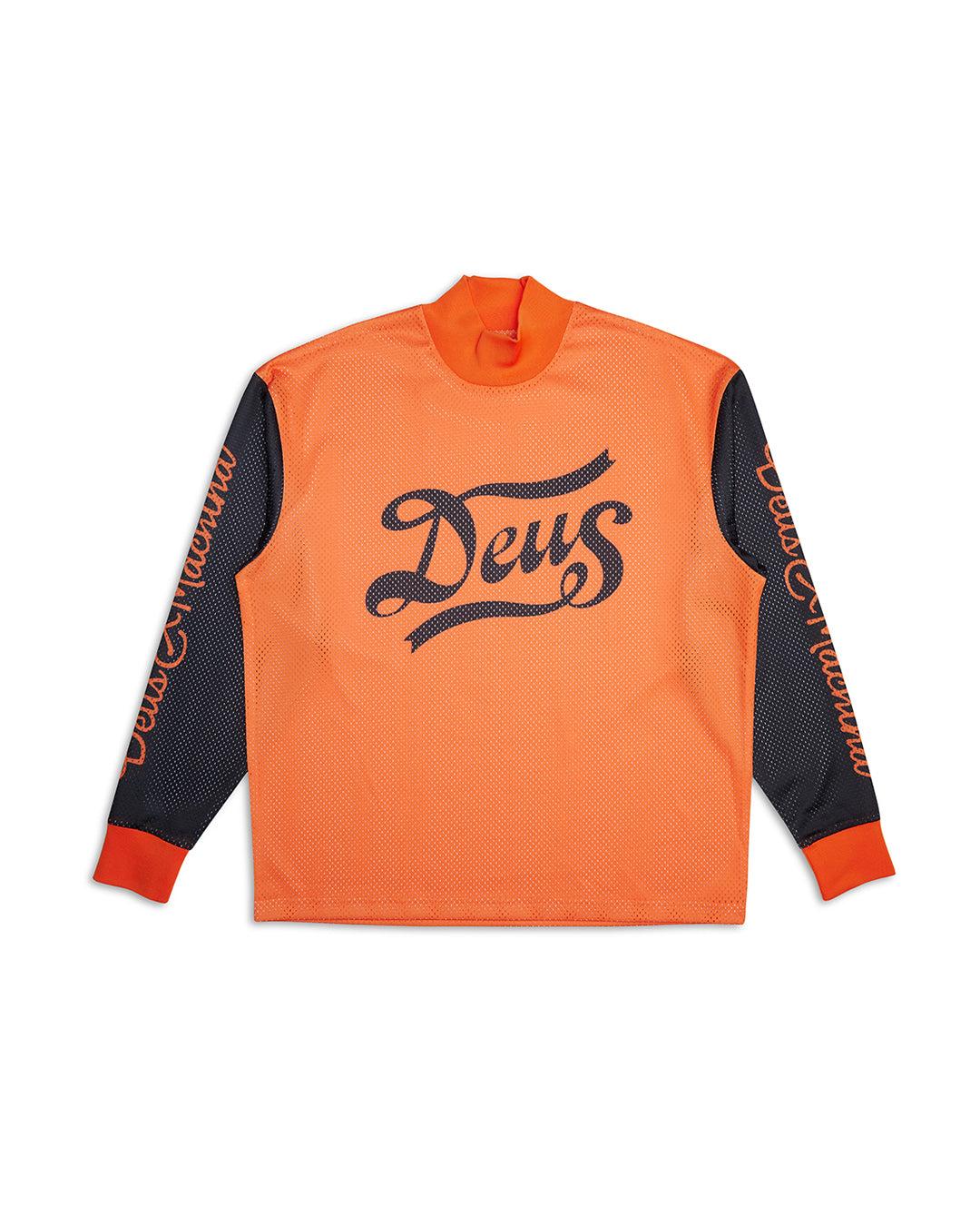 Loose Fit Long Sleeve Moto Jersey With Mock Neck Collar, Front And Sleeve Prints, In A Polyester Mesh Fabrication With A Garment Wash