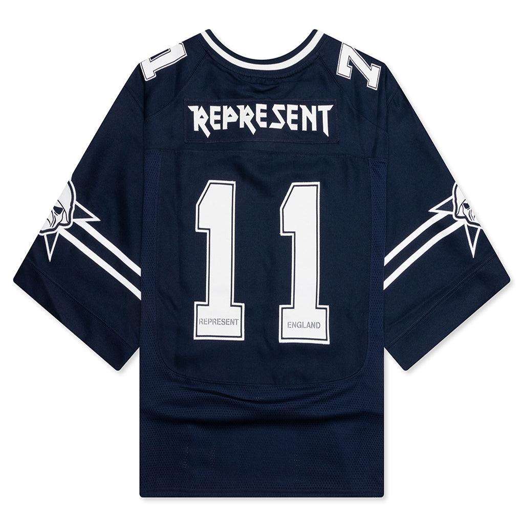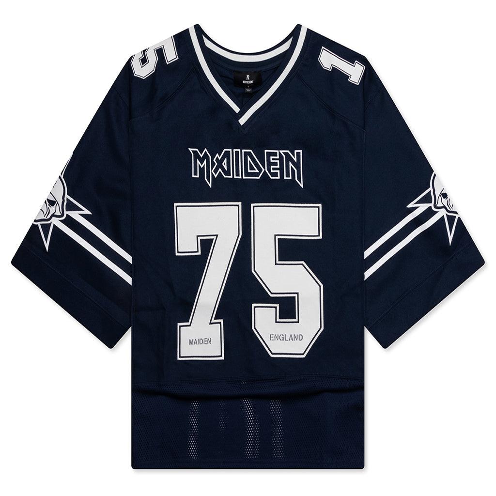 Introducing the Represent x Iron Maiden collaboration—a tribute to the band's 50th anniversary. The Represent x Iron Maiden Anniversary Jersey reimagines the classic football jersey silhouette with Maiden England-inspired designs. Constructed with mesh and woven panelling, this jersey is cut to have an oversized, boxy fit with a cropped length. Detailed with appliqué numbers, printed artwork, and embroidered graphics. Mesh and woven fabric construction Oversized, boxy fit Drop shoulder Cropped length Ribbed V-Neck collar Appliqué, print and embroidered graphics Iron Maiden woven label Style No: MLM100575-07 MLM100575 07