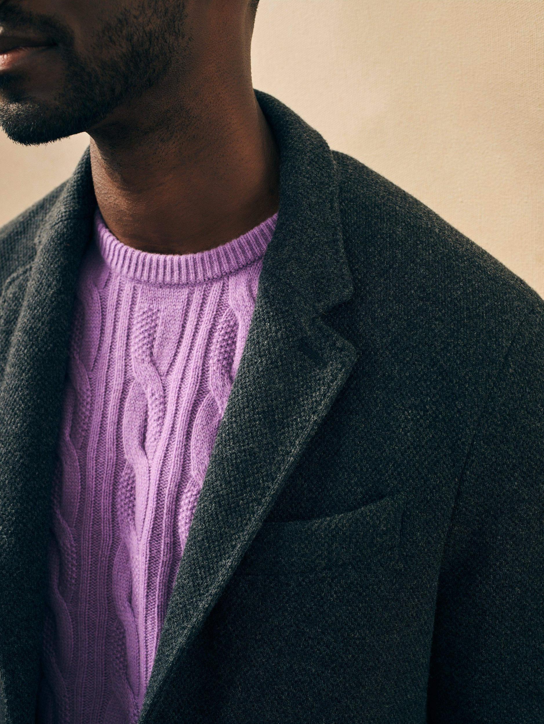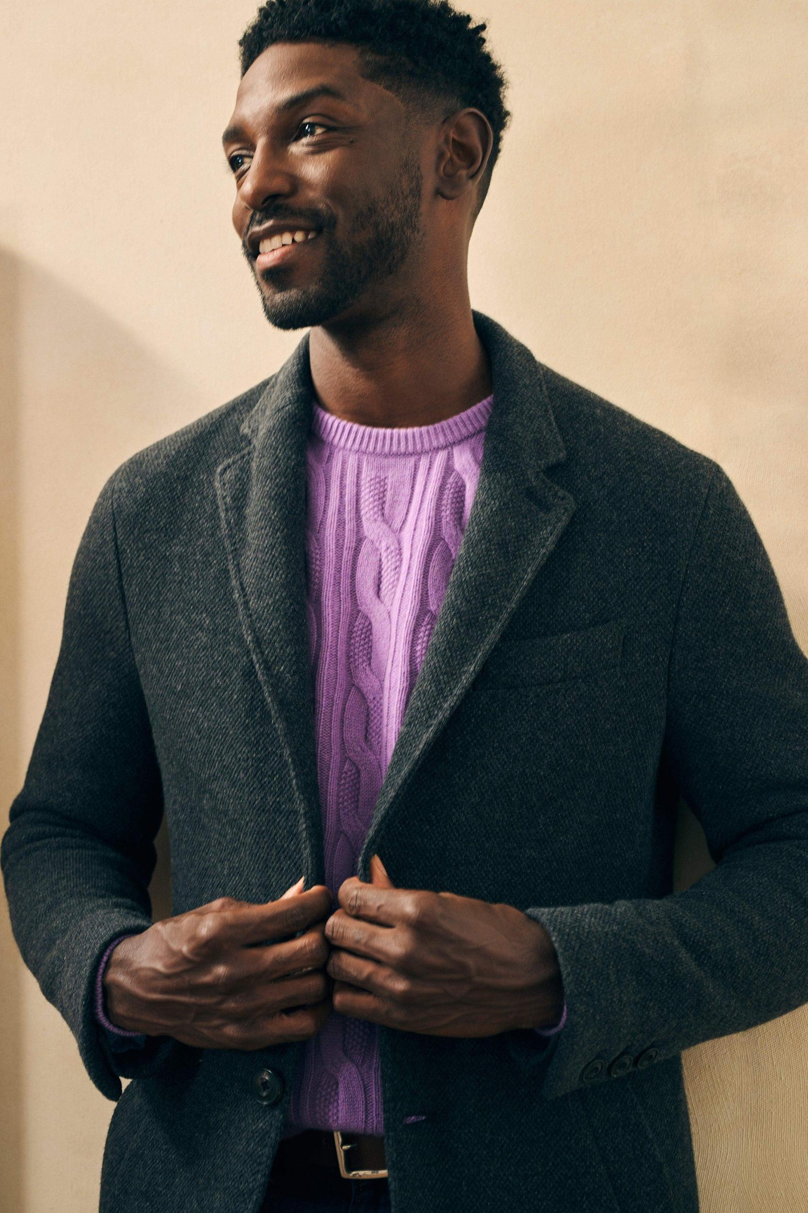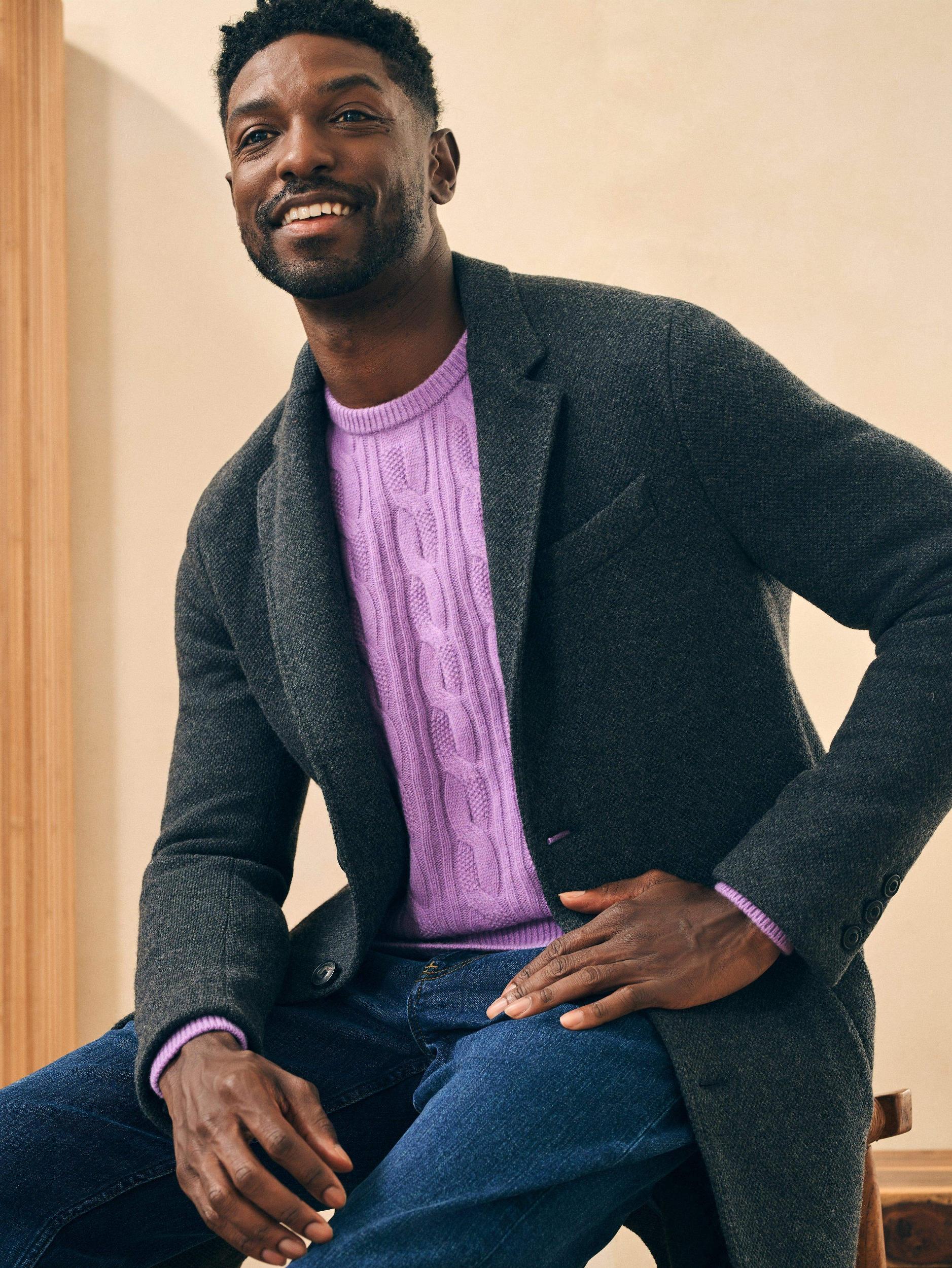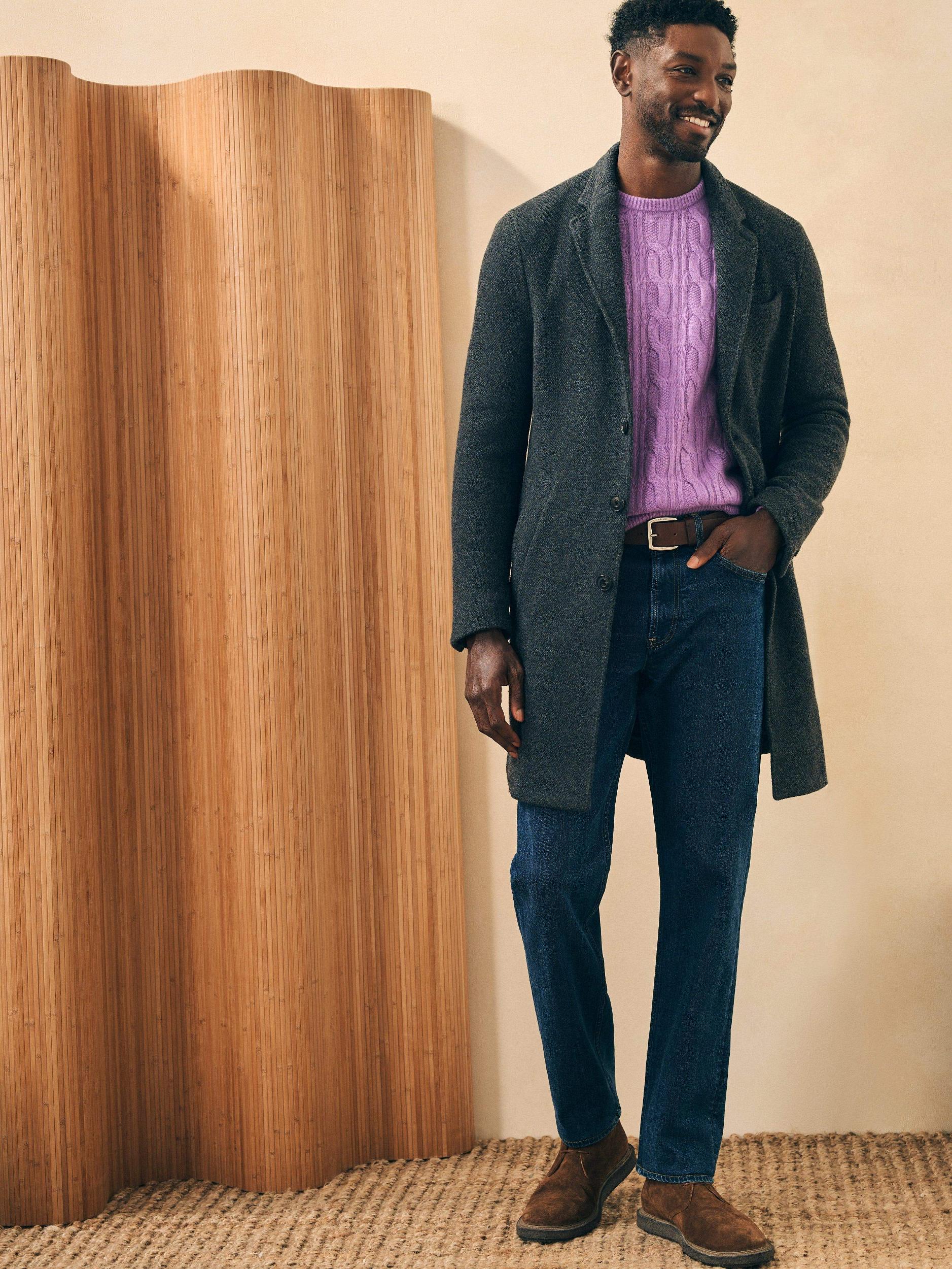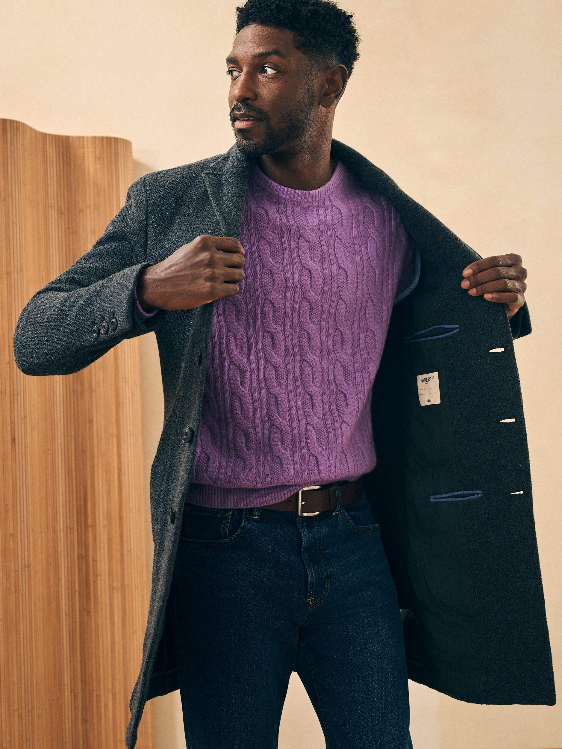 Cut from a double-faced knit fabric and tailored in Europe, this essential coat exudes timeless style done the Faherty way. Partially lined to preserve the stretch and keep it lightweight, this coat will definitely keep you warm even on the coldest winter days. Fit: Designed to layer over a sweater or button-down Detail: Three-button center front closure, Horn buttons, Hidden interior zip pocket, Partial lining, Button adjustable cuffs, Single vent at back Material: 50% Wool, 27% Polyester, 23% Nylon; Sleeve Lining: 100% Polyester; Invisible Metal Zipper; Buffalo Horn Buttons Model: Jamal is 6’2 wearing size Medium Care: Dry clean. Do not bleach. Cool iron if needed. MOH2230-CCL