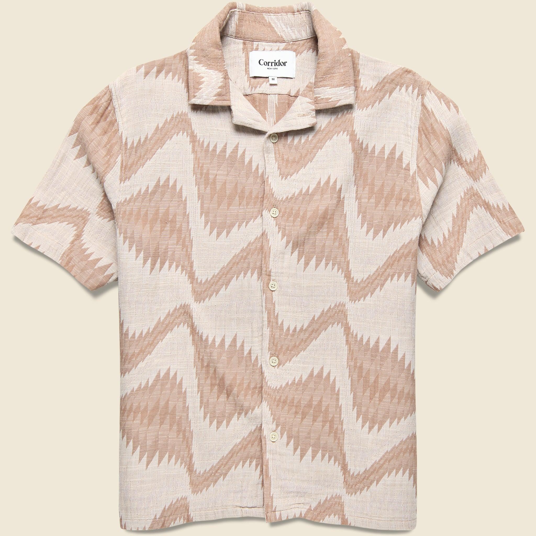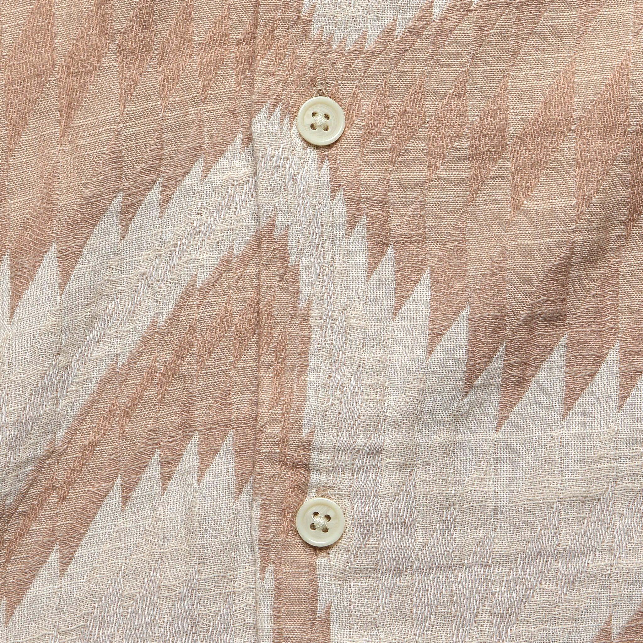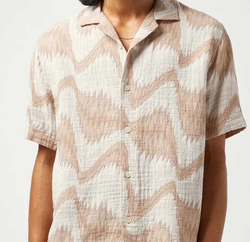 The Renosance Camp Shirt from Corridor is made from a lightweight, gauzy cotton fabric that features a custom jacquard woven pattern produced in Madras, India. It’s cut with a perfectly relaxed fit that runs true to size and has a simple 5-button placket, a slightly curved hem, and a classic camp collar to top it off.