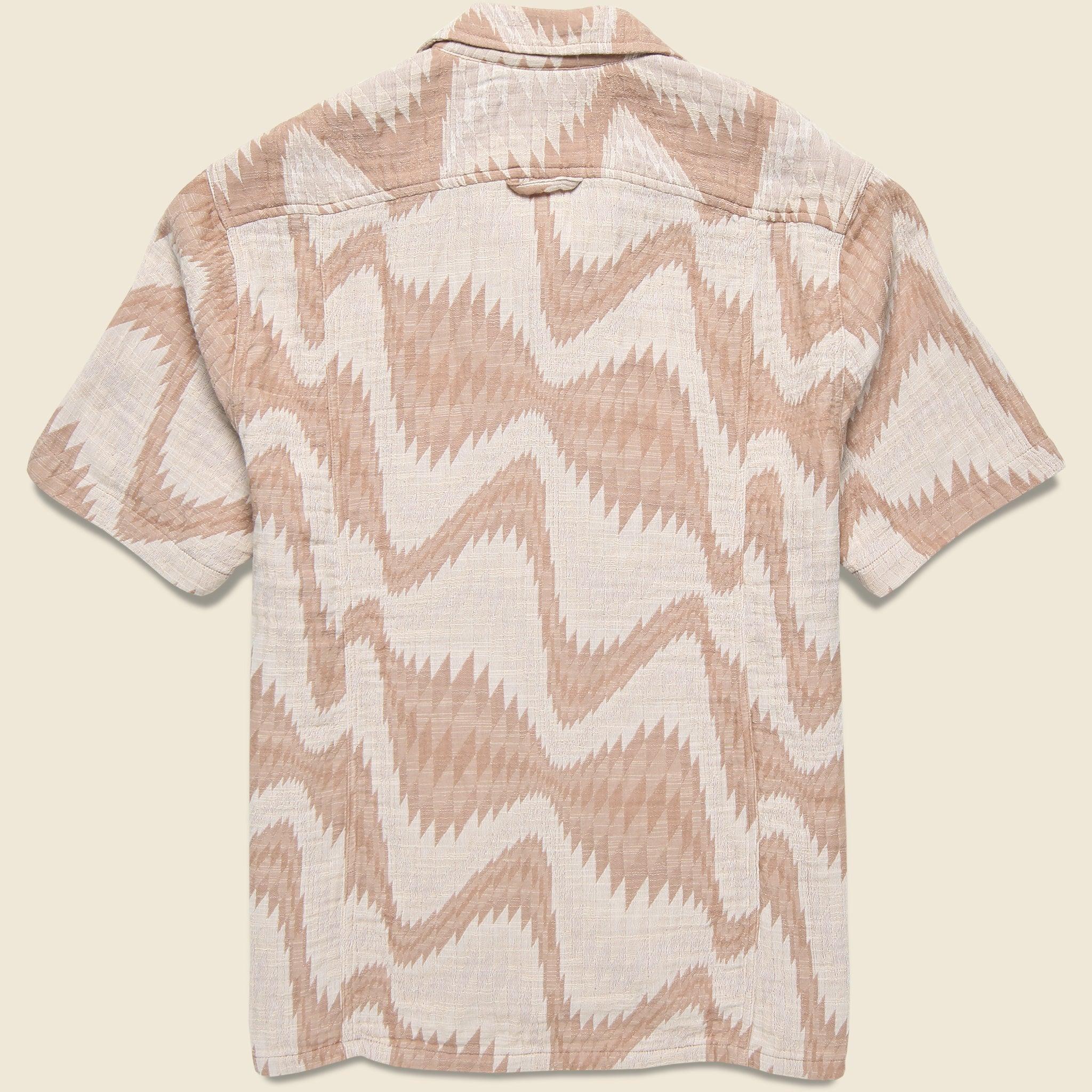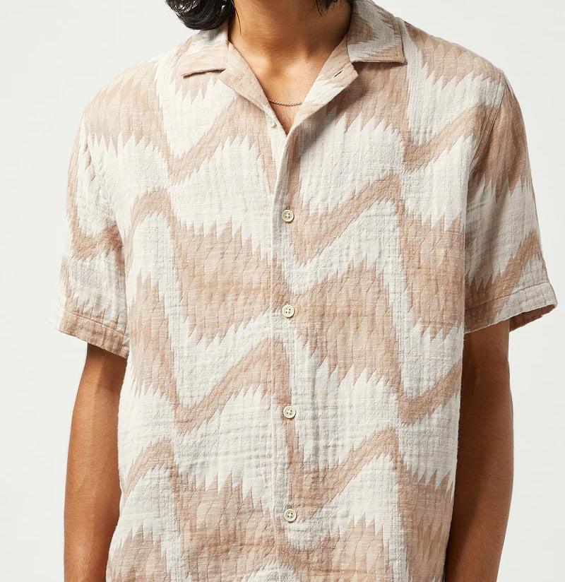 The Renosance Camp Shirt from Corridor is made from a lightweight, gauzy cotton fabric that features a custom jacquard woven pattern produced in Madras, India. It’s cut with a perfectly relaxed fit that runs true to size and has a simple 5-button placket, a slightly curved hem, and a classic camp collar to top it off. Lightweight cotton Custom jacquard-woven pattern Simple 5-button placket Slightly curved hem Camp collar Relaxed fit that runs true to size We recommend taking your normal size Materials: 100% cotton The following measurements are for size Medium: Chest: 42” | Shoulder: 18” | Sleeve: 19” | Length: 28”