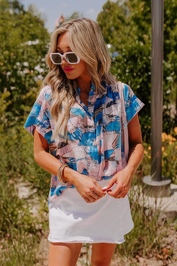 - This trendy top is perfect for your unique style! - Unlined material with a colorful abstract print and a satin finish - A v-cut neckline - Short sleeves - A button closure front - A relaxed silhouette hat ends in a rounded high-low hemline
