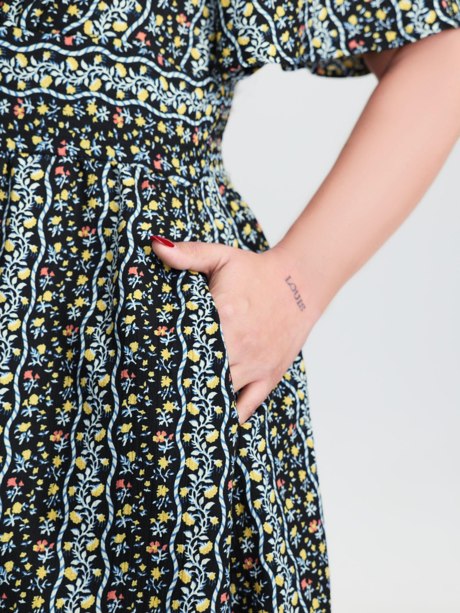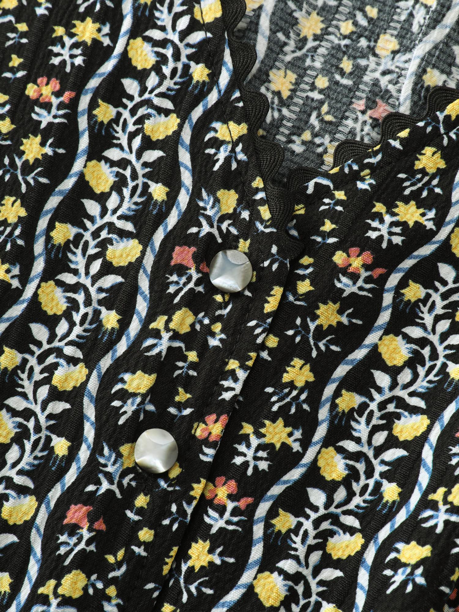 Shop Retro Floral Striped Shirred Waist Midi Dress now and redefine your style with confidence at BloomChic. Tailored for mid and plus-size women. This trendy Dress, sizes 10-30. You can never go wrong with BloomChic Dresses. Color:Black Flower;Style:Romantic;Neckline:V-neck;Sleeve Type:Ruffle Sleeve;Prints:Ditsy floral;Details:Gathered, Contrast, Shirred;Pocket:Side seam pocket;Belt:No-belt;Closure Type:Decorative button