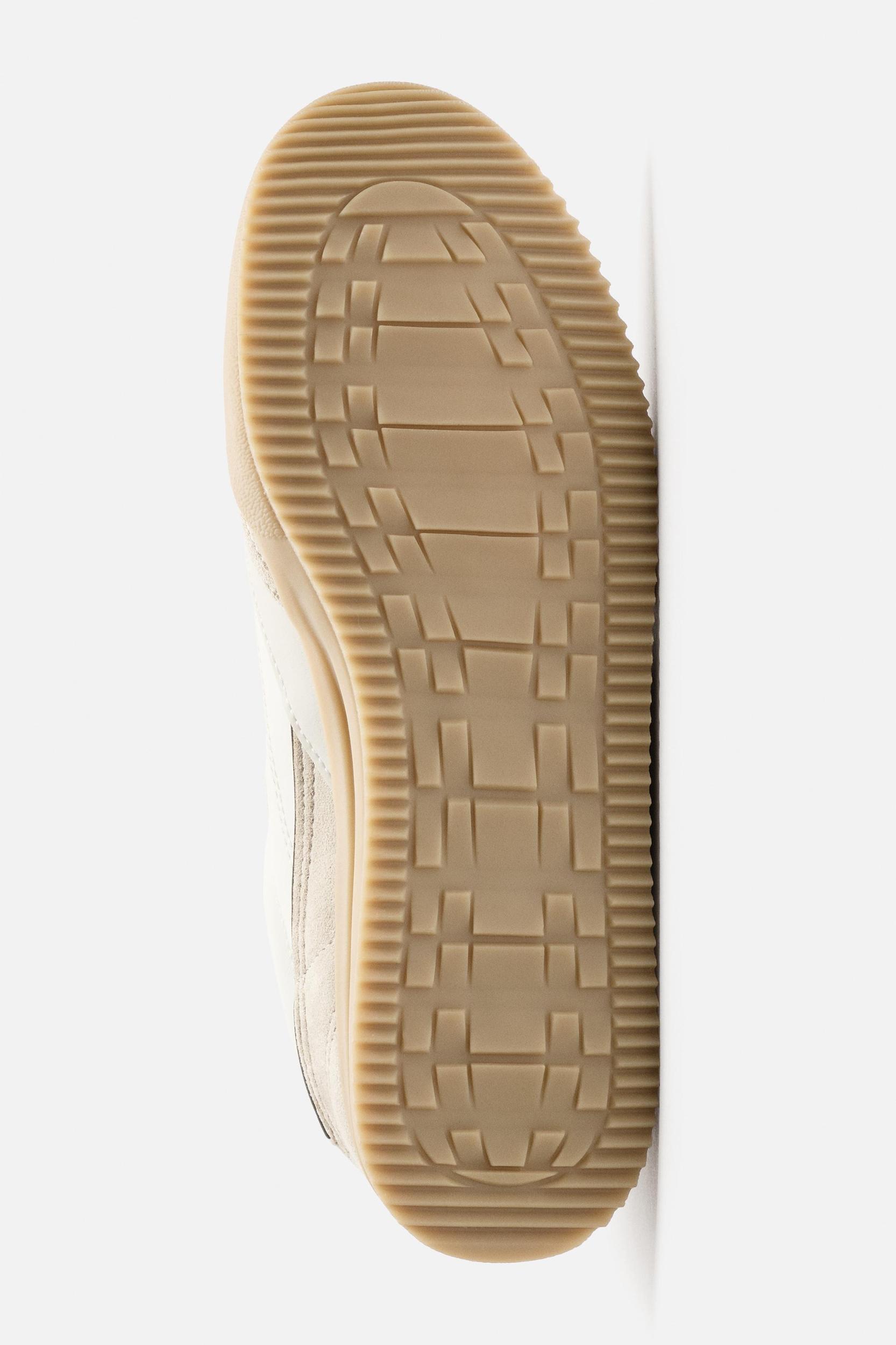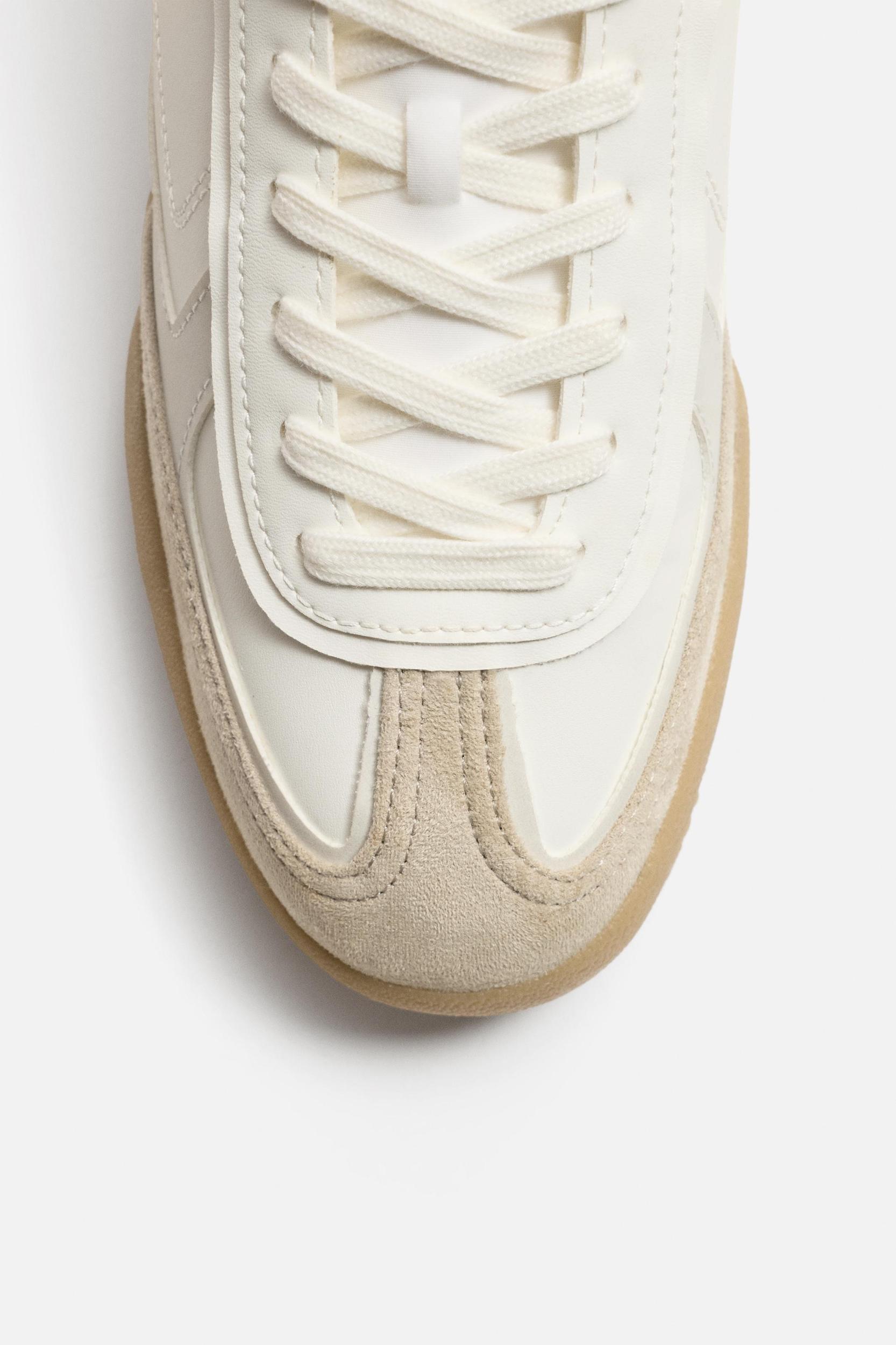 Retro-style sneakers. The upper combines pieces, materials, and colors. Contrasting colored sole.